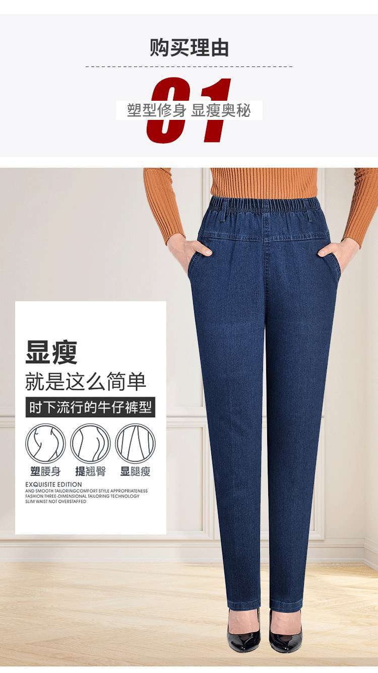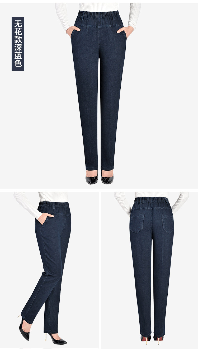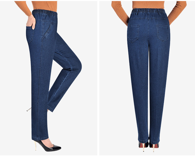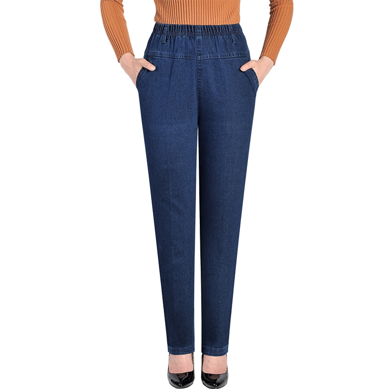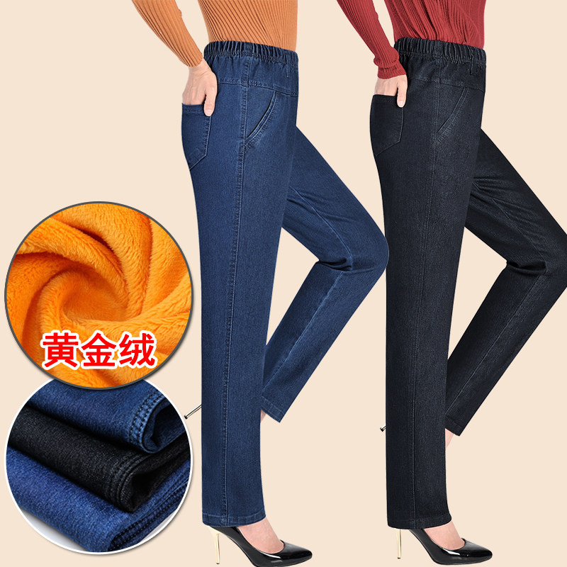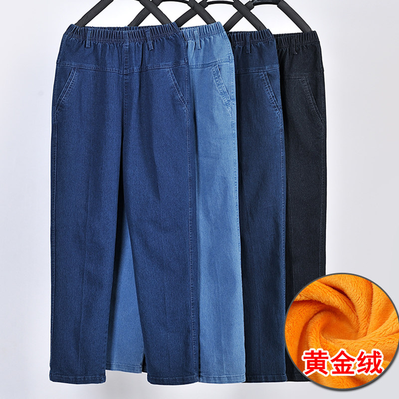 Утепленные джинсы, эластичные штаны, для среднего возраста, увеличенная толщина, высокая талия, большой размер, свободный прямой крой, эластичная талия
