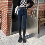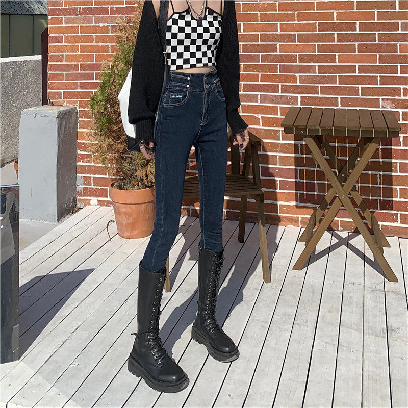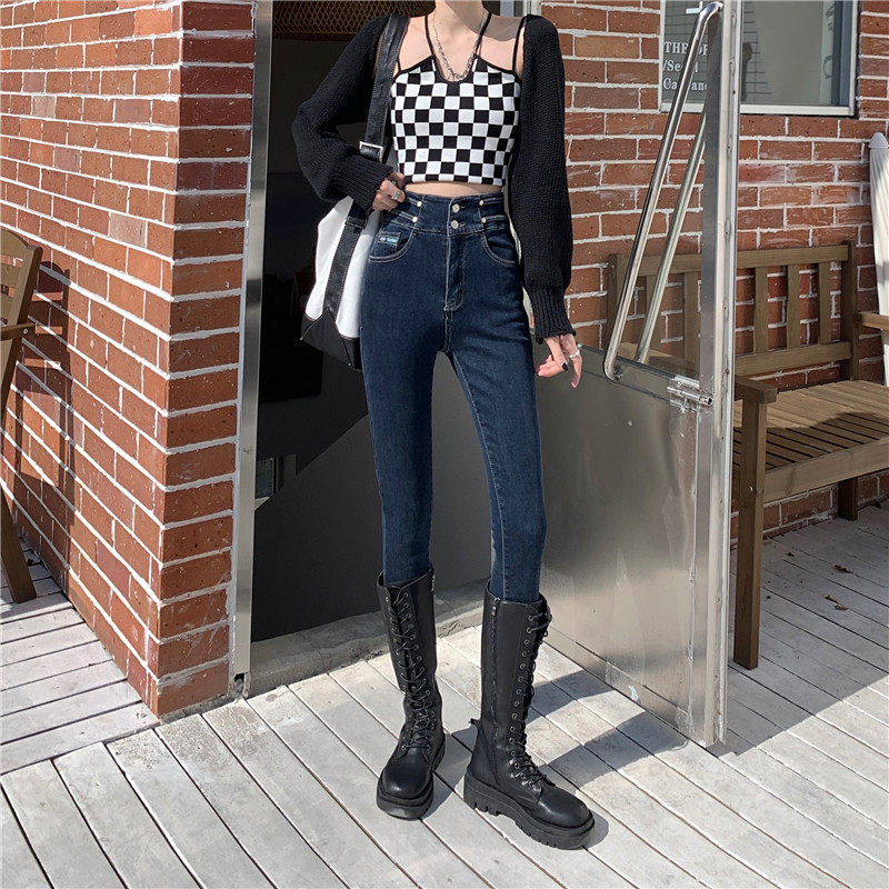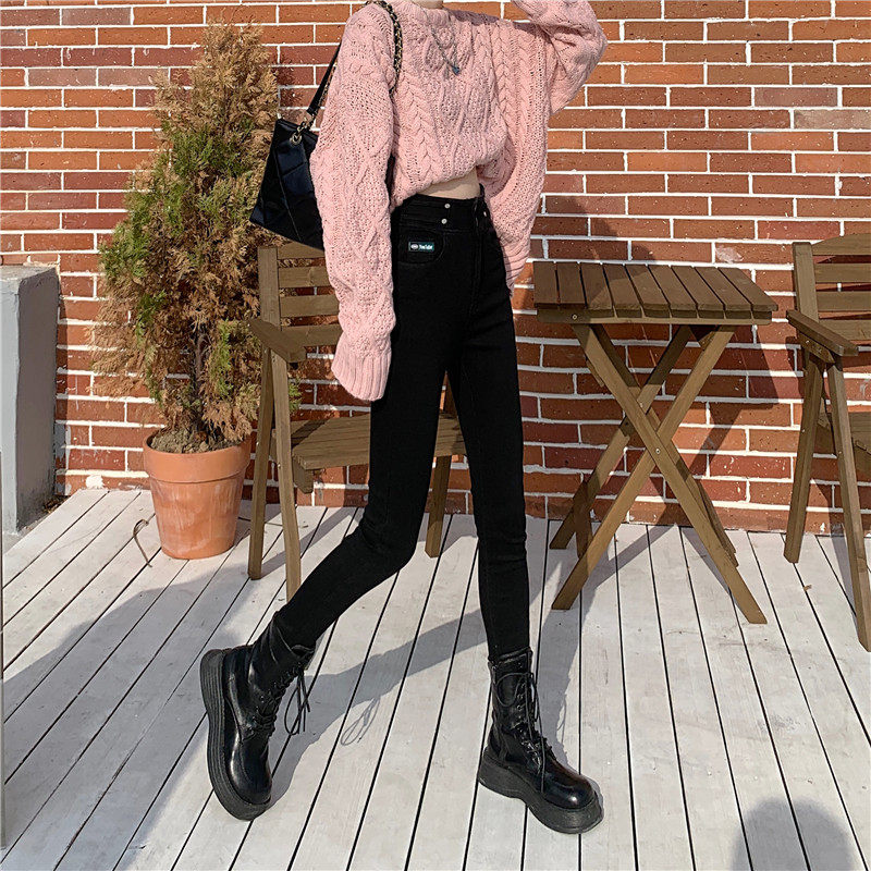 Карандаш, штаны, приталенные эластичные джинсы, в корейском стиле, высокая талия, облегающий крой