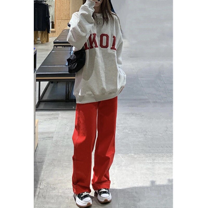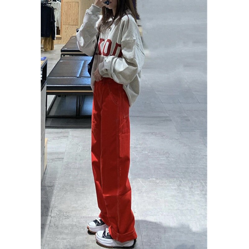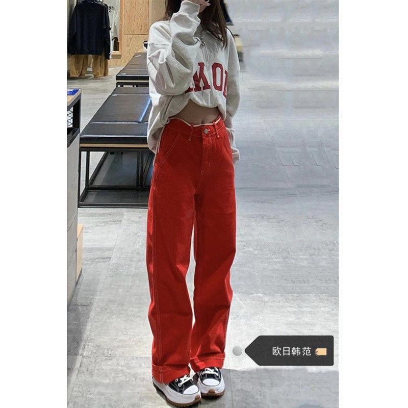 Красные джинсы, ретро приталенные штаны, большой размер, подходит для полных девушек, коллекция 2023, в американском стиле, свободный прямой крой