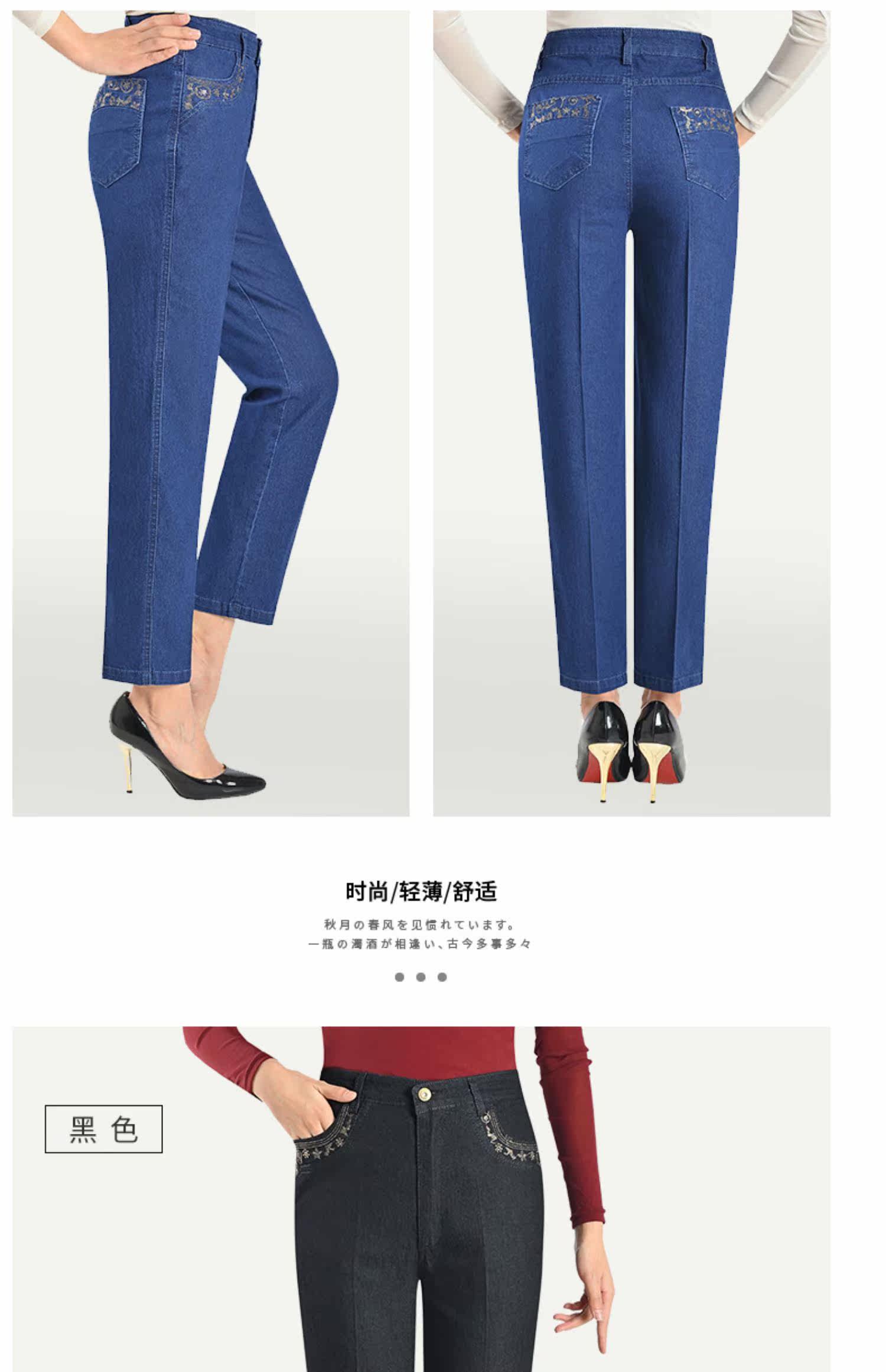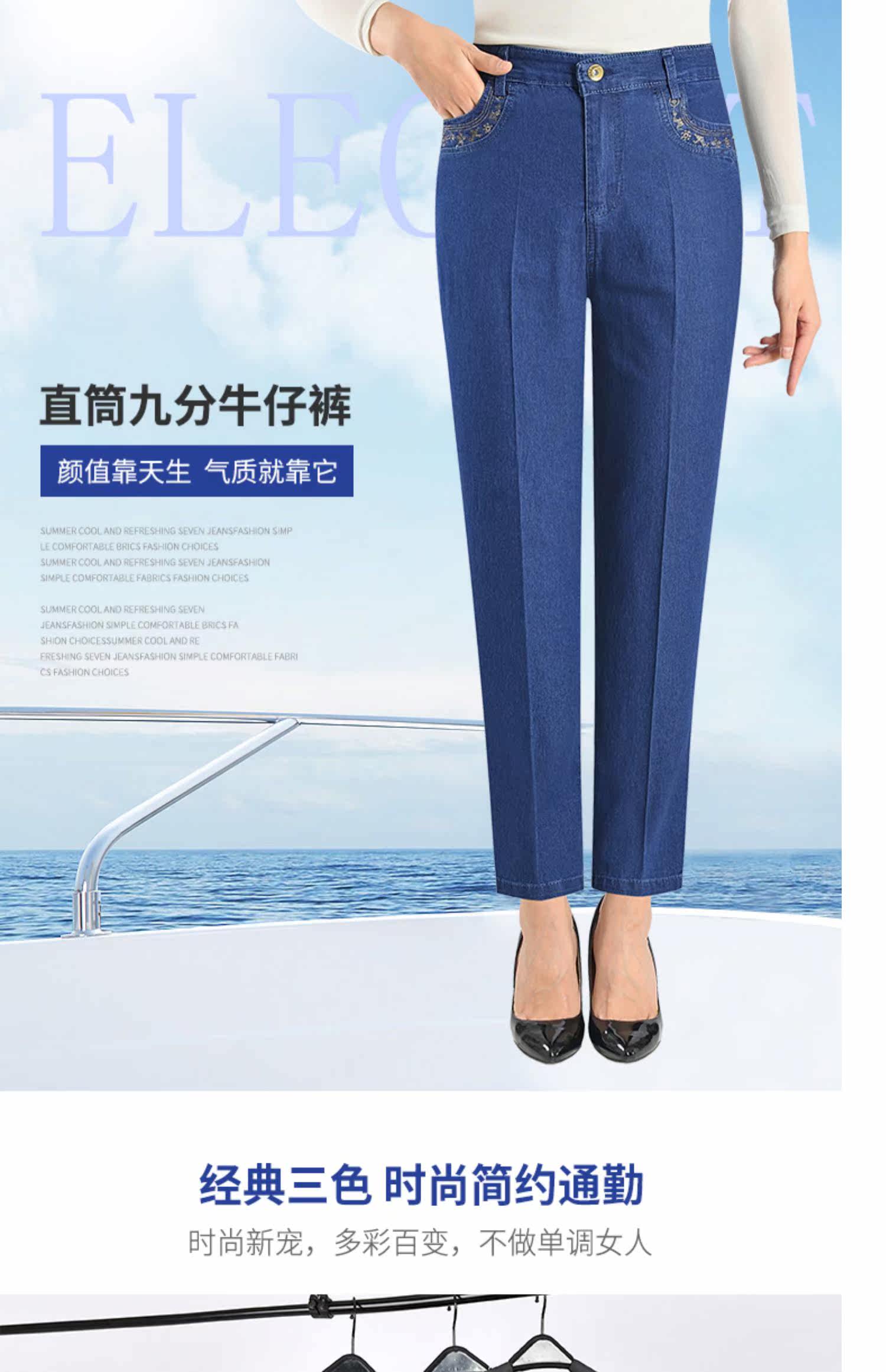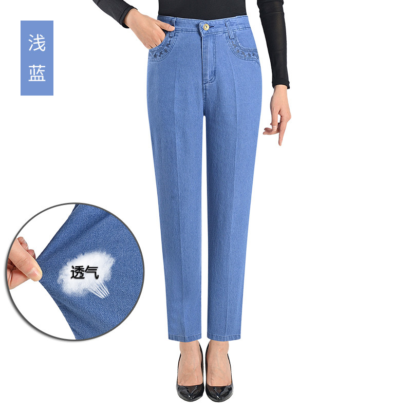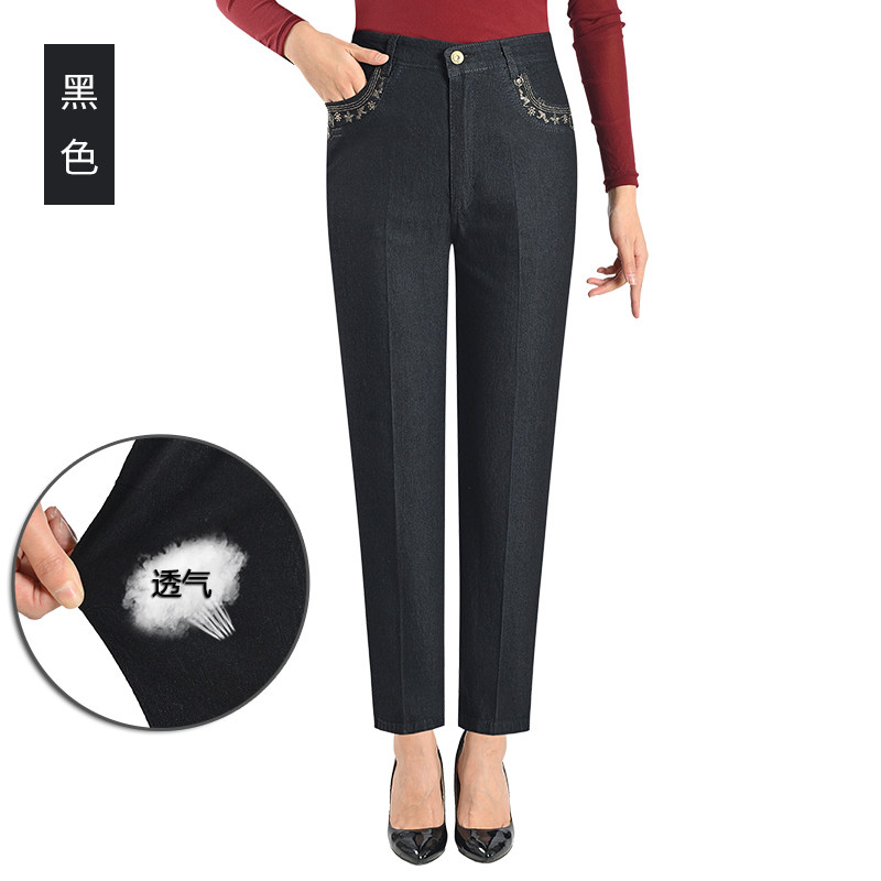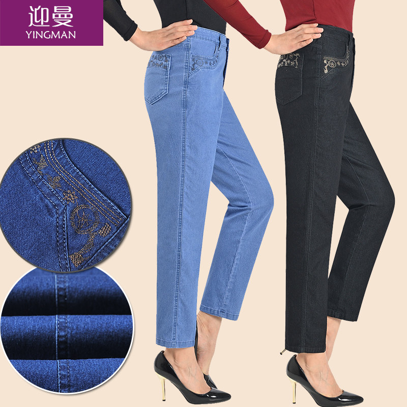 Весенние эластичные тонкие штаны, джинсы, свободный прямой крой, для среднего возраста, высокая талия