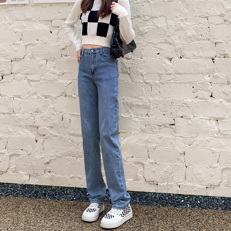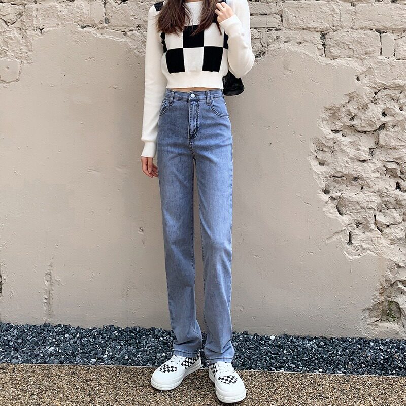 Синие осенние прямые свободные джинсы, штаны, приталенные длинные леггинсы, оверсайз, высокая талия