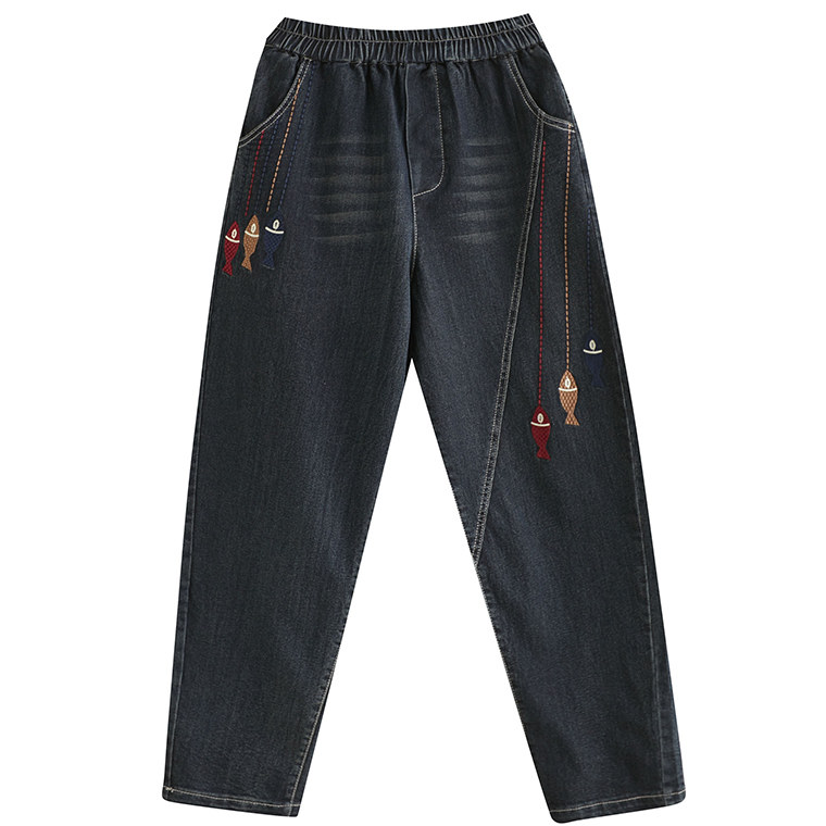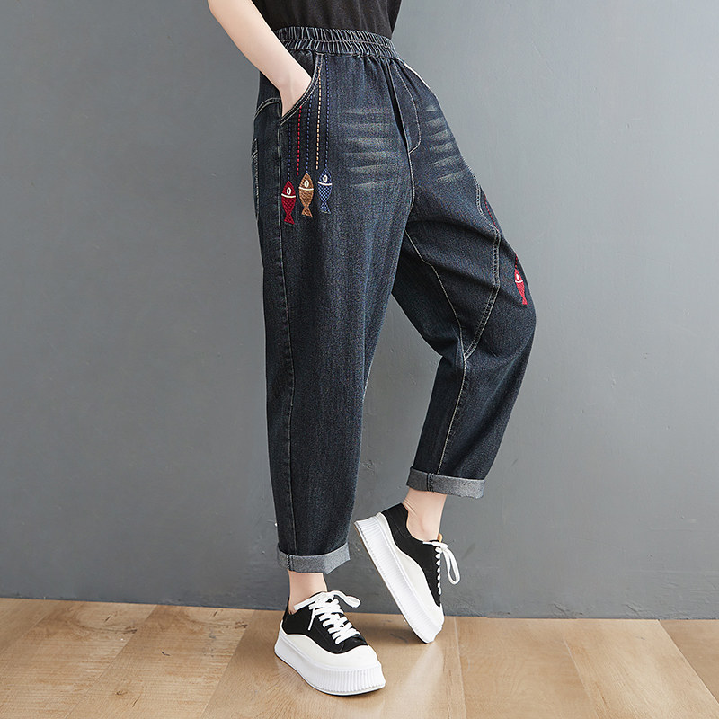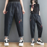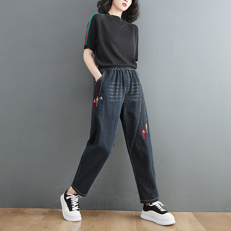 Летние джинсы, штаны, с вышивкой, оверсайз, эластичная талия