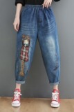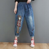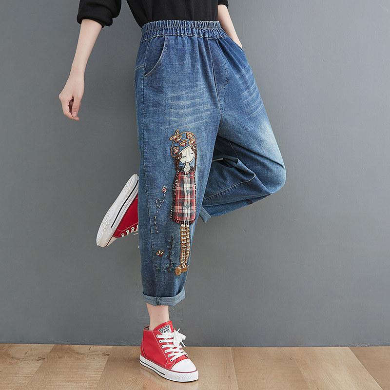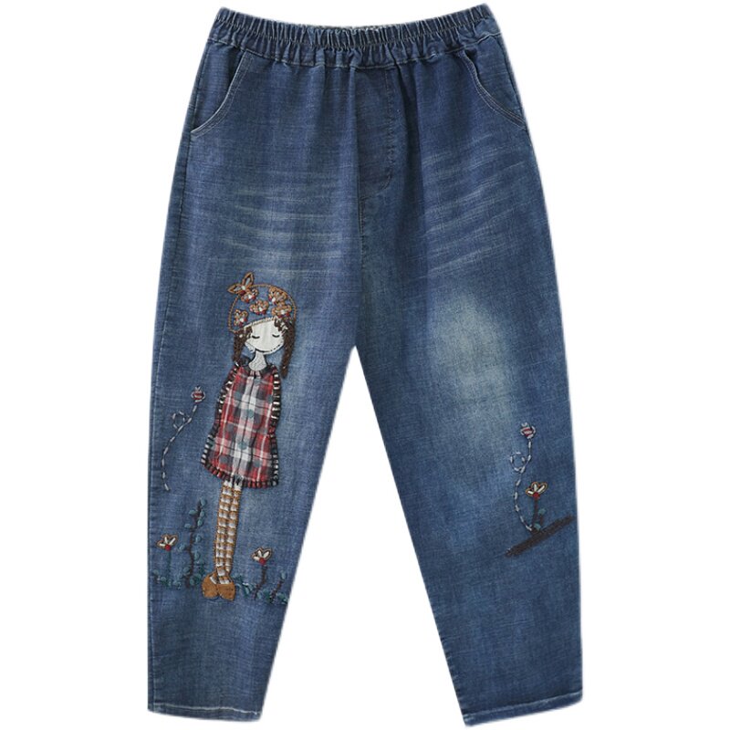 Летние мультяшные джинсы, универсальные штаны, большой размер, с вышивкой, эластичная талия