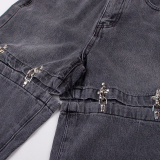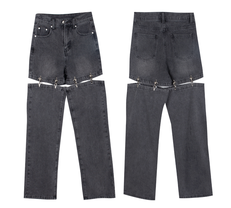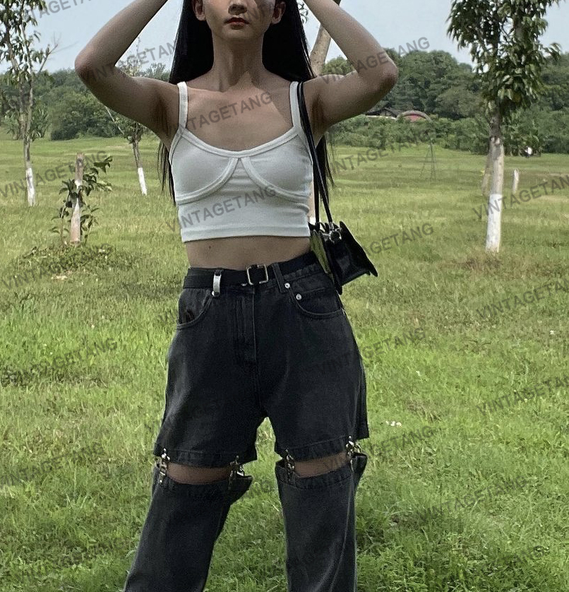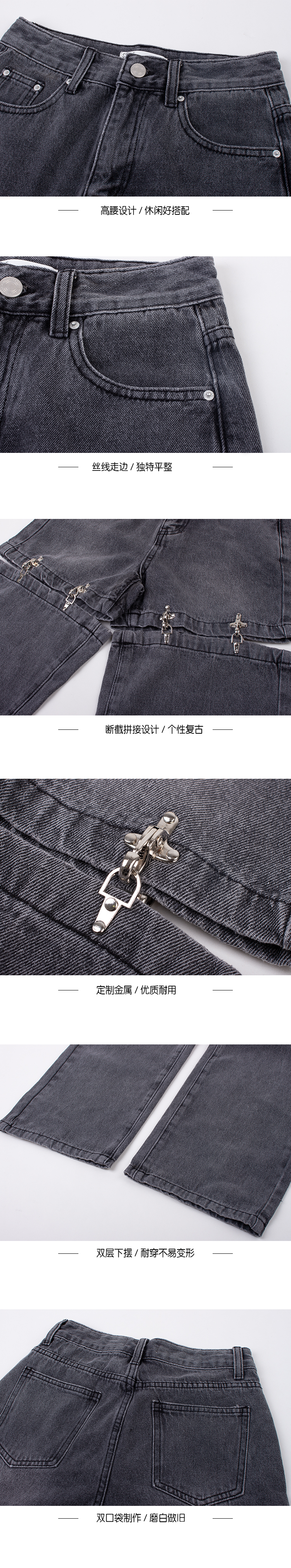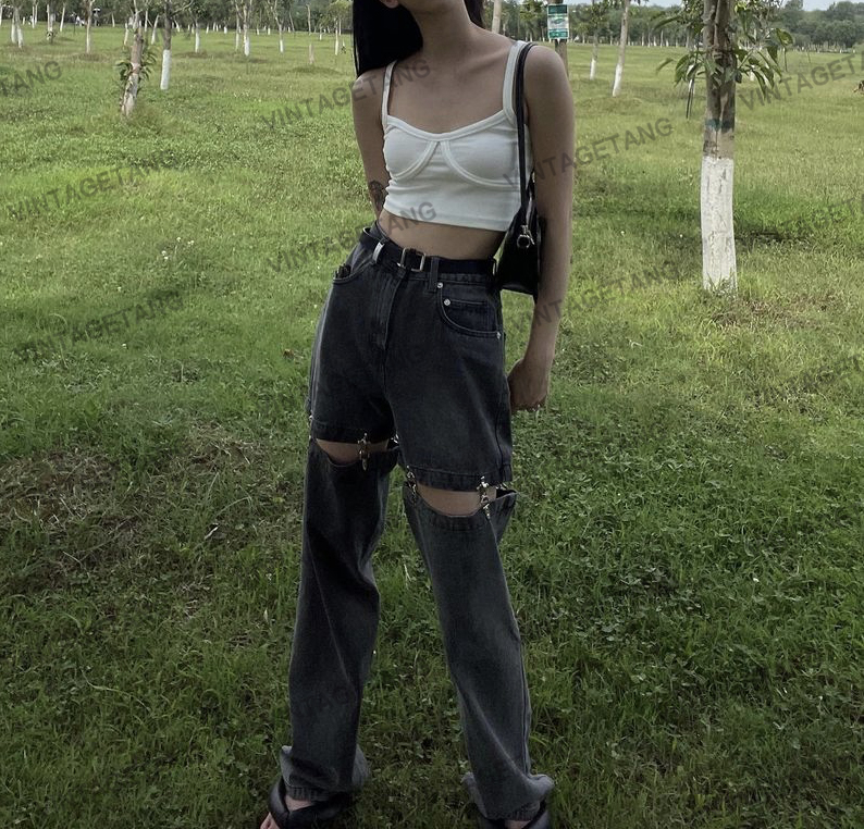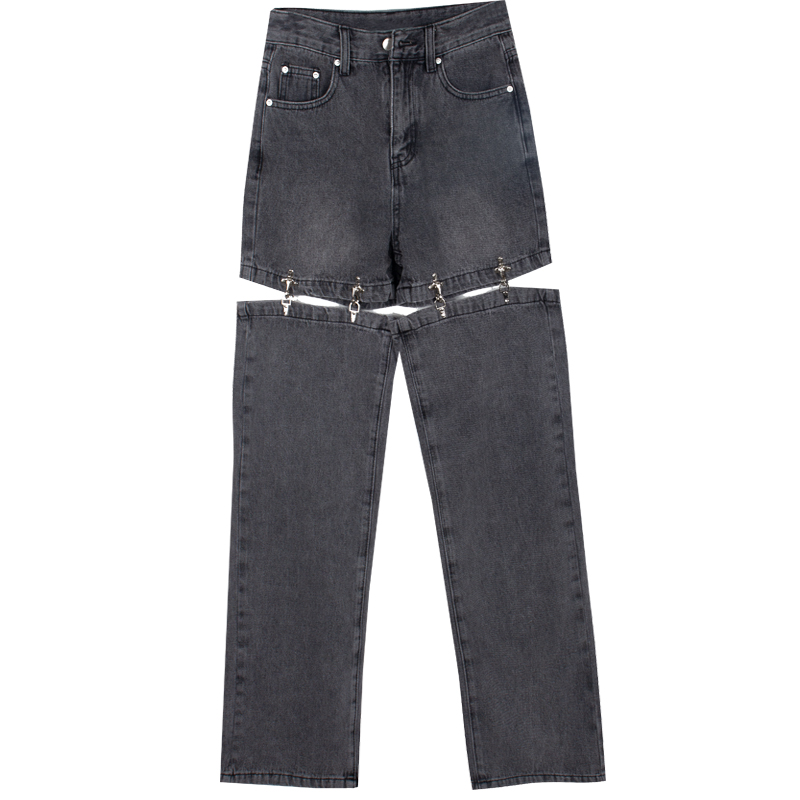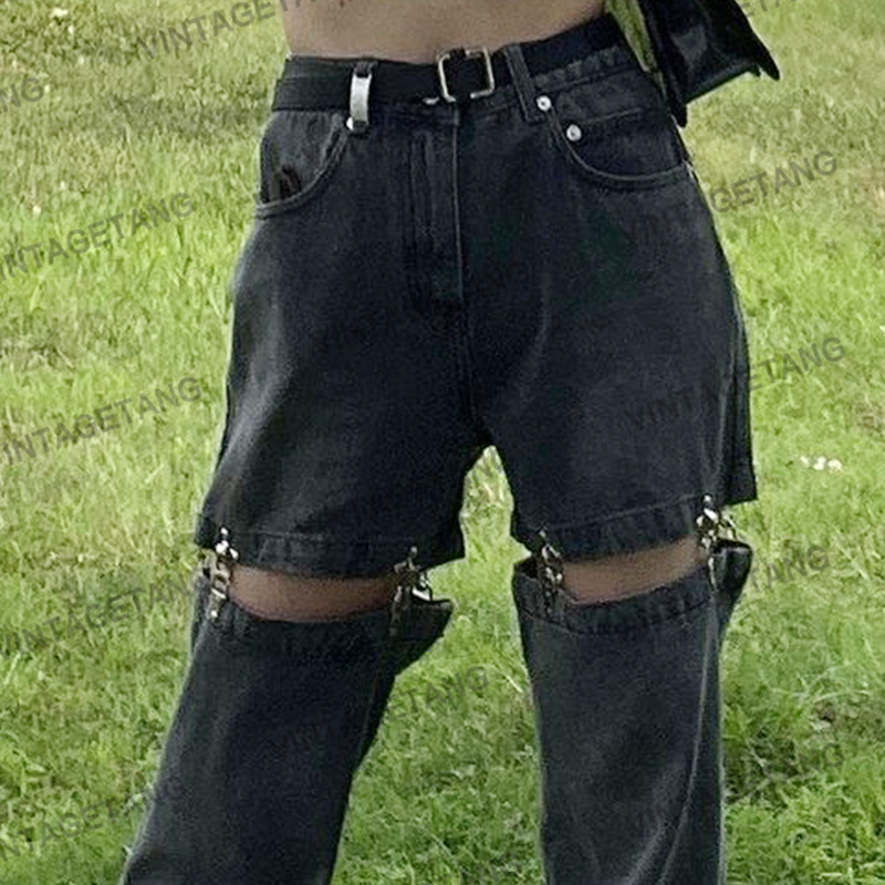 Винтагетанг Европейская и американская металлическая пряжка улица свободен две джинсы в джинсовых штанах Женские прямые штаны