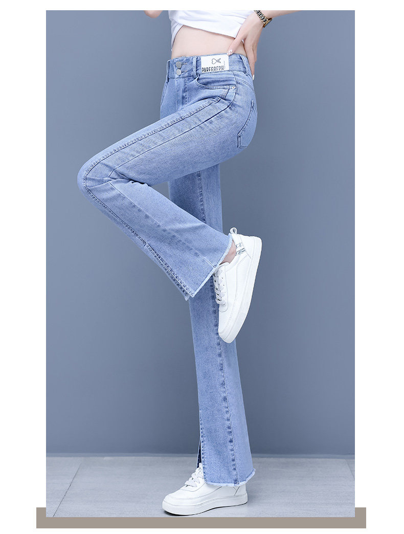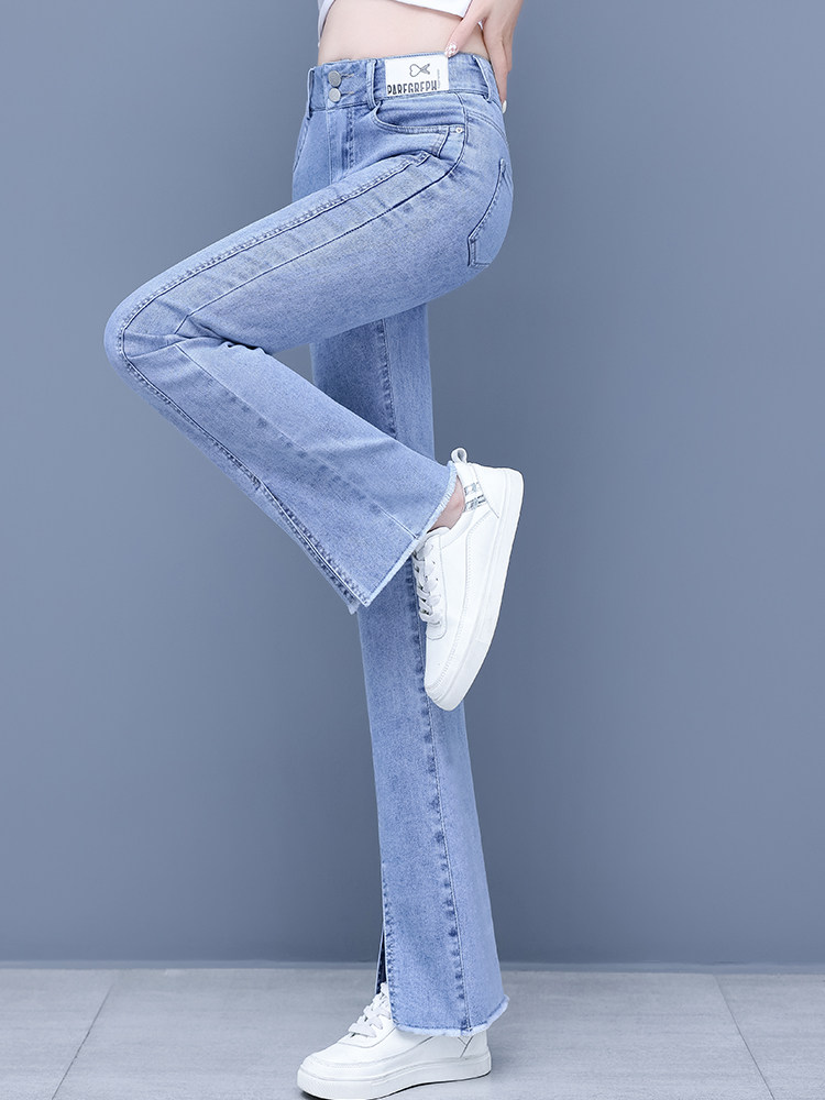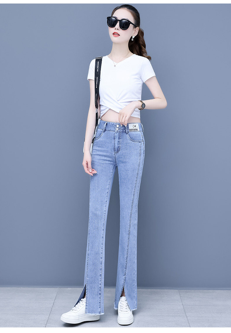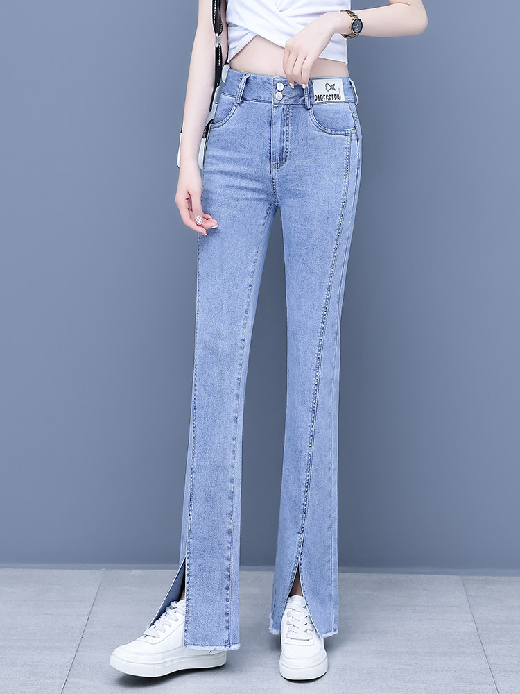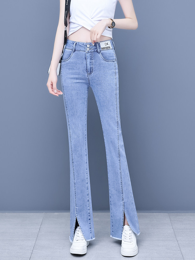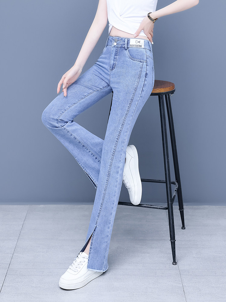 Джинсы, приталенные летние штаны, штаны-клёш, высокая талия, в корейском стиле, свободный прямой крой