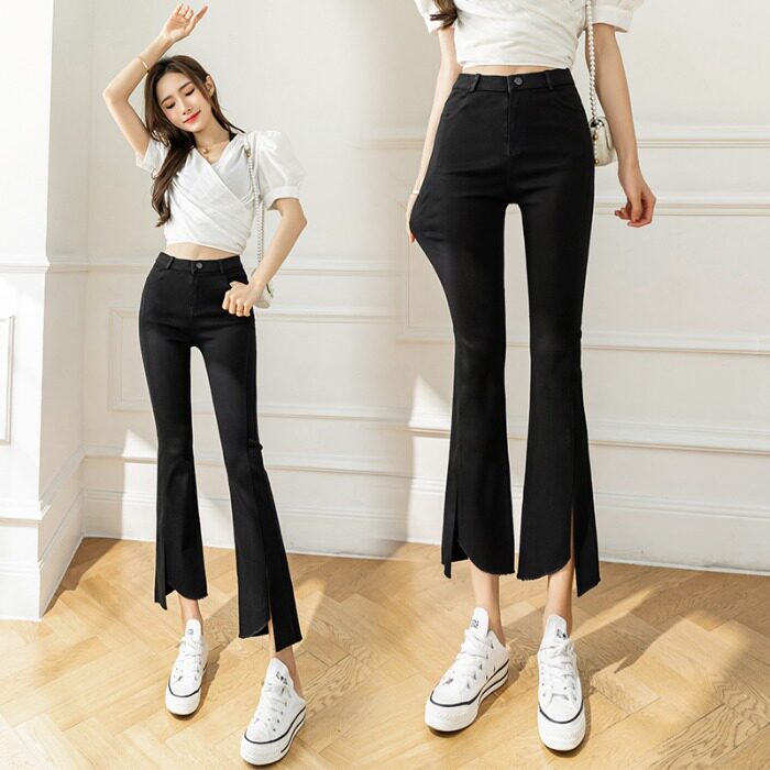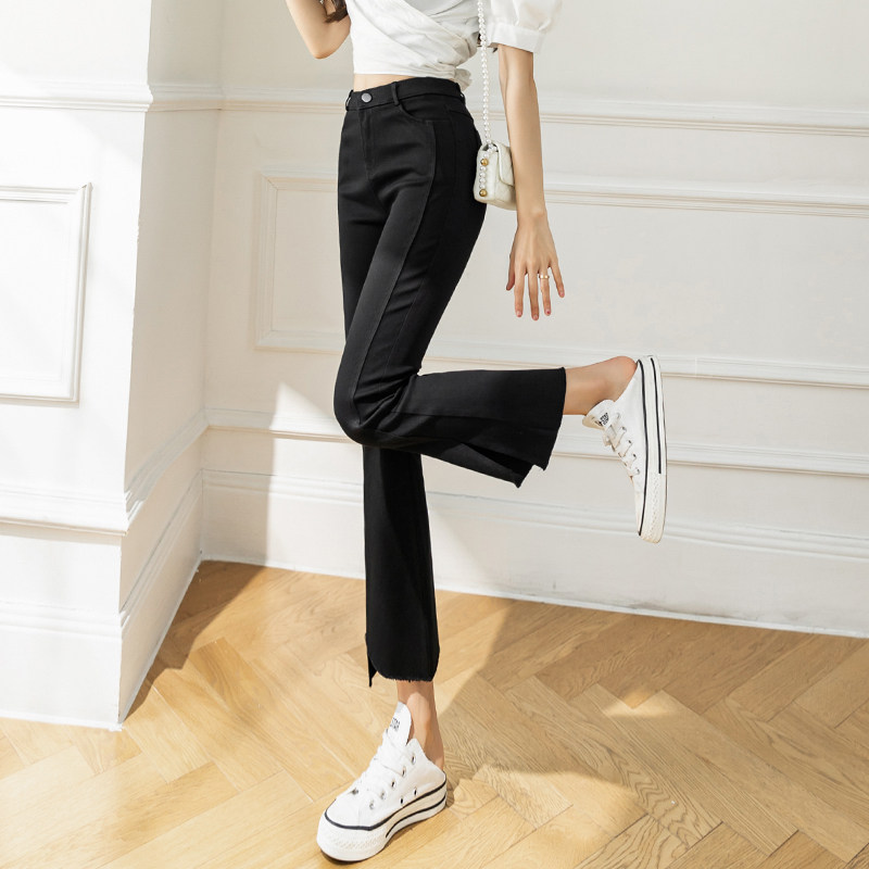 Летние черные штаны, приталенные джинсовые эластичные штаны-клёш, высокая талия