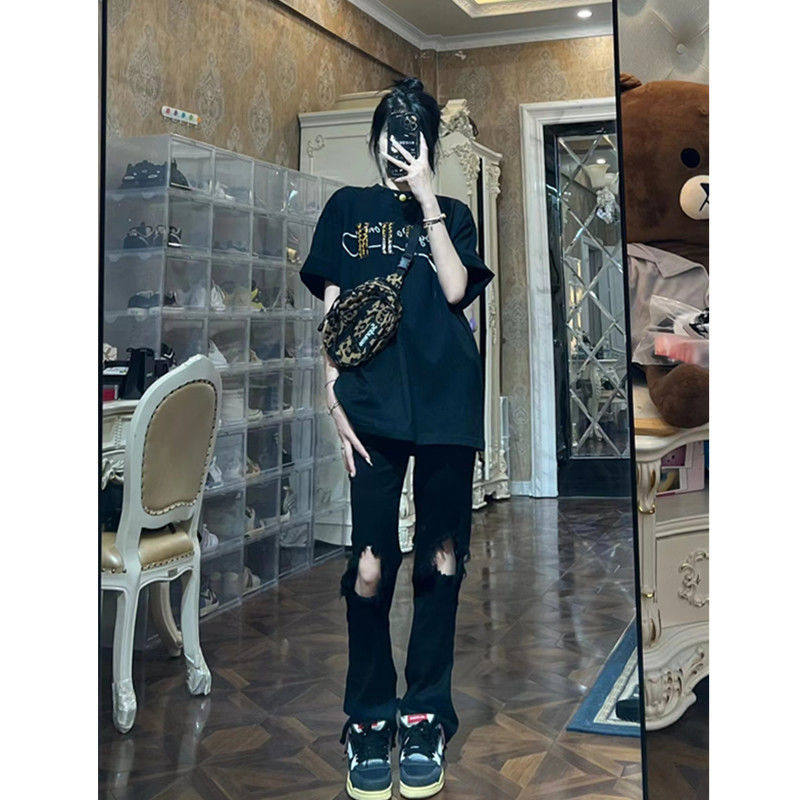 Летние тонкие прямые свободные джинсы, эластичные штаны для отдыха, штаны-клёш, в американском стиле