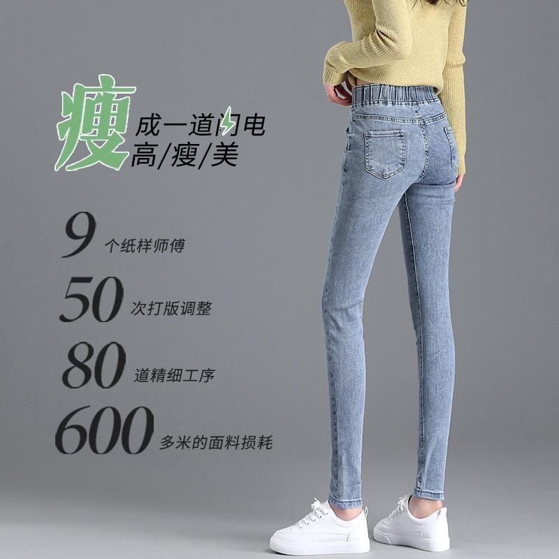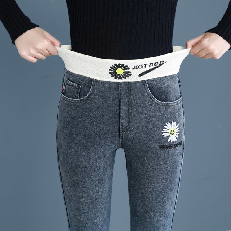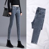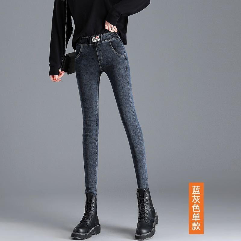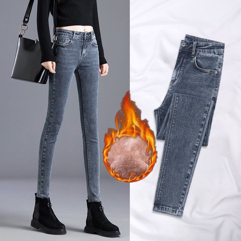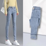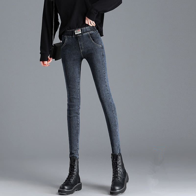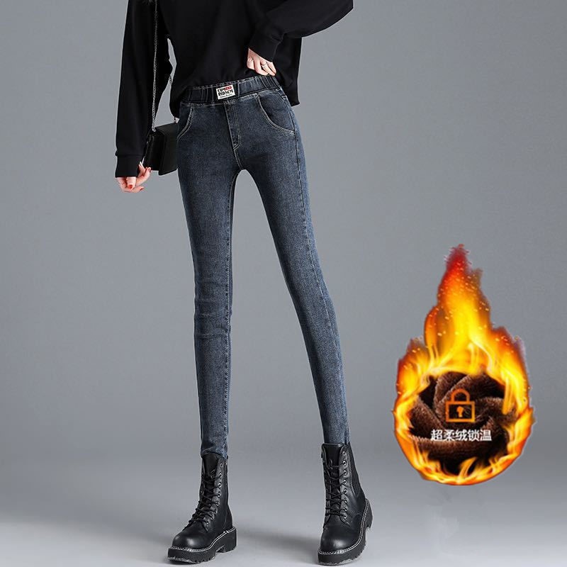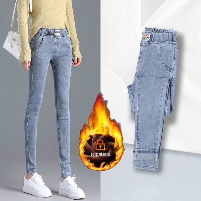 Демисезонные флисовые джинсы с начесом, приталенные штаны, универсальный карандаш, эластичная талия, в корейском стиле, высокая талия