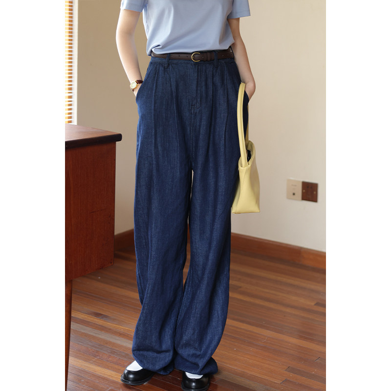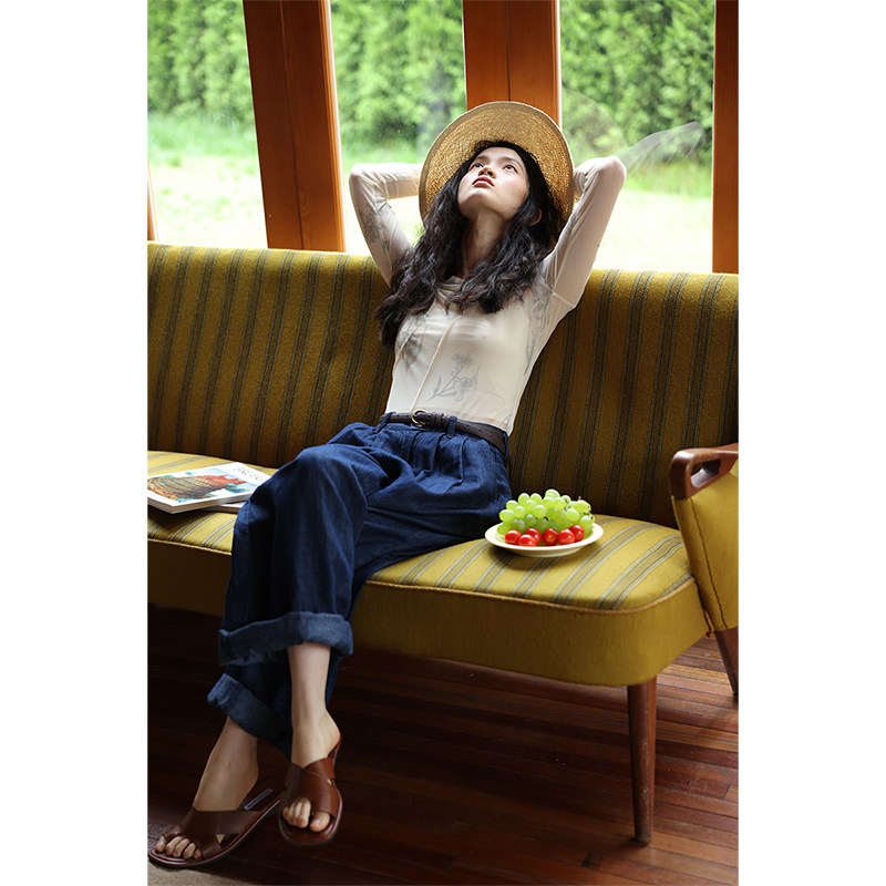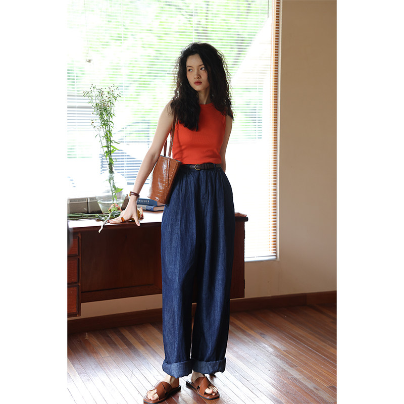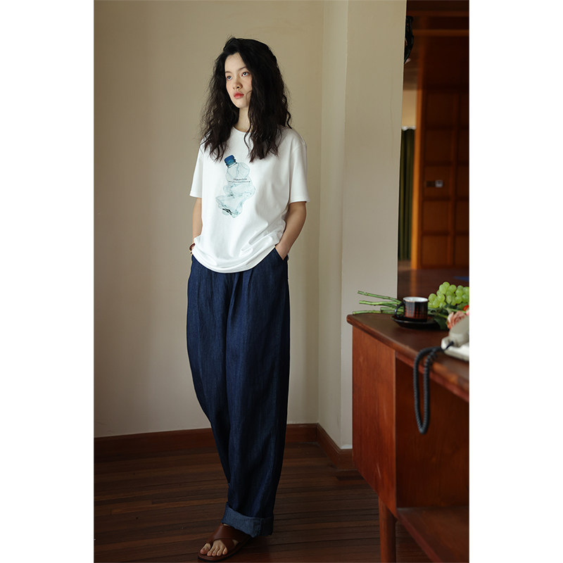 鹿与飞鸟 Джинсовые джинсы, из хлопка и льна, высокая талия