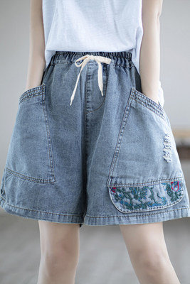 Джинсовая юбка, шорты, ретро тонкие штаны, по фигуре, свободный крой, с вышивкой, эластичная талия