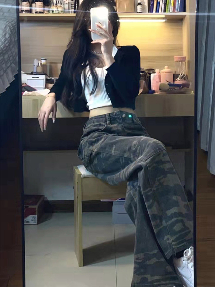 Tide, ретро камуфляжные осенние джинсы, штаны, в американском стиле, высокая талия, свободный прямой крой