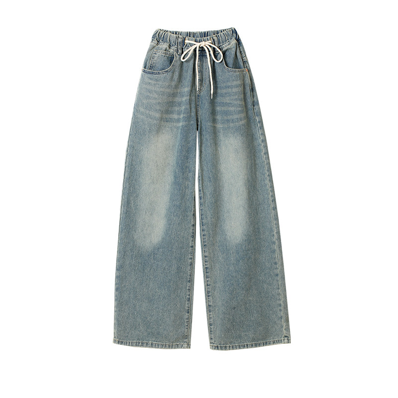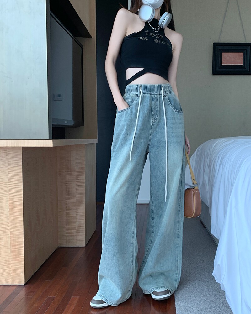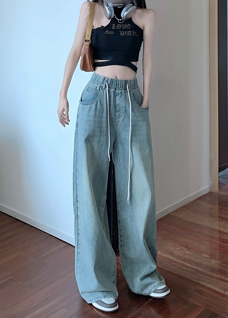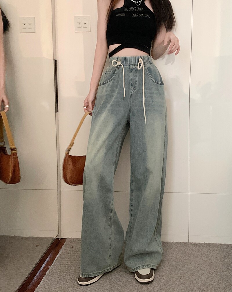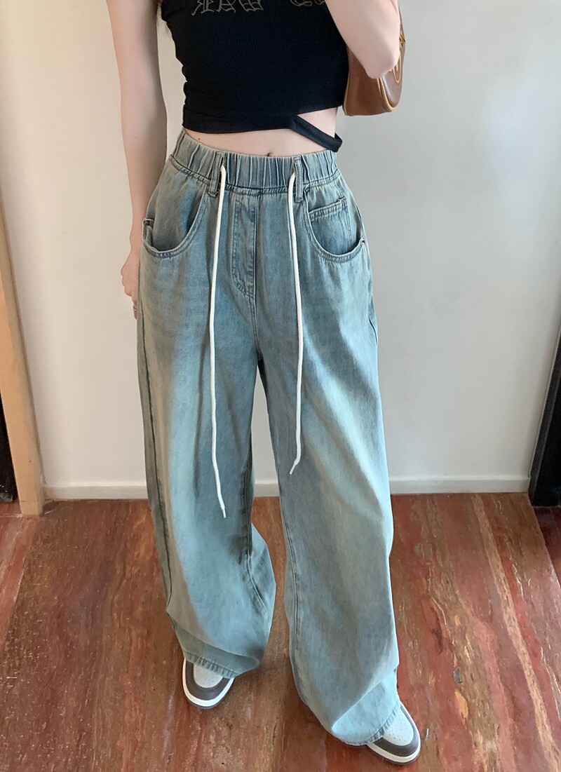 Большие штаны, приталенные джинсы, на шнурках, эластичная талия, высокая талия, свободный крой