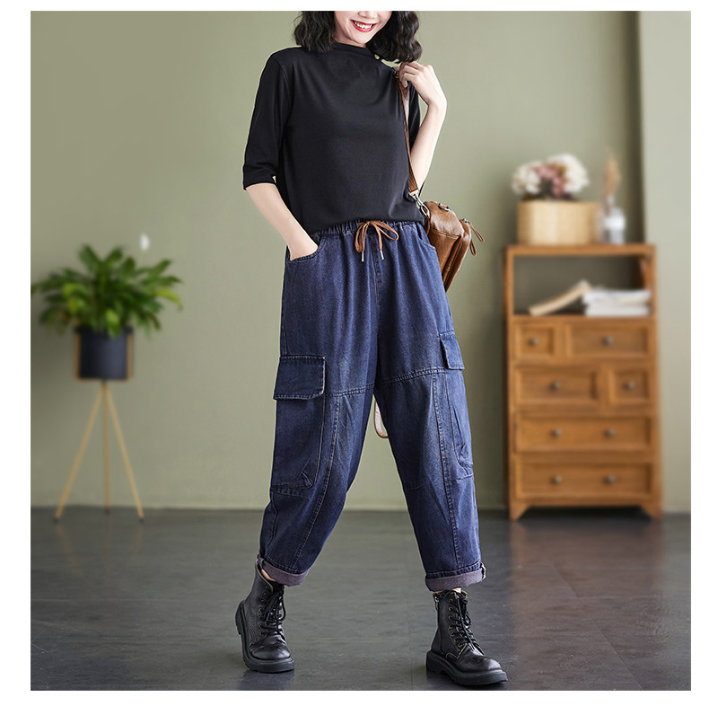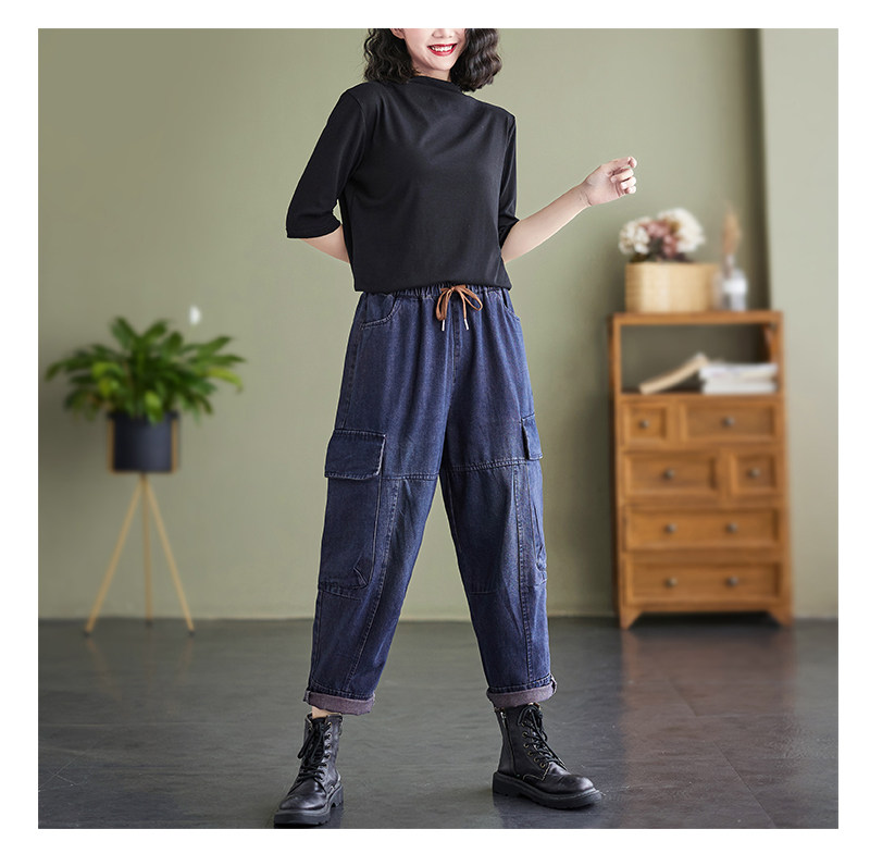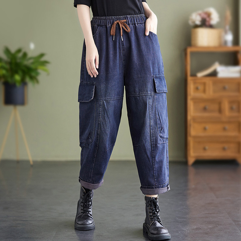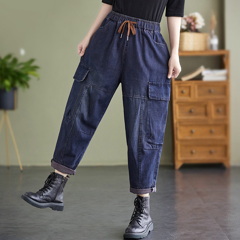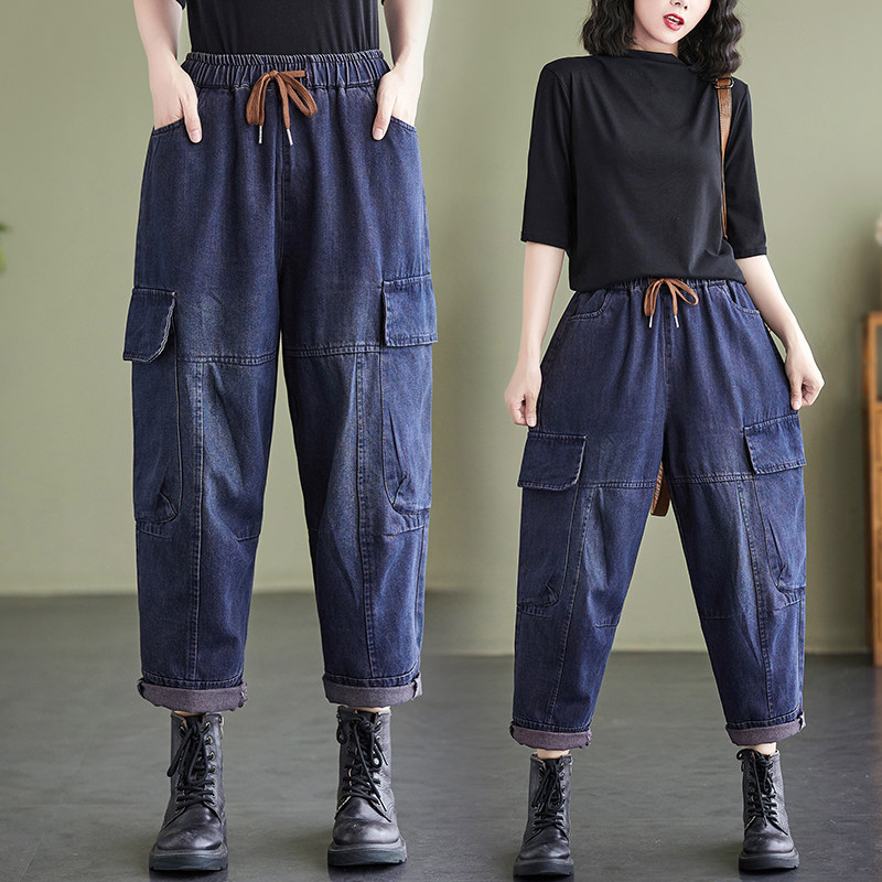 Ретро джинсы, осенние штаны, большой размер, высокая талия, на шнурках