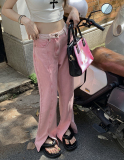 Розовые осенние джинсы, весенние штаны, большой размер, высокая талия, подходит для подростков, свободный прямой крой