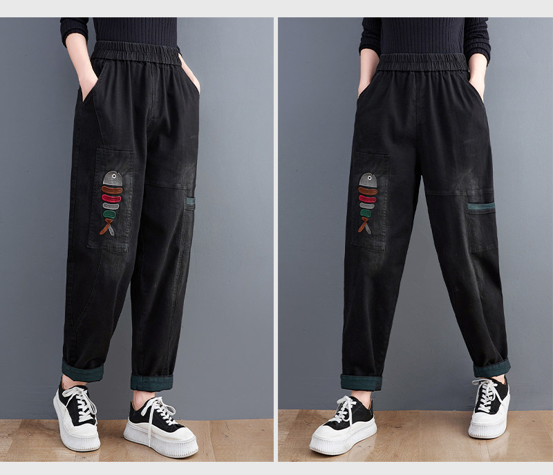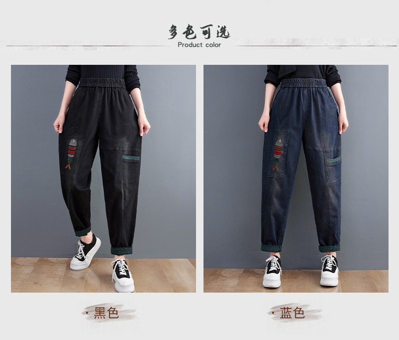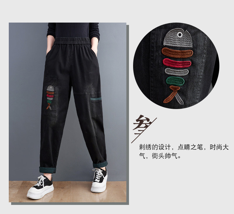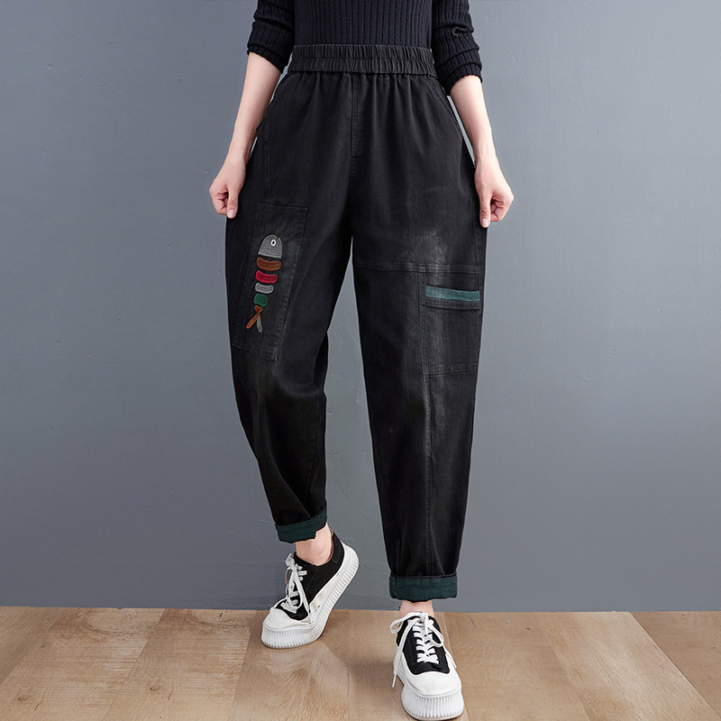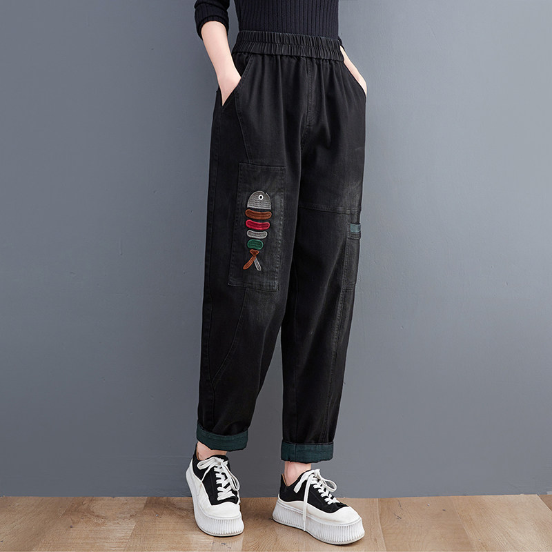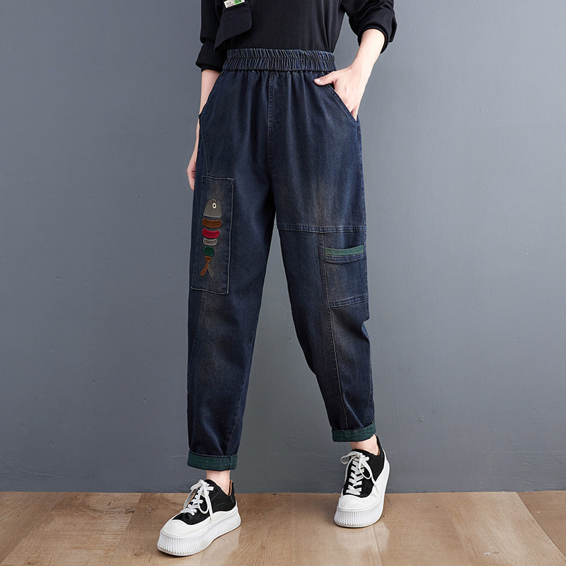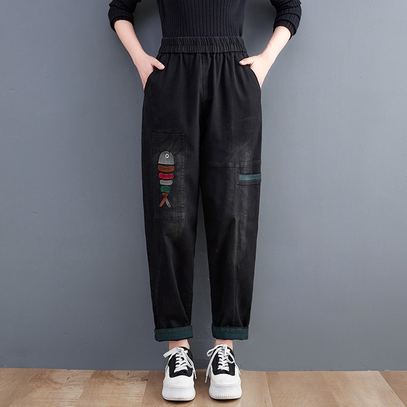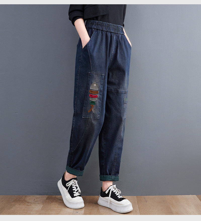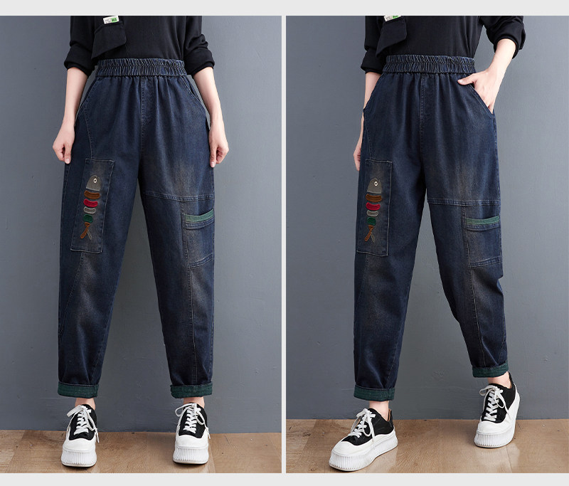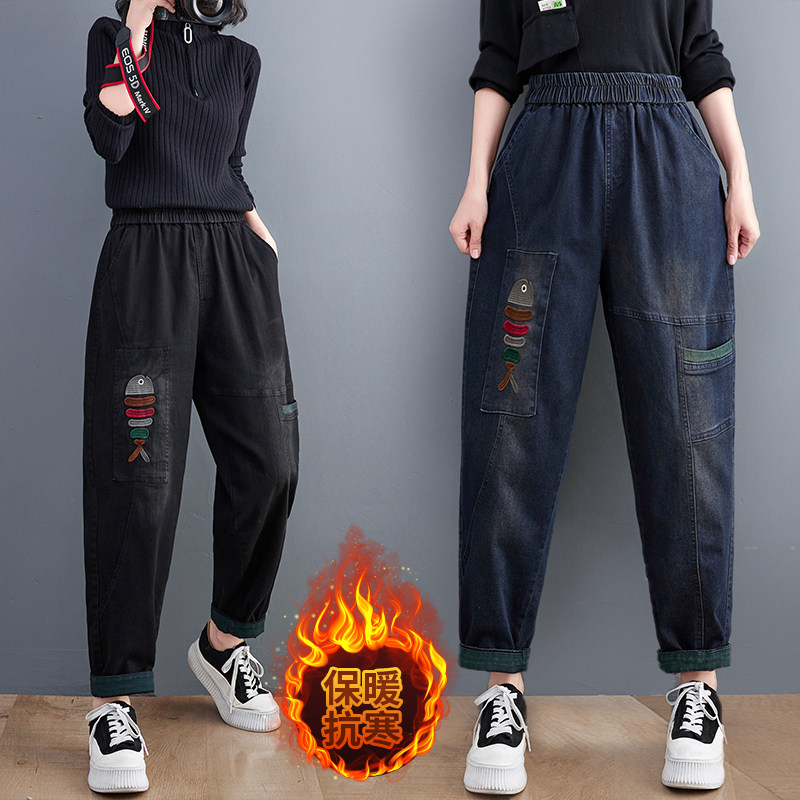 Демисезонные утепленные джинсы-шаровары, большой размер, с вышивкой
