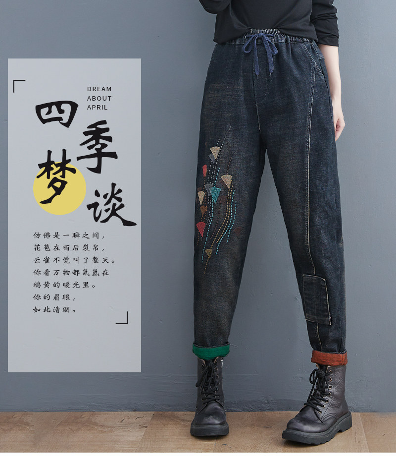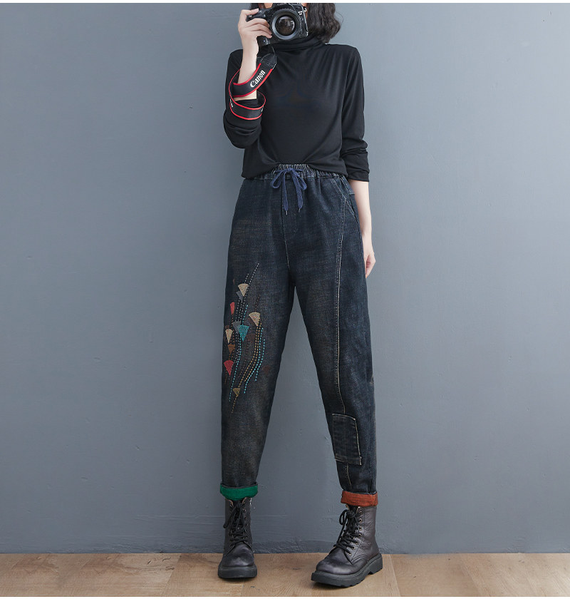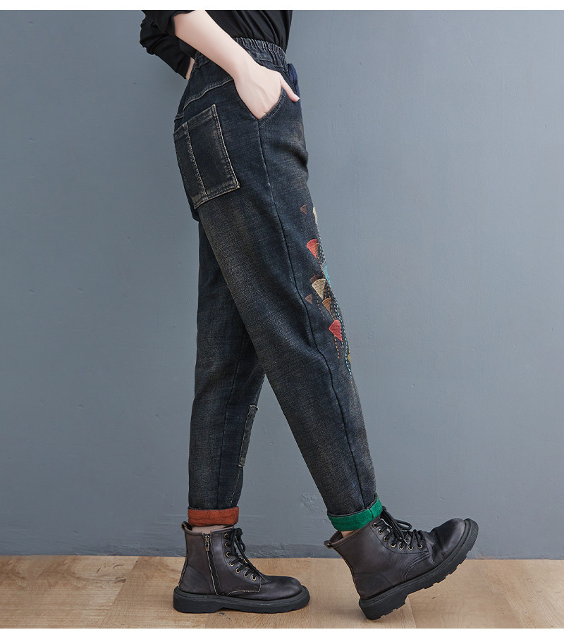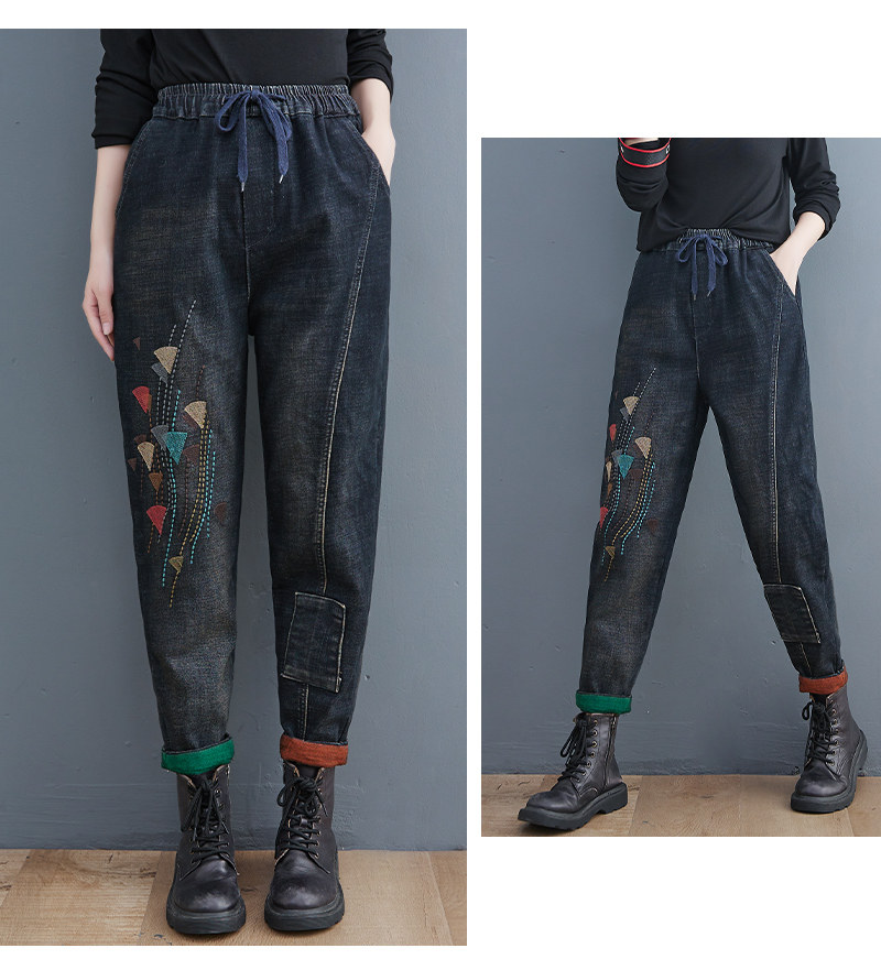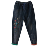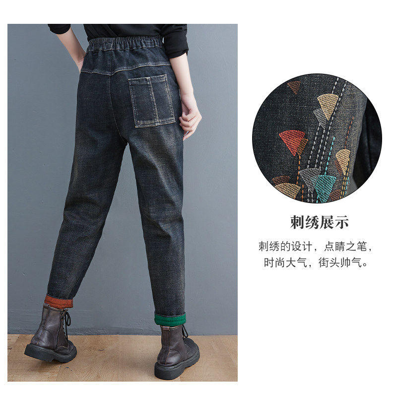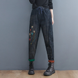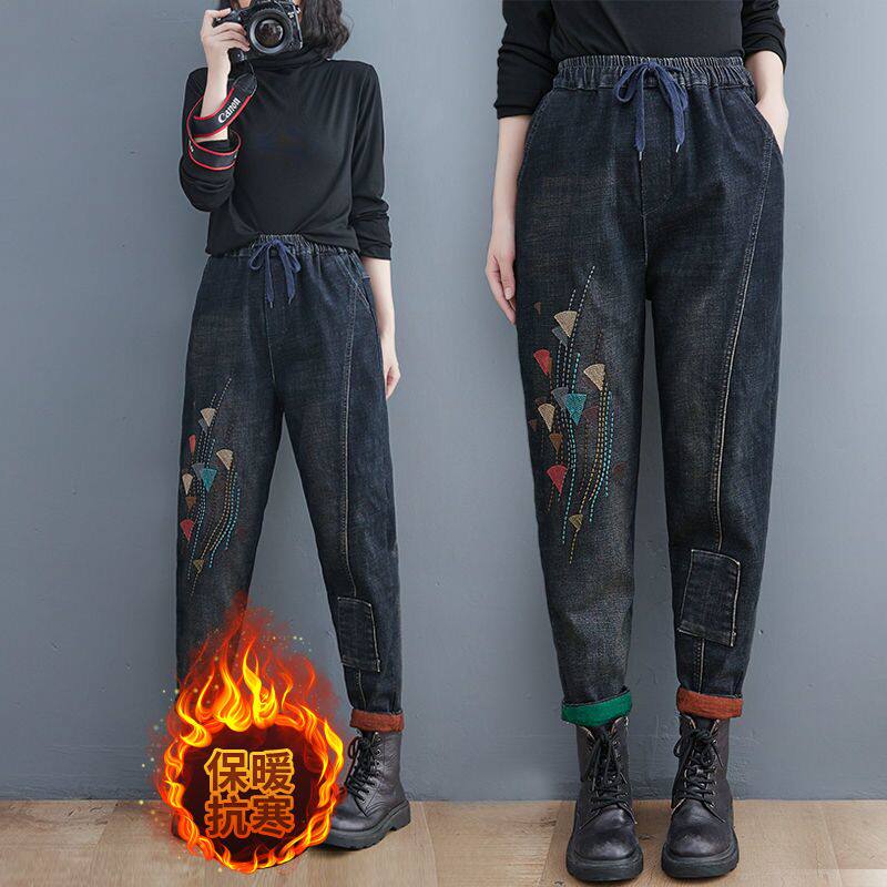 Утепленные штаны, демисезонные джинсы, леггинсы, с вышивкой, эластичная талия, высокая талия, свободный крой
