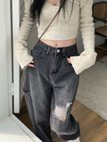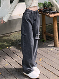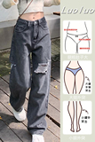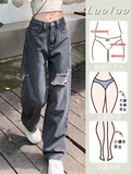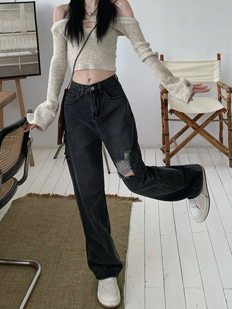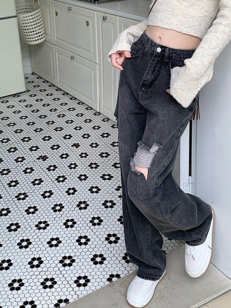 Джинсы, осенние штаны, для формы тела «груша», свободный прямой крой, высокая талия, большой размер