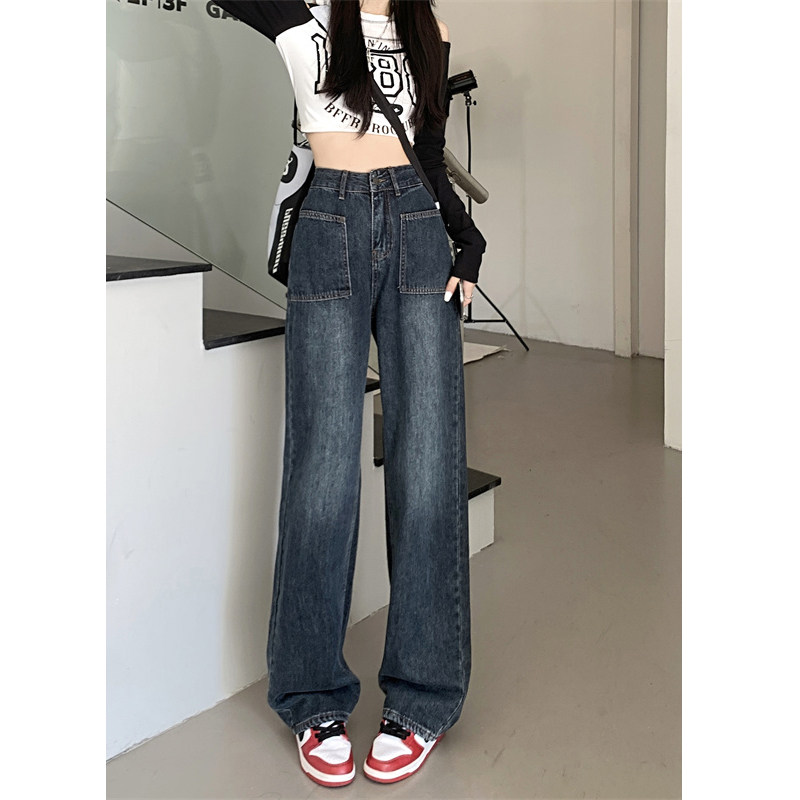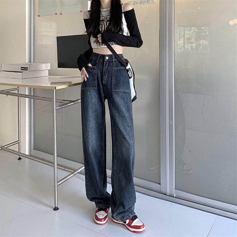 Темно-синие весенние джинсы, штаны, в корейском стиле, высокая талия, по фигуре, подходят для подростков, свободный прямой крой
