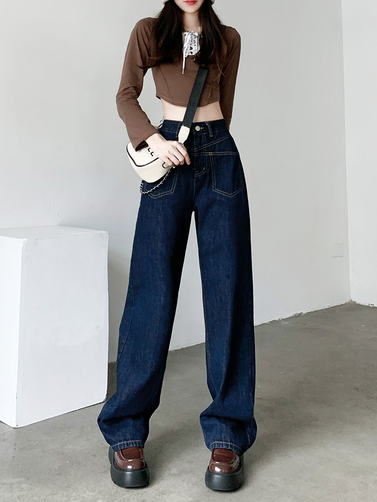 Темно-синие штаны, демисезонные джинсы, приталенные длинные леггинсы, коллекция 2023, высокая талия, свободный прямой крой