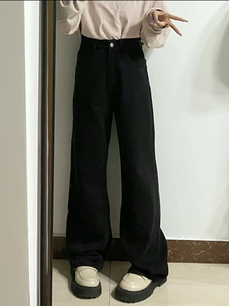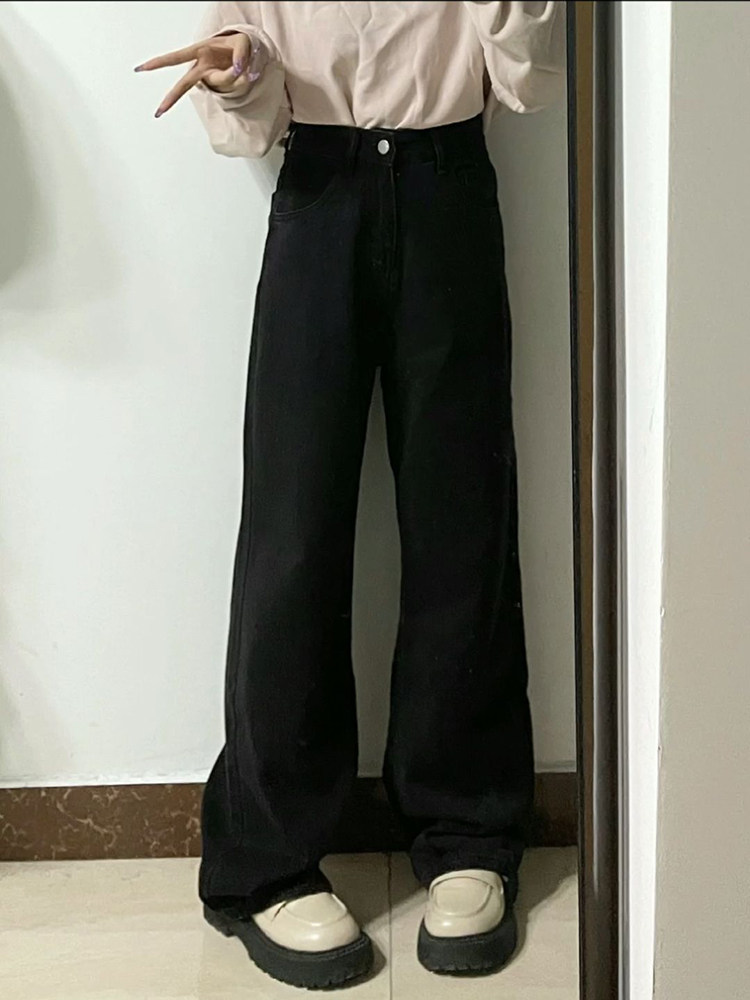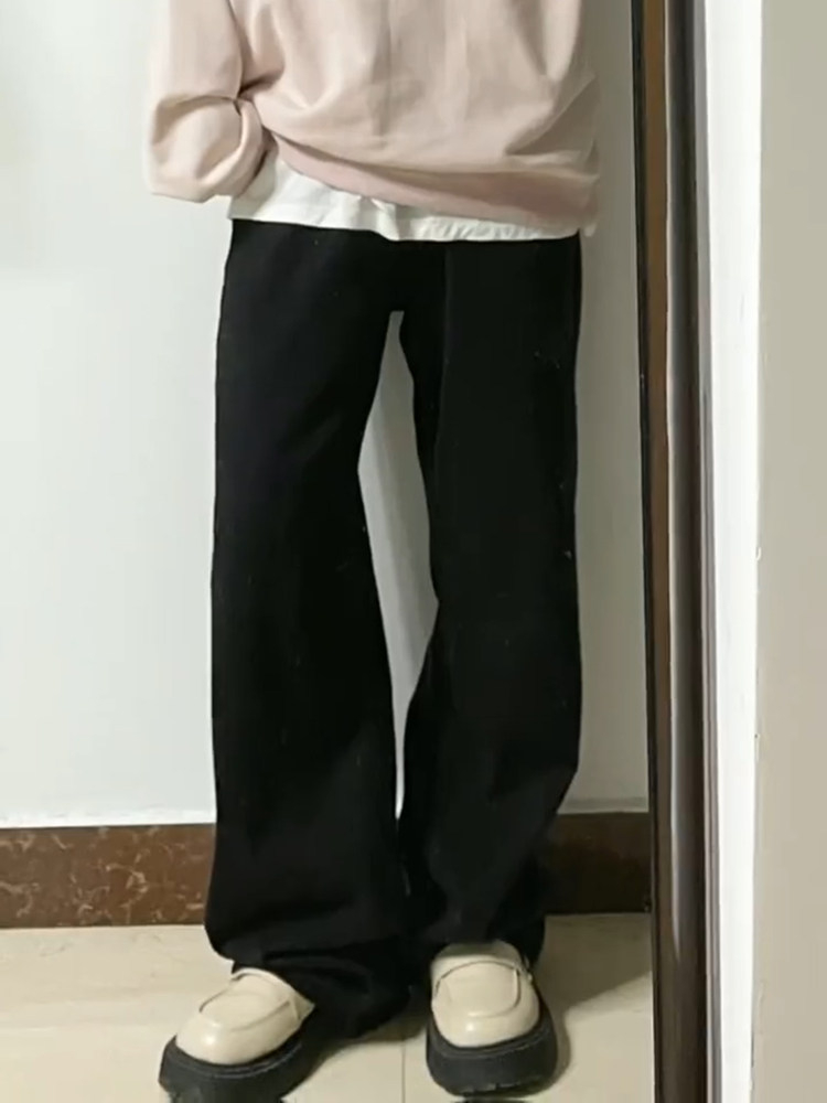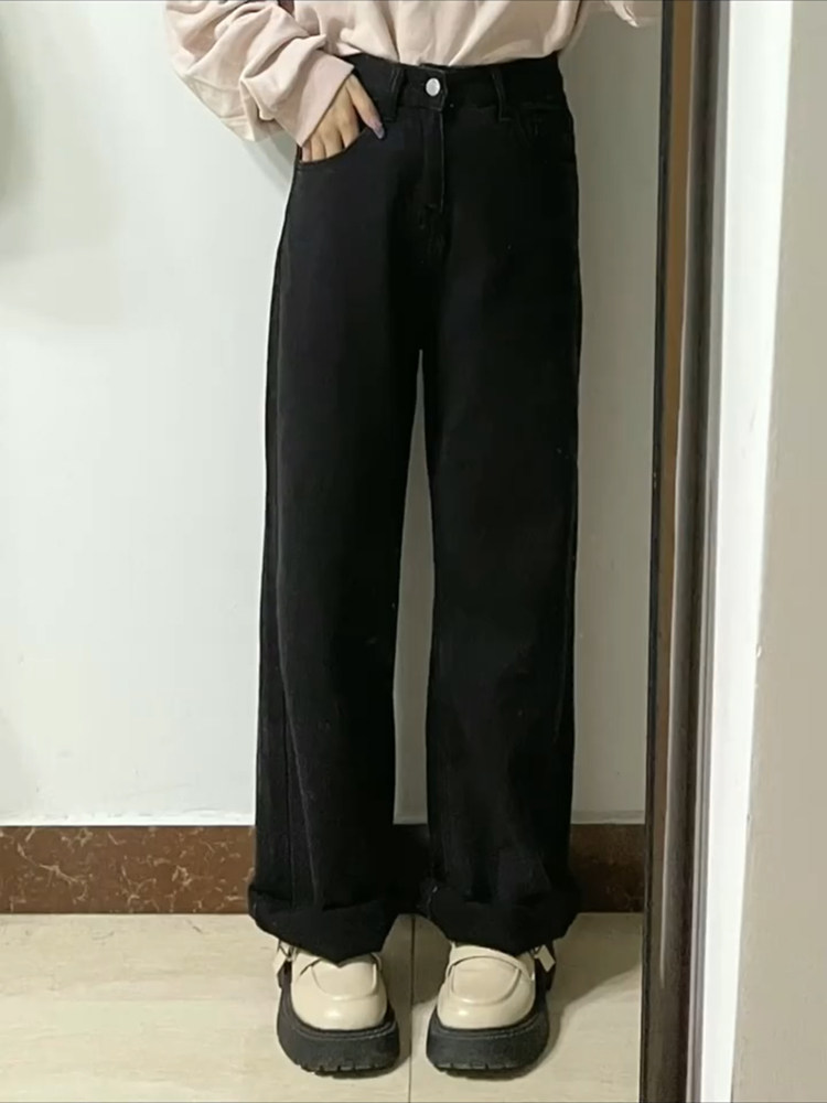 Черные осенние прямые свободные джинсы, штаны, флисовые приталенные леггинсы, подходит для подростков, свободный крой