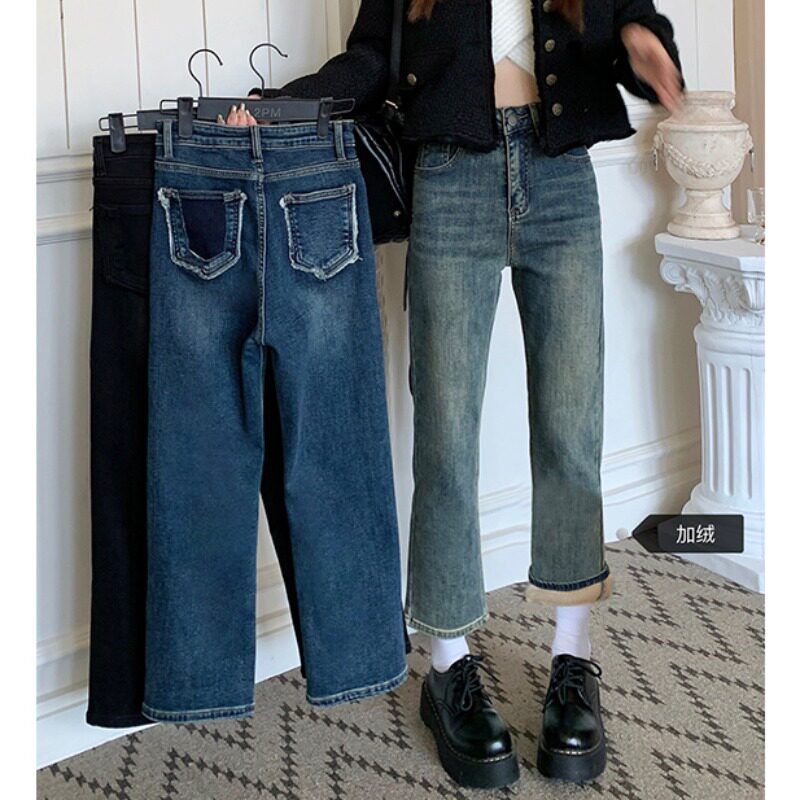 Ретро джинсы с начесом, эластичные штаны, в американском стиле, подходит для подростков, высокая талия, свободный прямой крой
