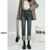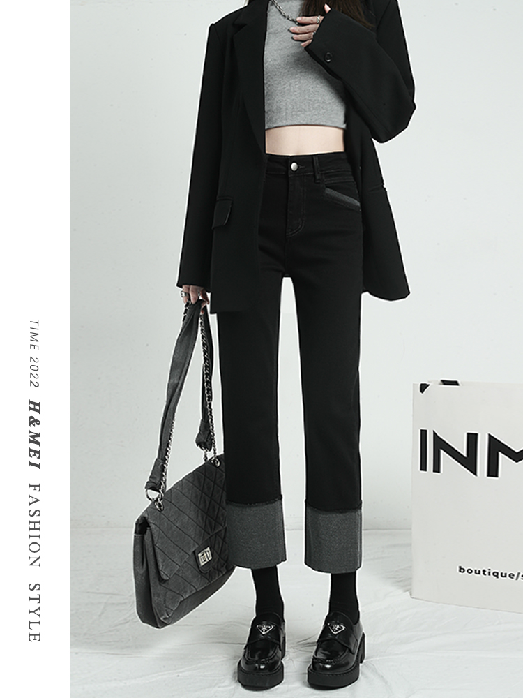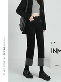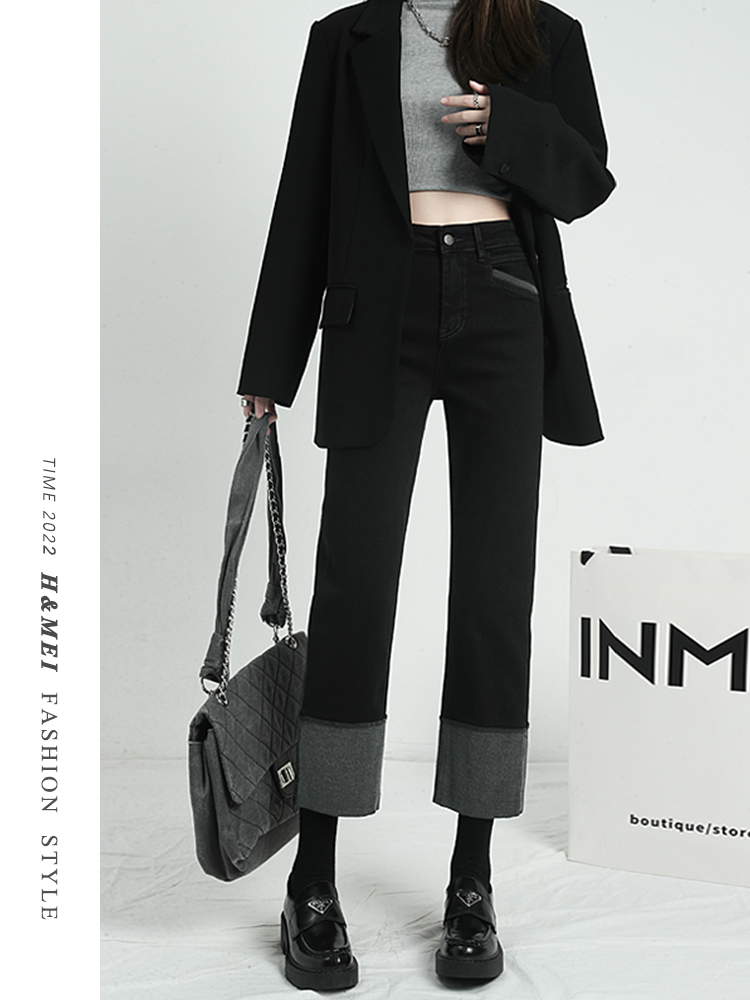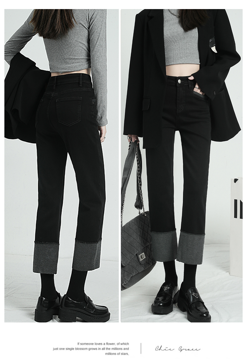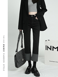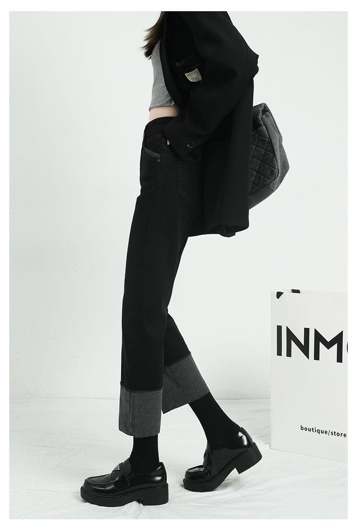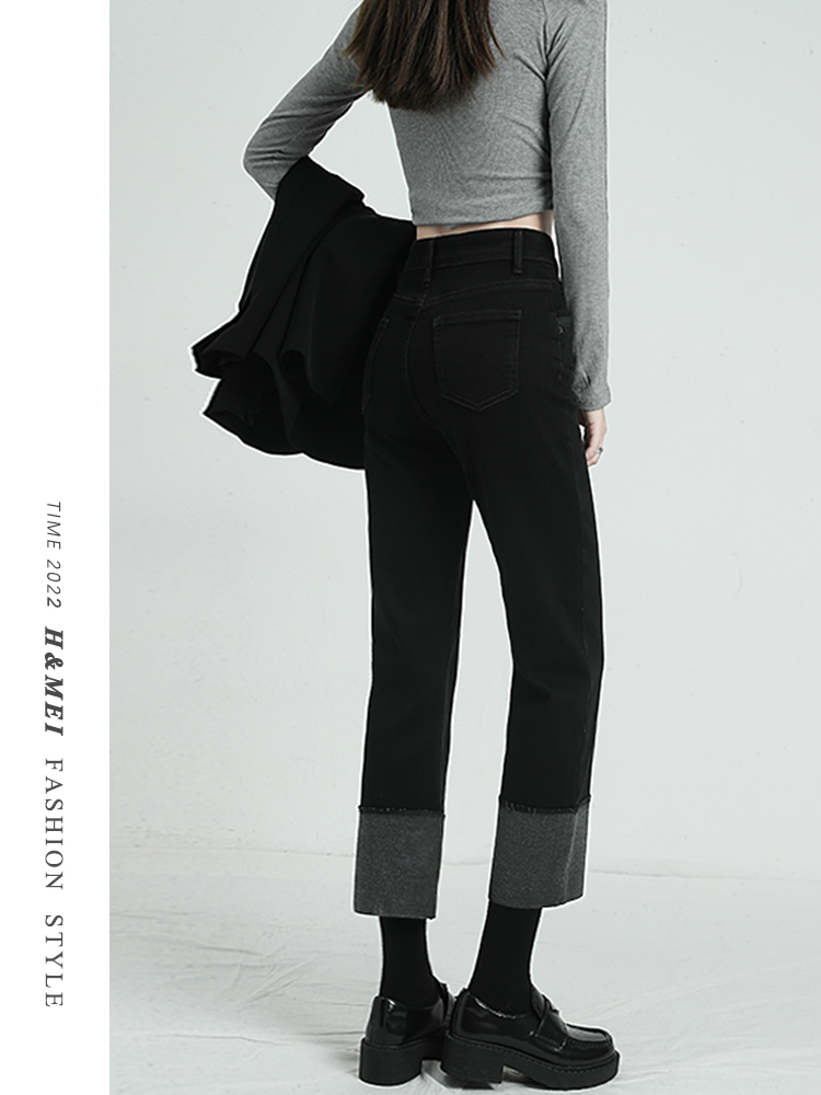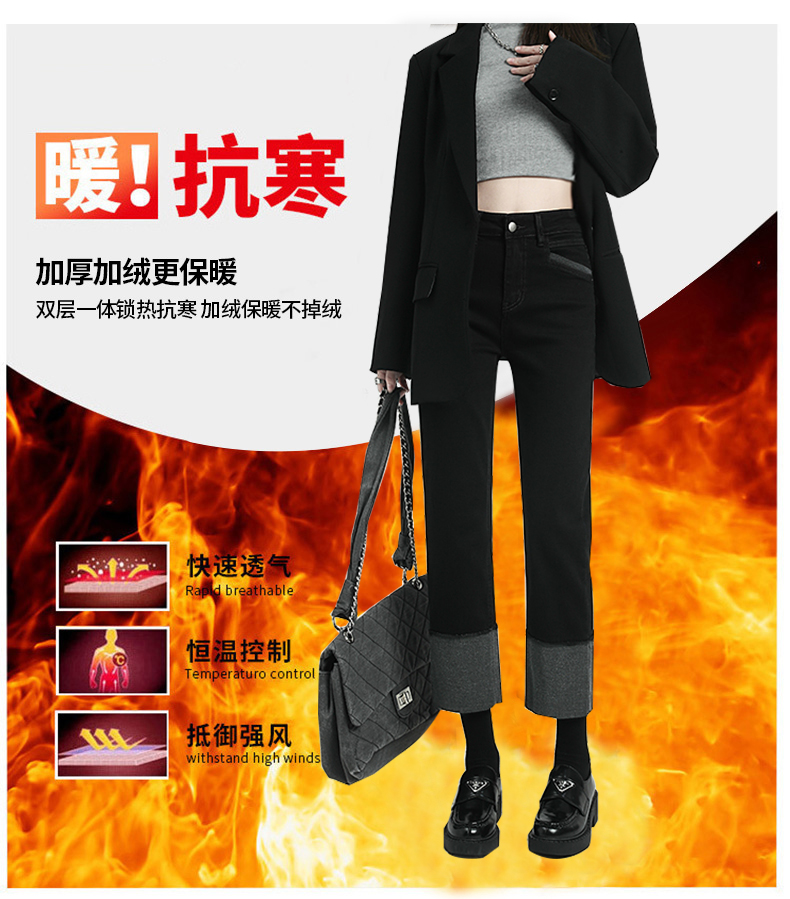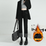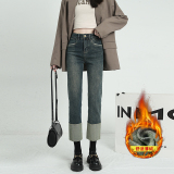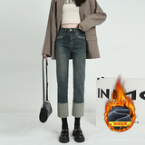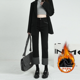 Черные флисовые демисезонные джинсы с начесом, штаны, свободный прямой крой, высокая талия