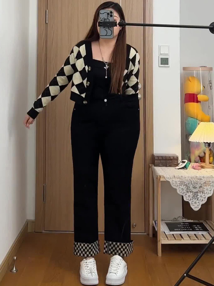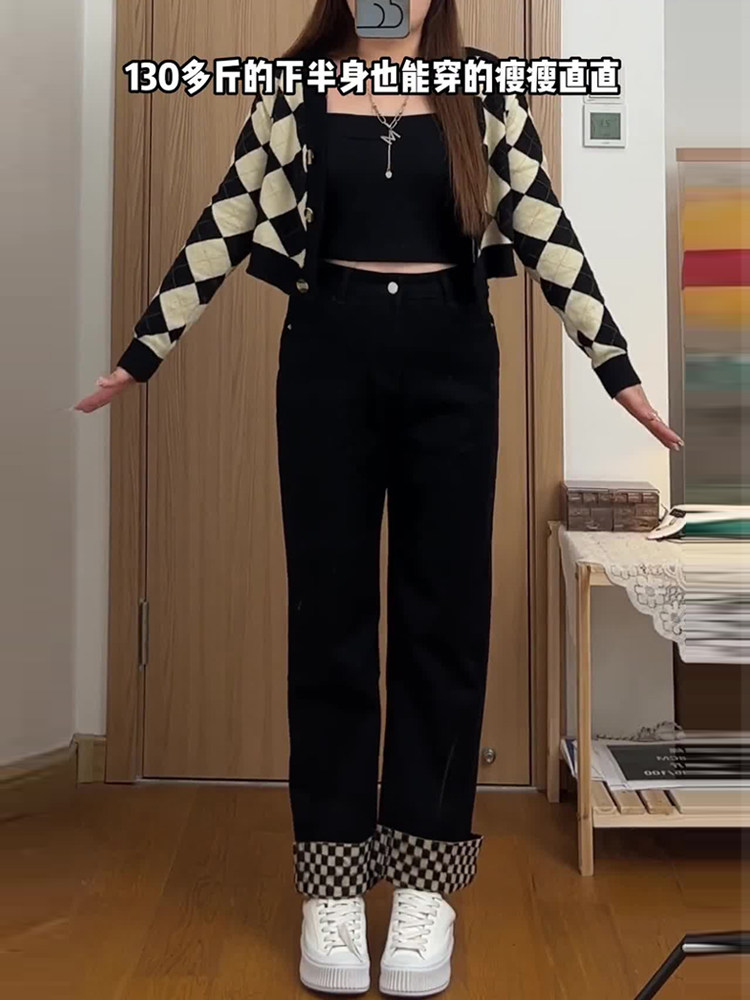 Утепленные шахматы, джинсы, штаны, высокая талия, свободный прямой крой, большой размер, по фигуре