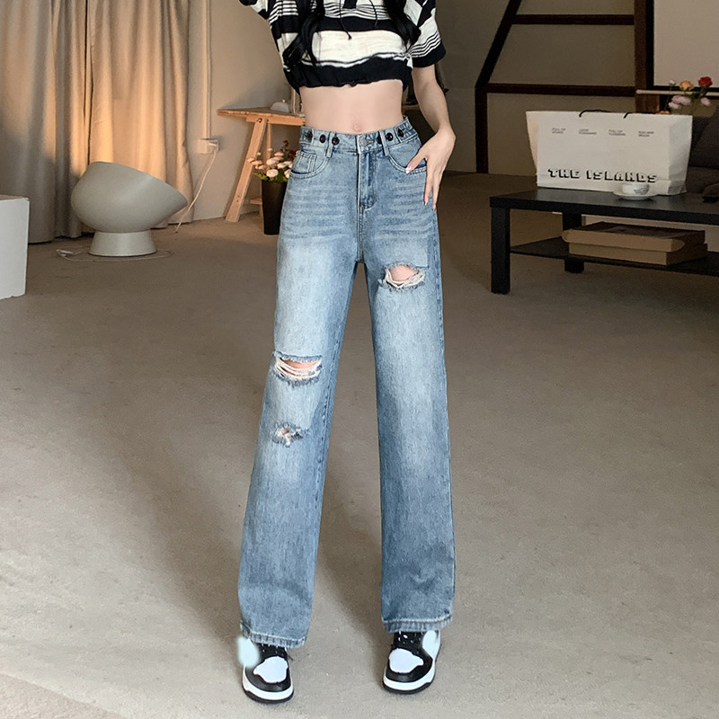 Нана, джинсы, штаны, коллекция 2022, в корейском стиле, высокая талия, по фигуре, свободный прямой крой