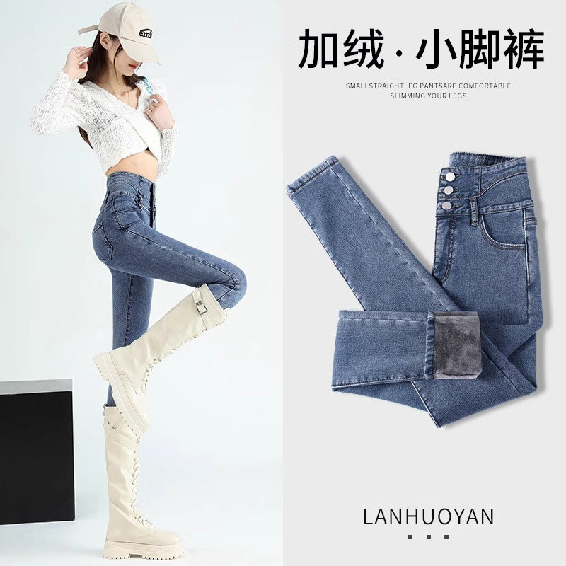 Ретро джинсы, демисезонные утепленные штаны, эластичный карандаш, высокая талия, подходит для подростков, в обтяжку