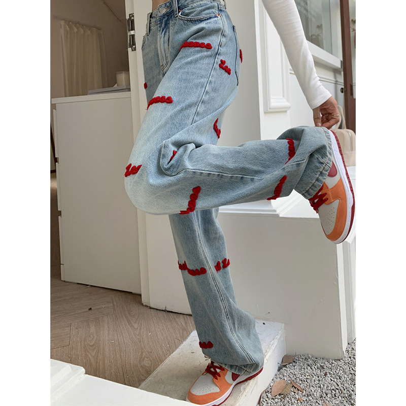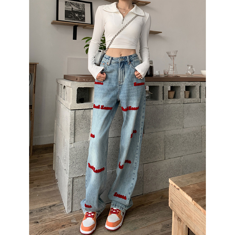 Демисезонные джинсы, штаны, леггинсы, большой размер, подходит для полных девушек, с вышивкой, свободный крой, в американском стиле, высокая талия