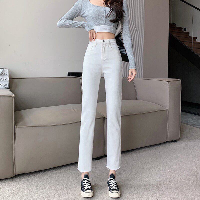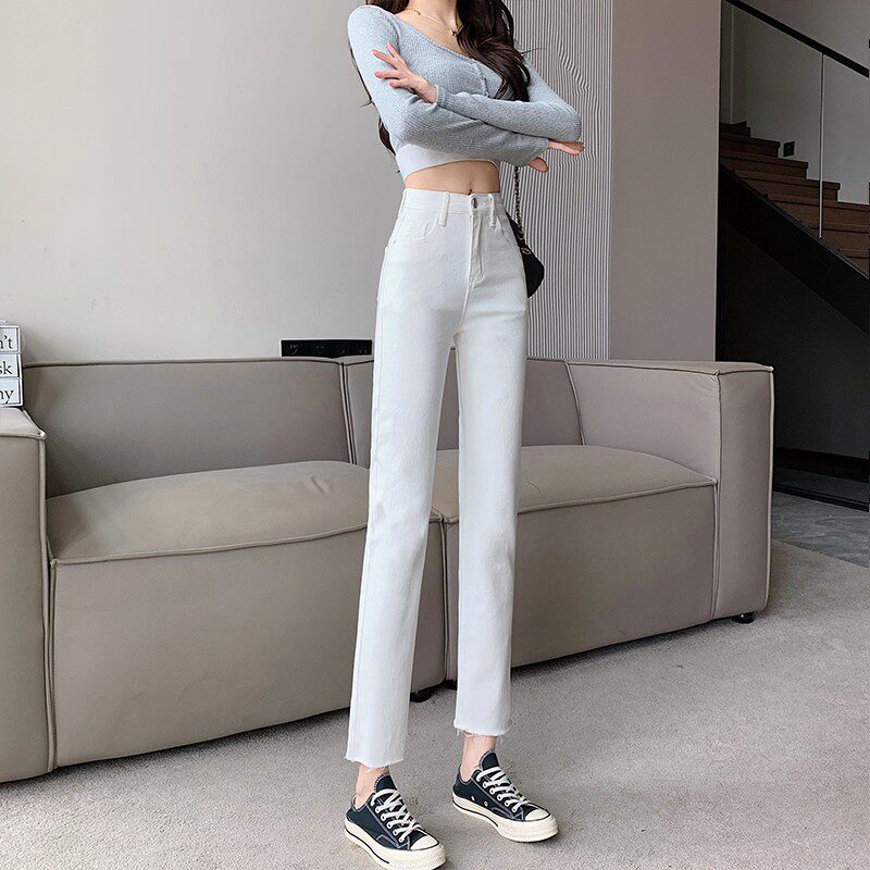 Белые цветные весенние штаны, светлые джинсы, в корейском стиле, свободный прямой крой, высокая талия, по фигуре