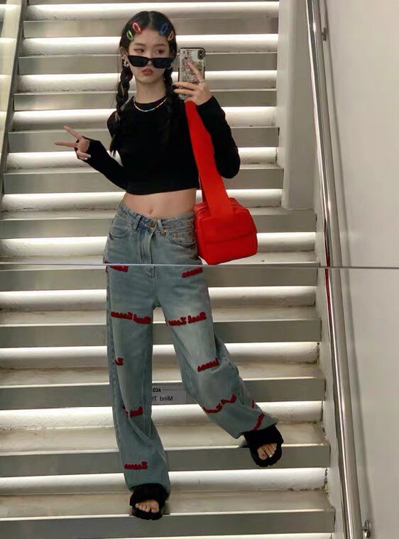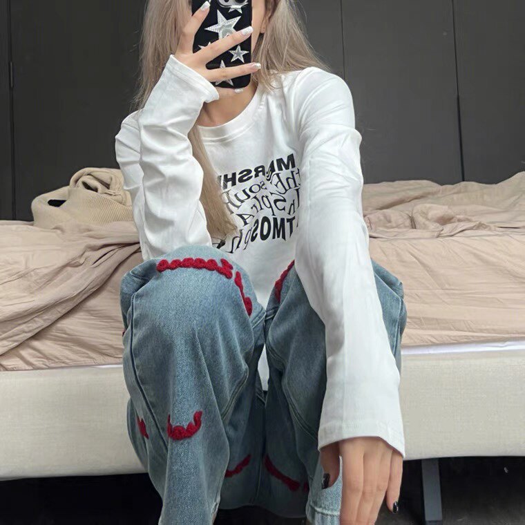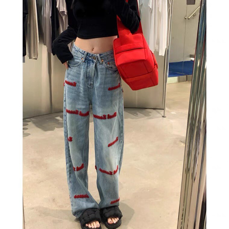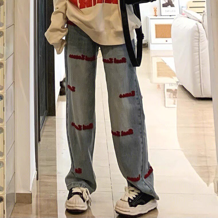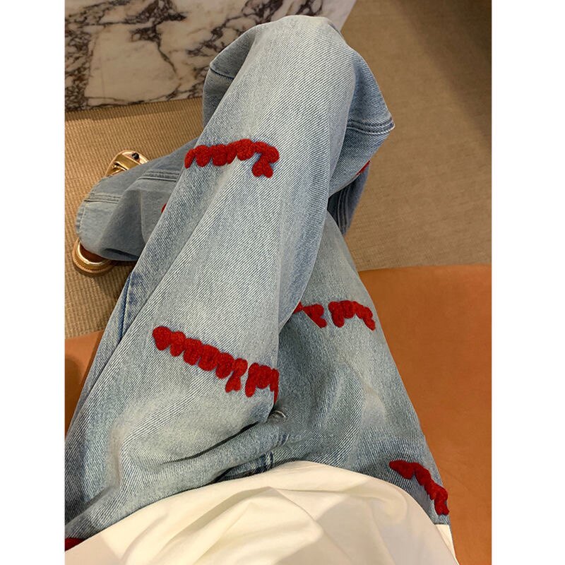 Ретро осенние джинсы, штаны, в американском стиле, с вышивкой, 2023, большой размер, свободный прямой крой