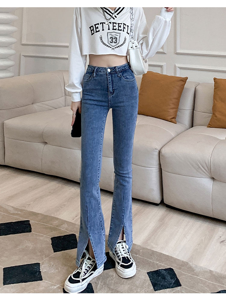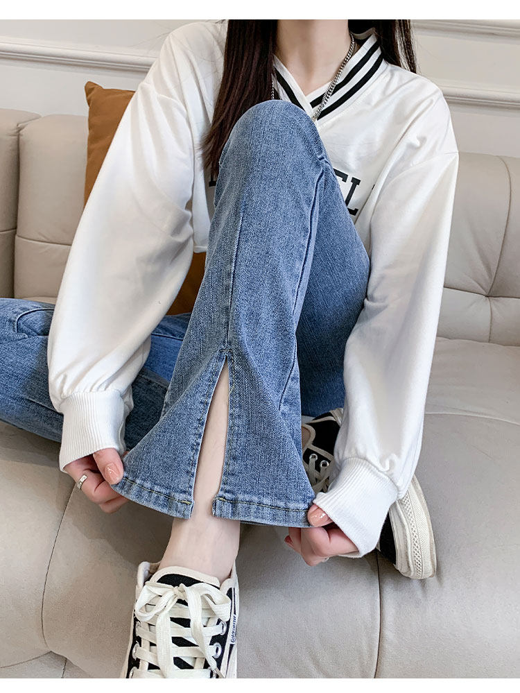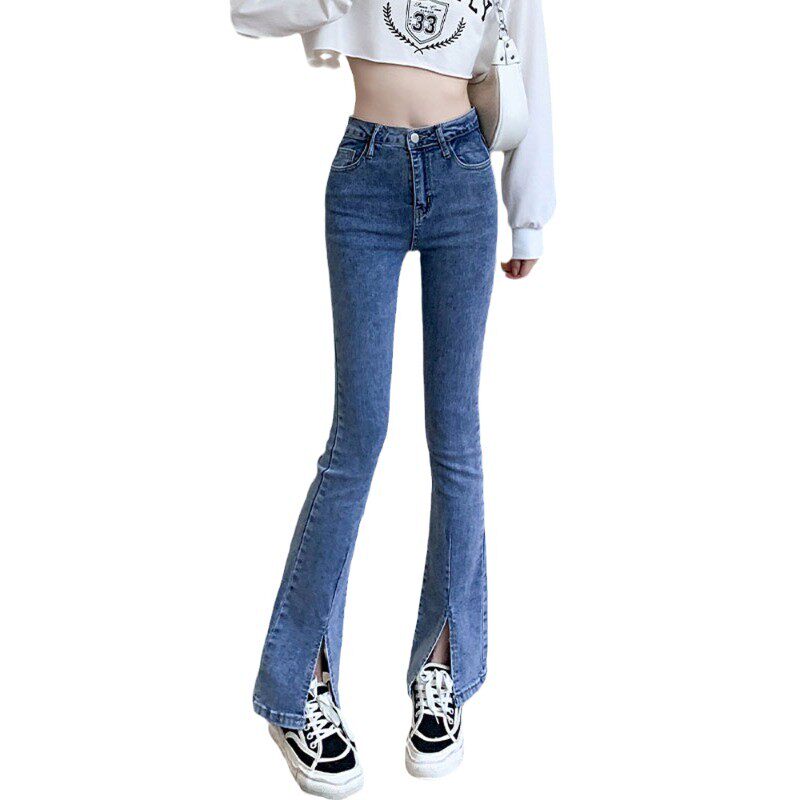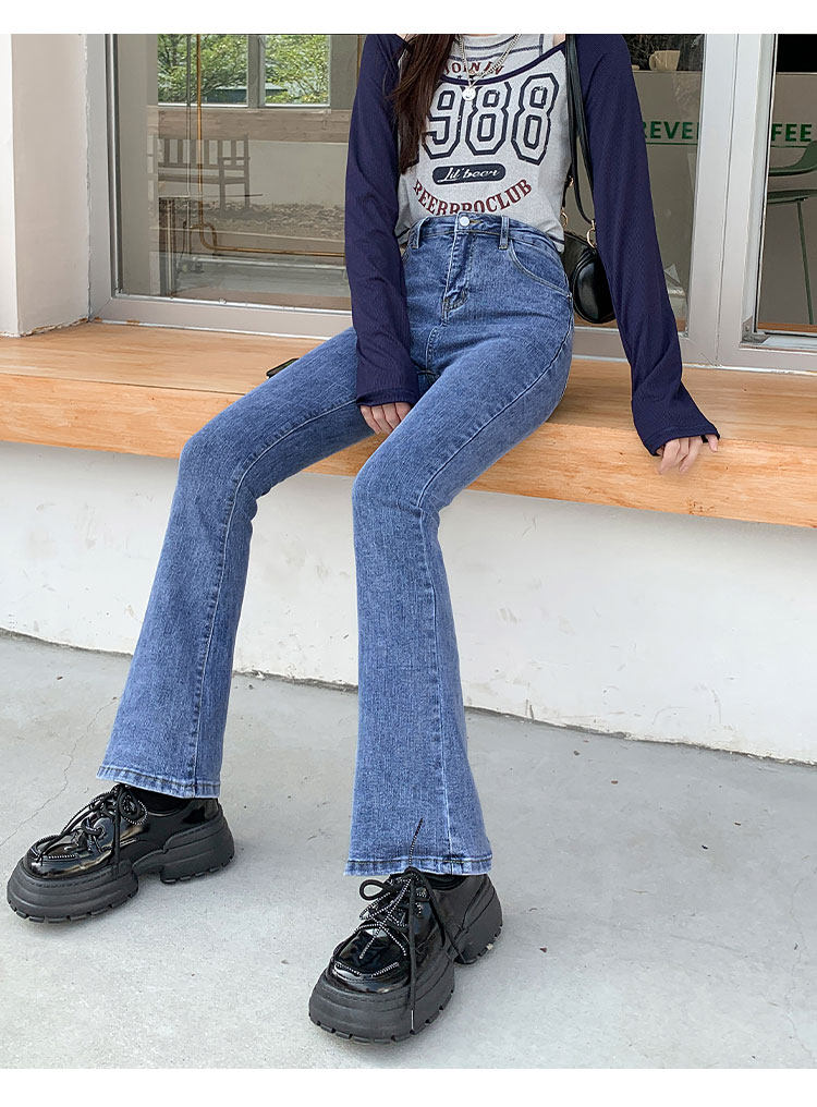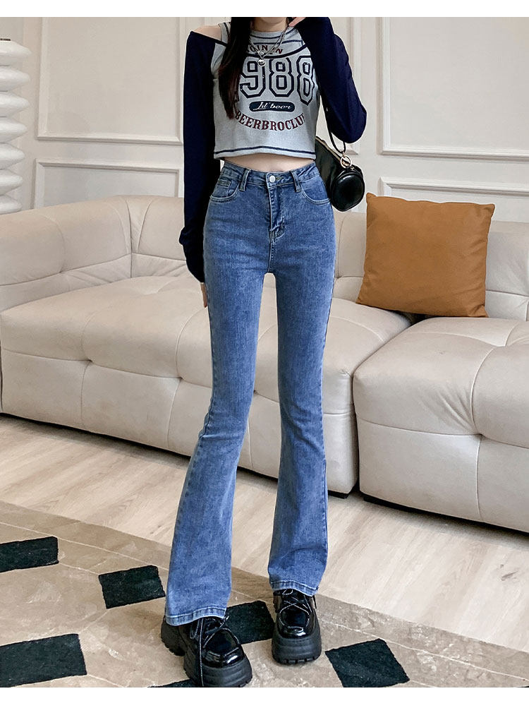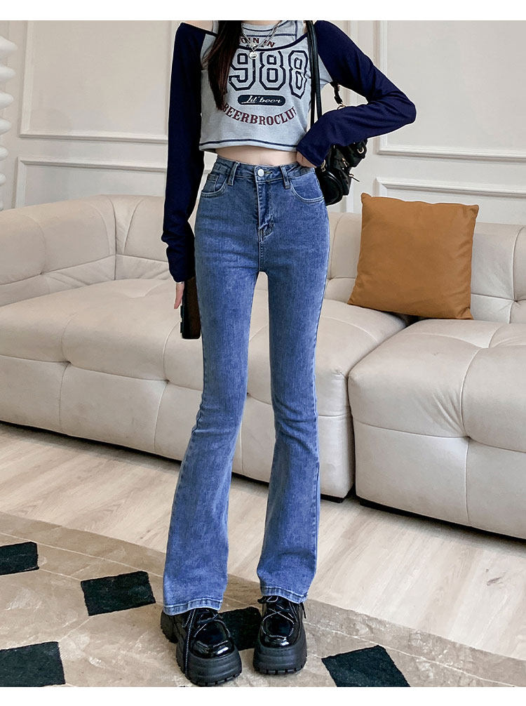 Осенние джинсы, штаны, приталенные штаны-клёш, 150см, подходит для подростков, высокая талия, облегающий крой