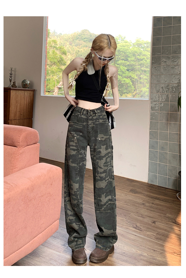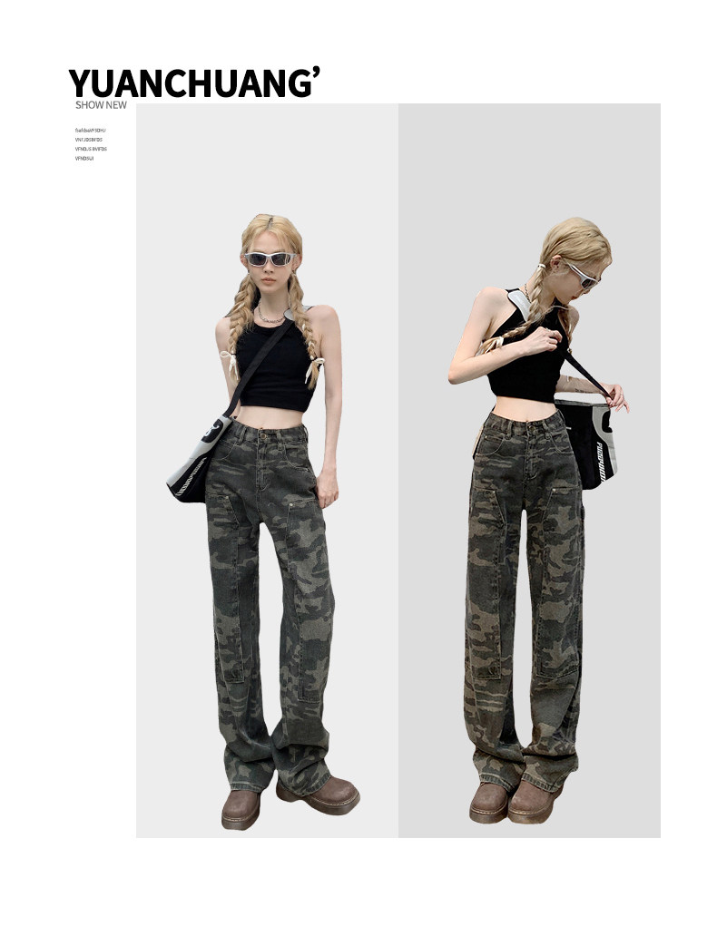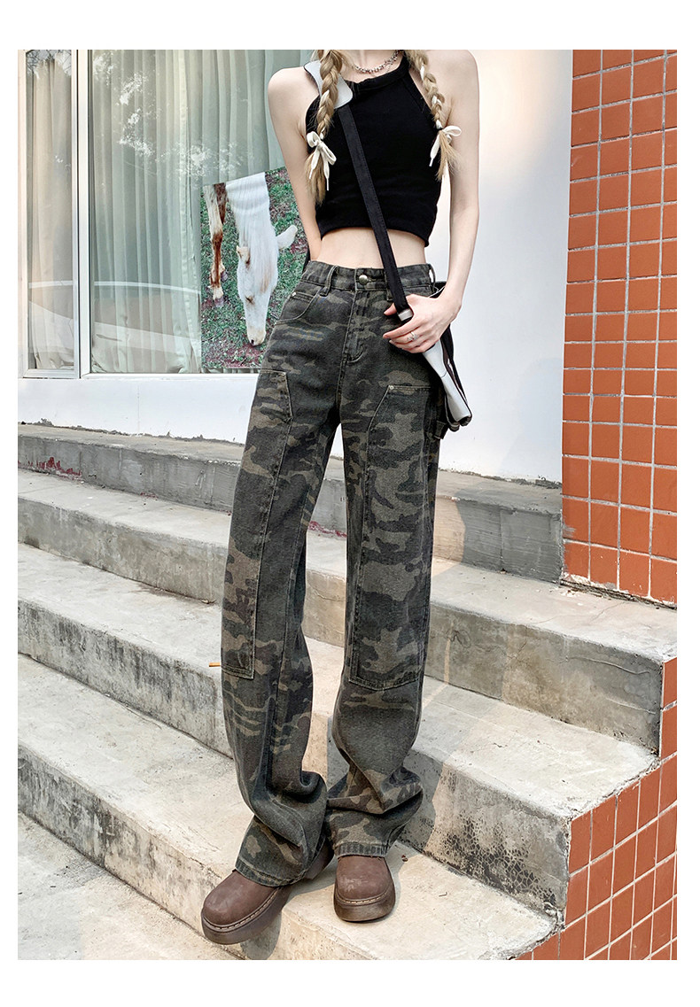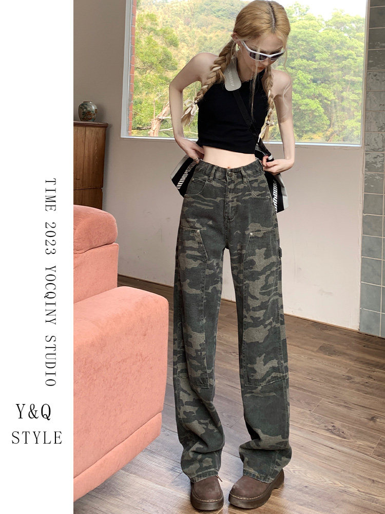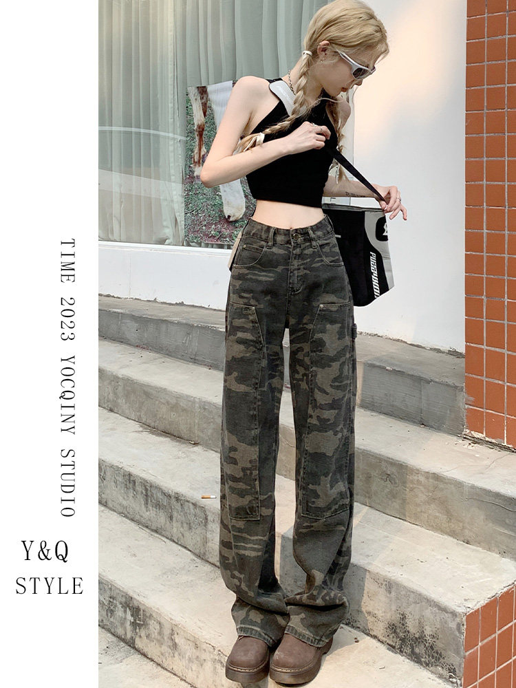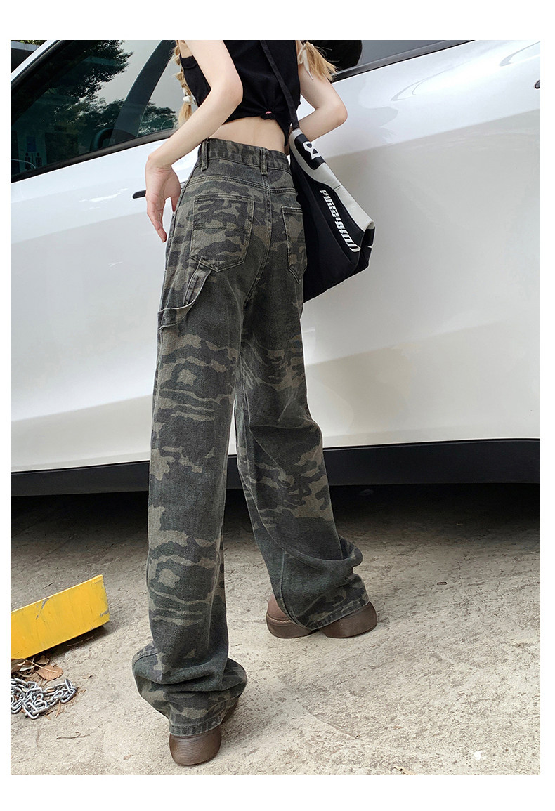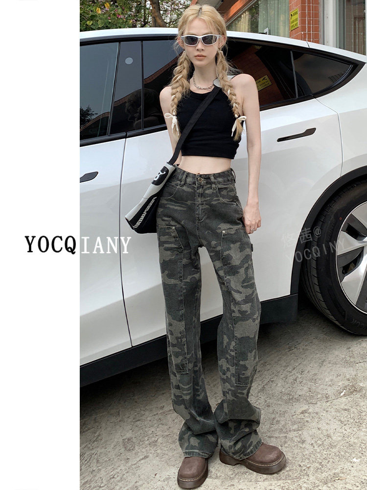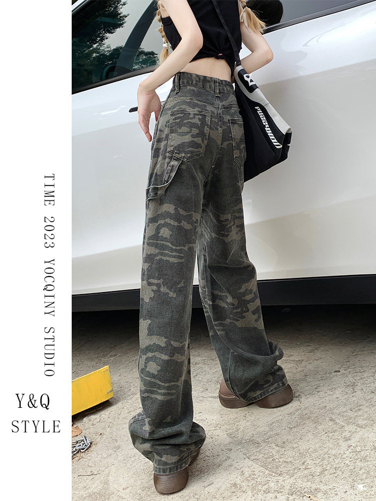 Камуфляжные осенние джинсы, приталенные трендовые штаны, в американском стиле, высокая талия, оверсайз, свободный прямой крой