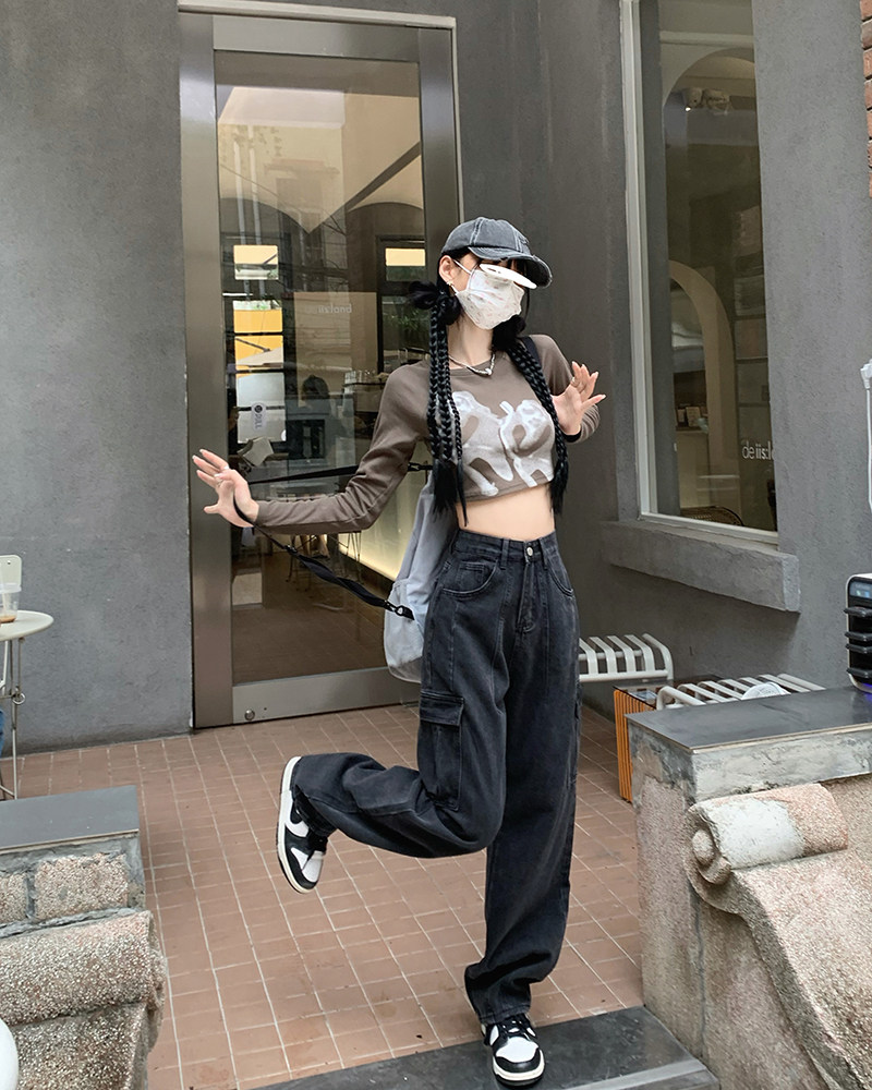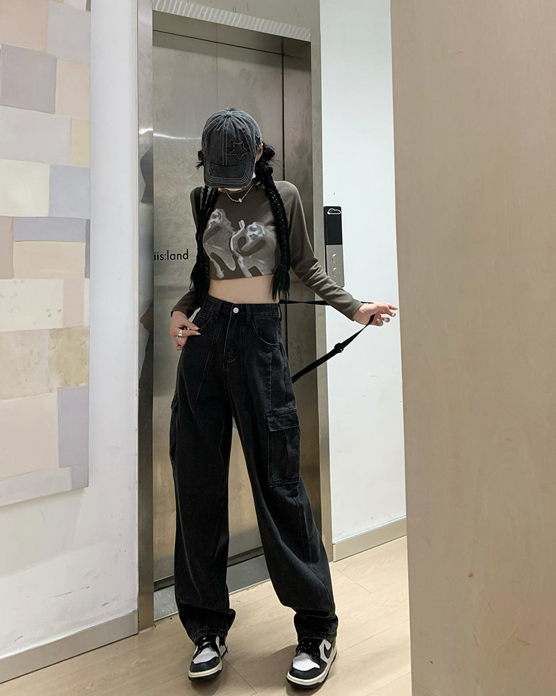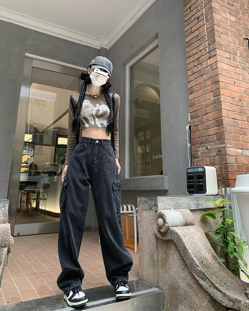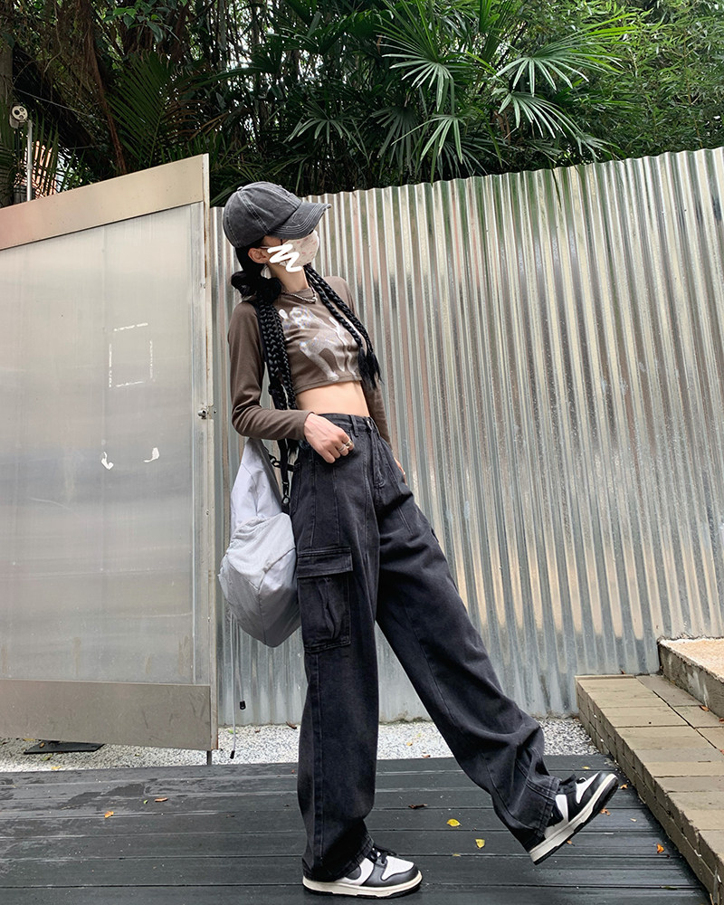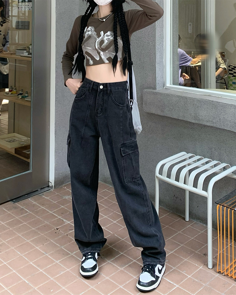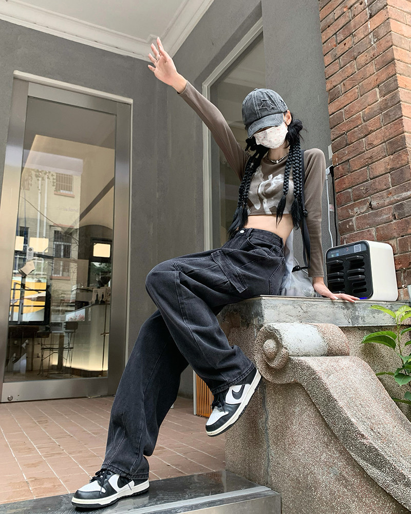 Джинсы, черные штаны, высокая талия, подходит для подростков, свободный крой