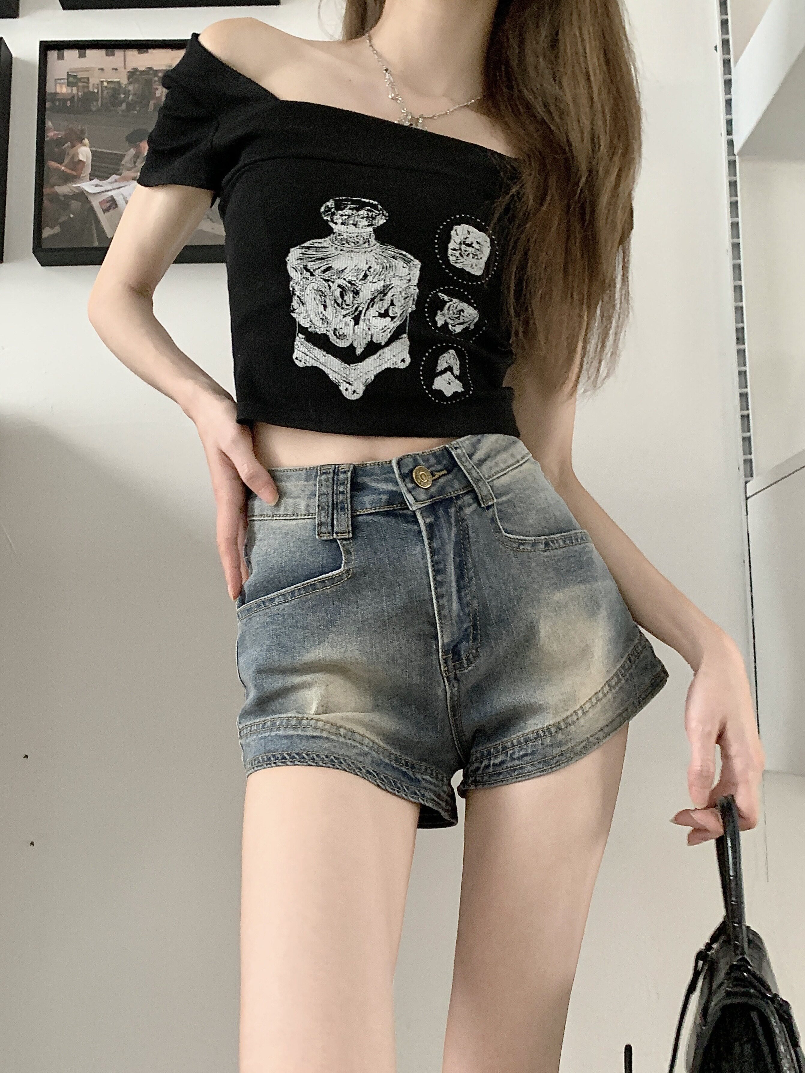Ретро штаны, летняя приталенная джинсовая юбка, шорты, в американском стиле