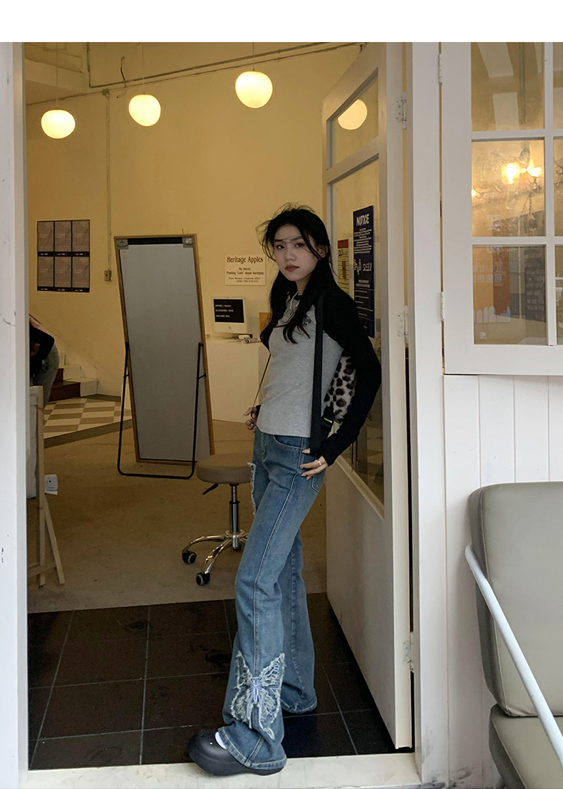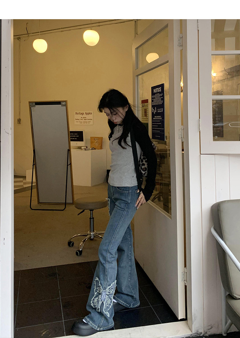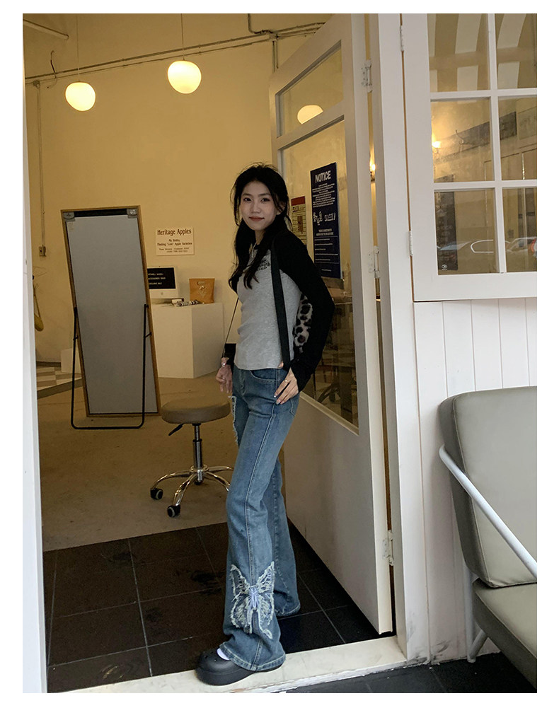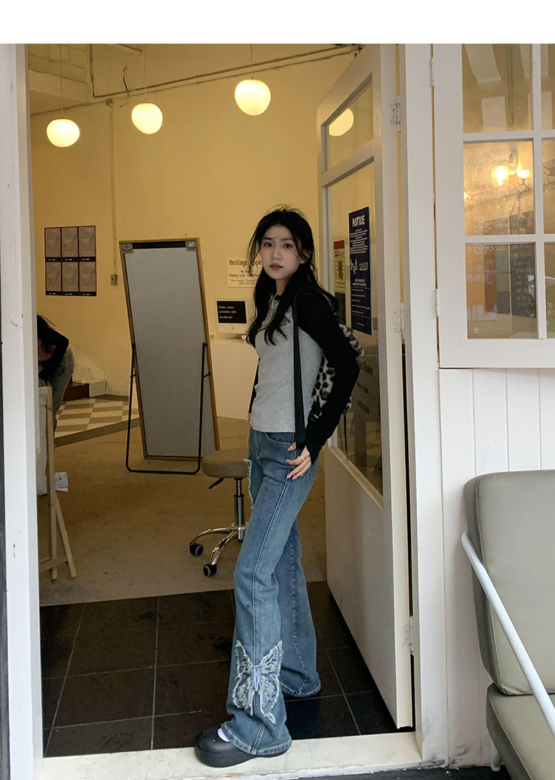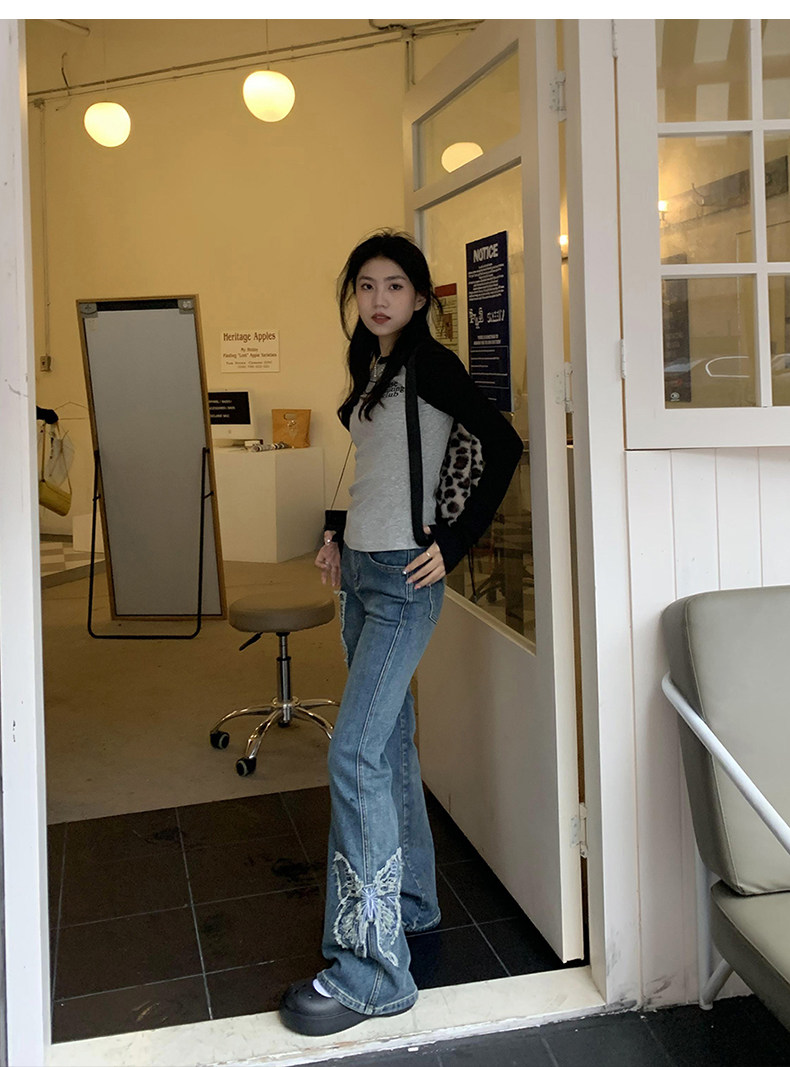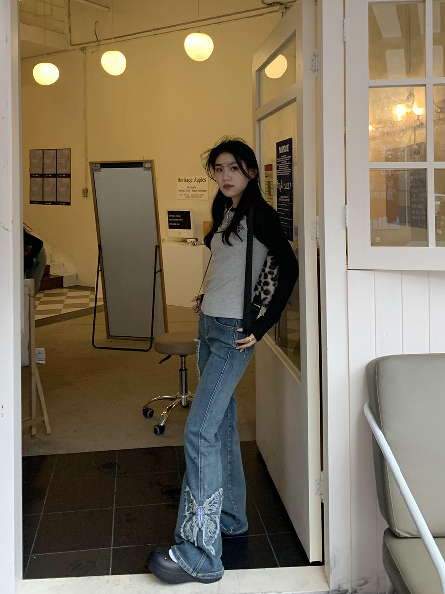 Приталенные джинсы с бабочкой, штаны, штаны-клёш, в американском стиле, с вышивкой, высокая талия