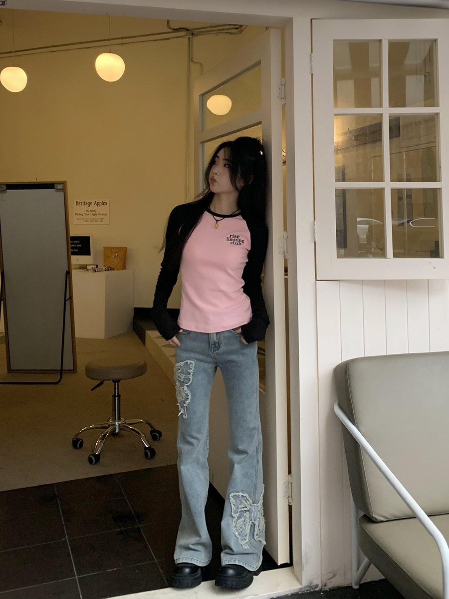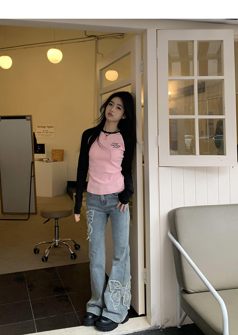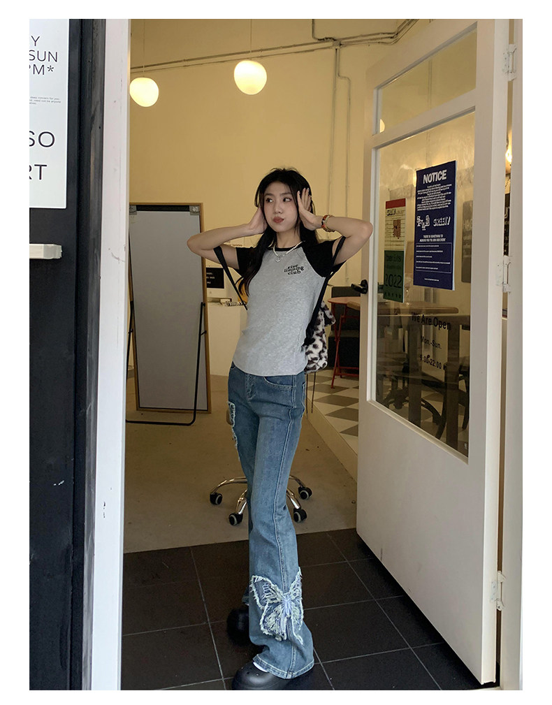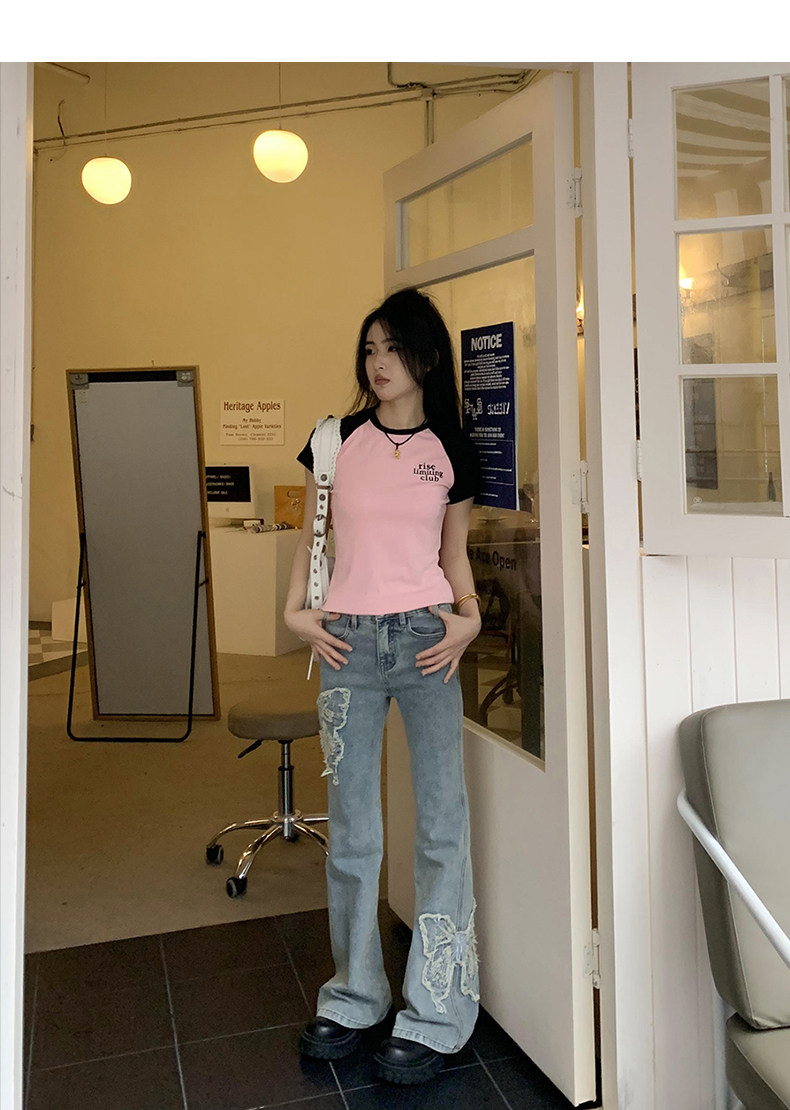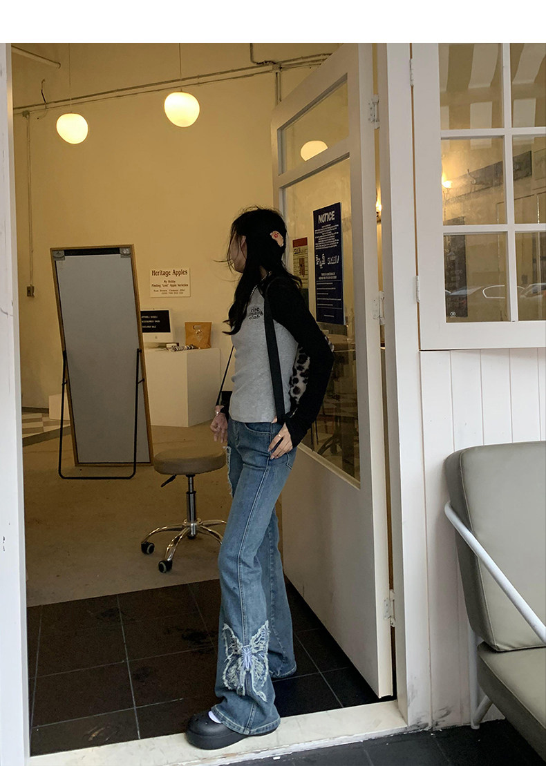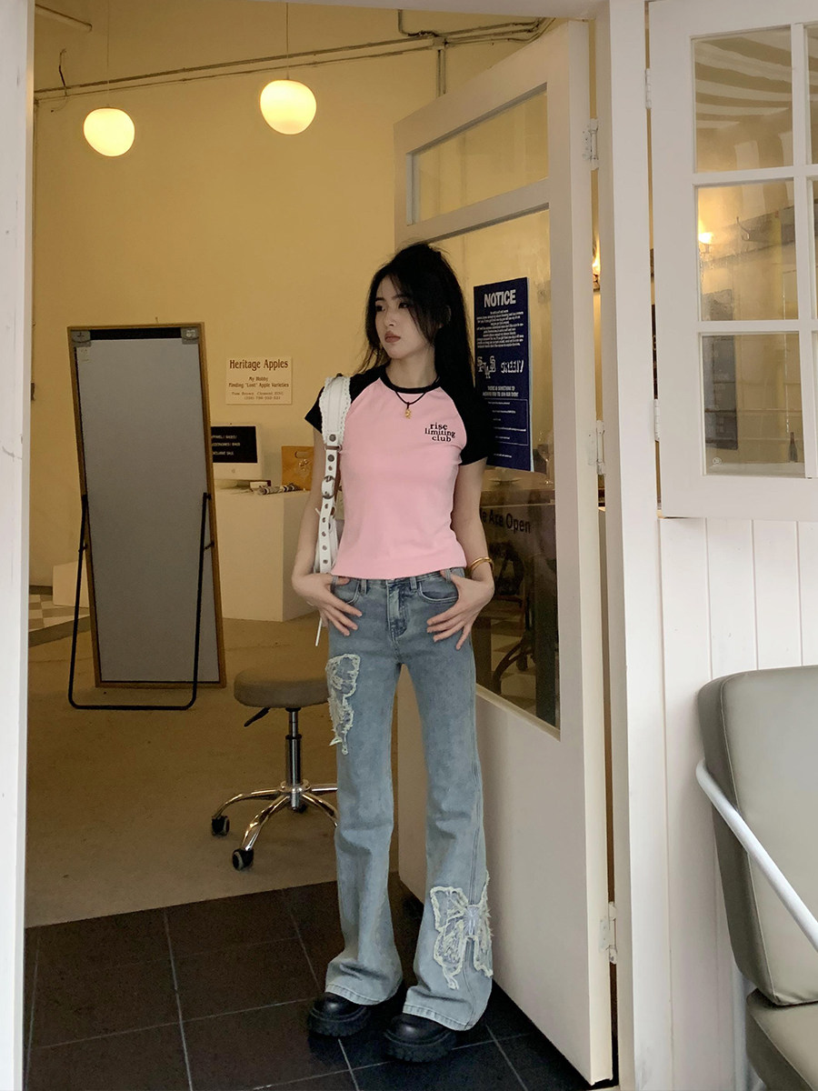 Приталенные джинсы с бабочкой, штаны, штаны-клёш, в американском стиле, с вышивкой, высокая талия