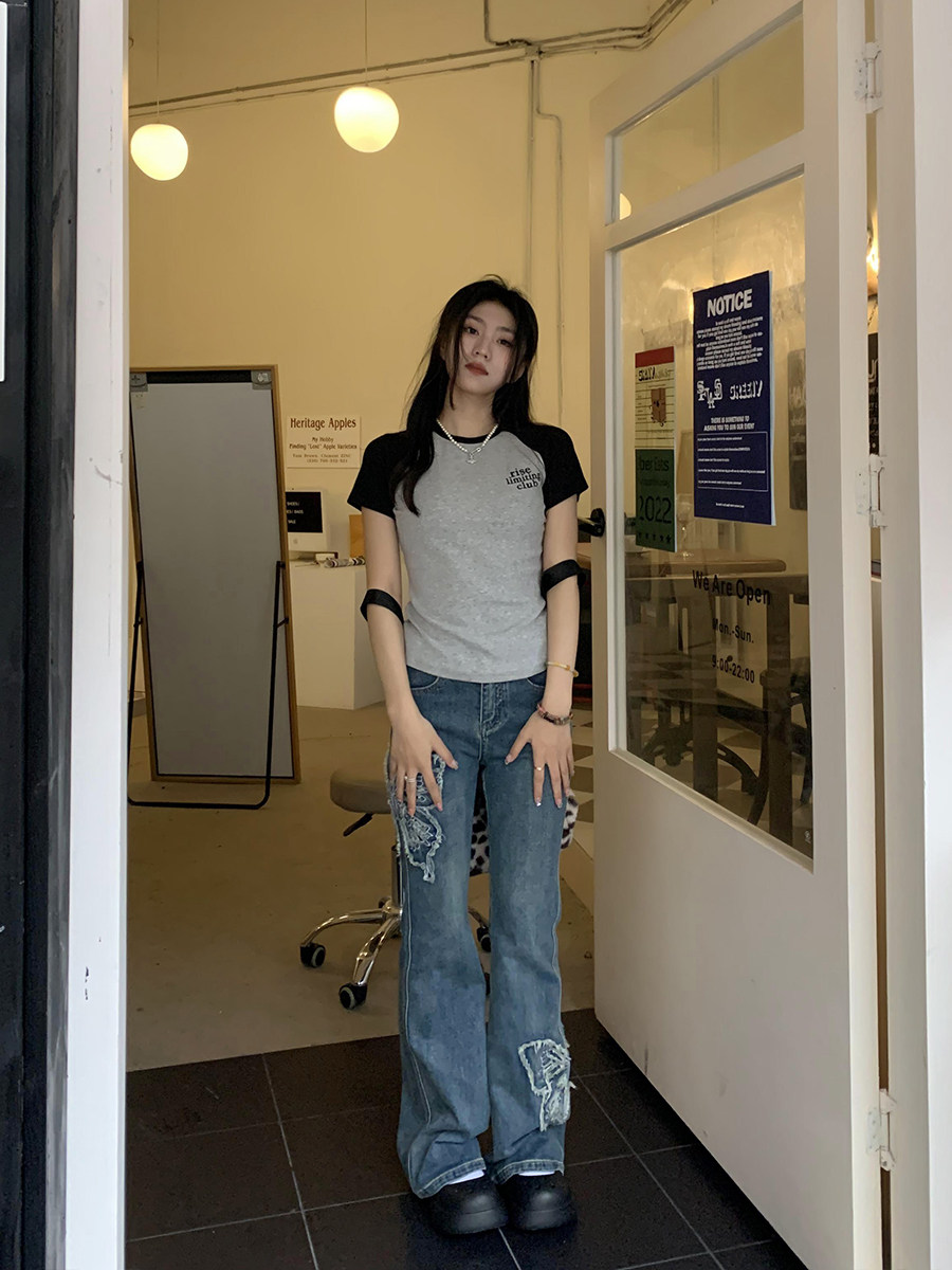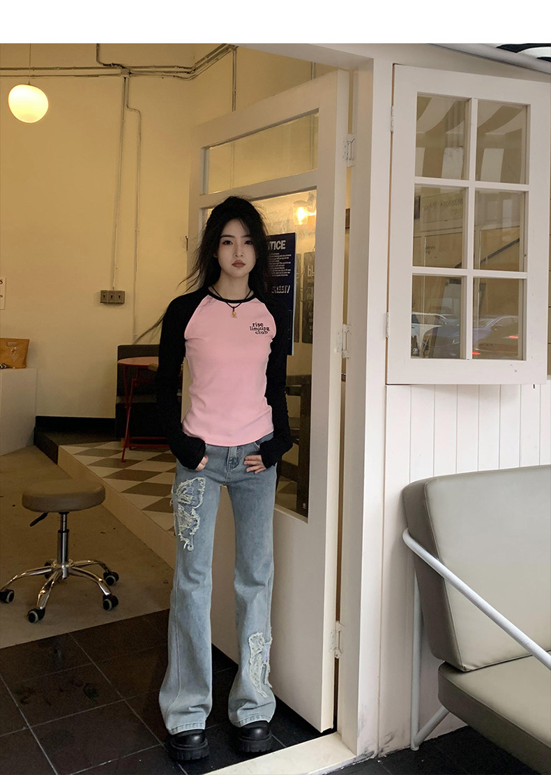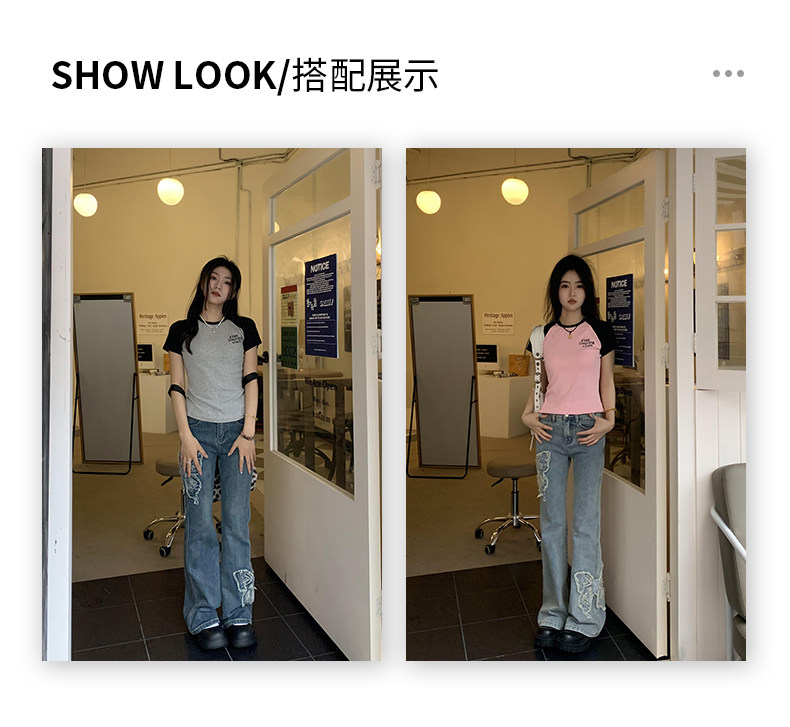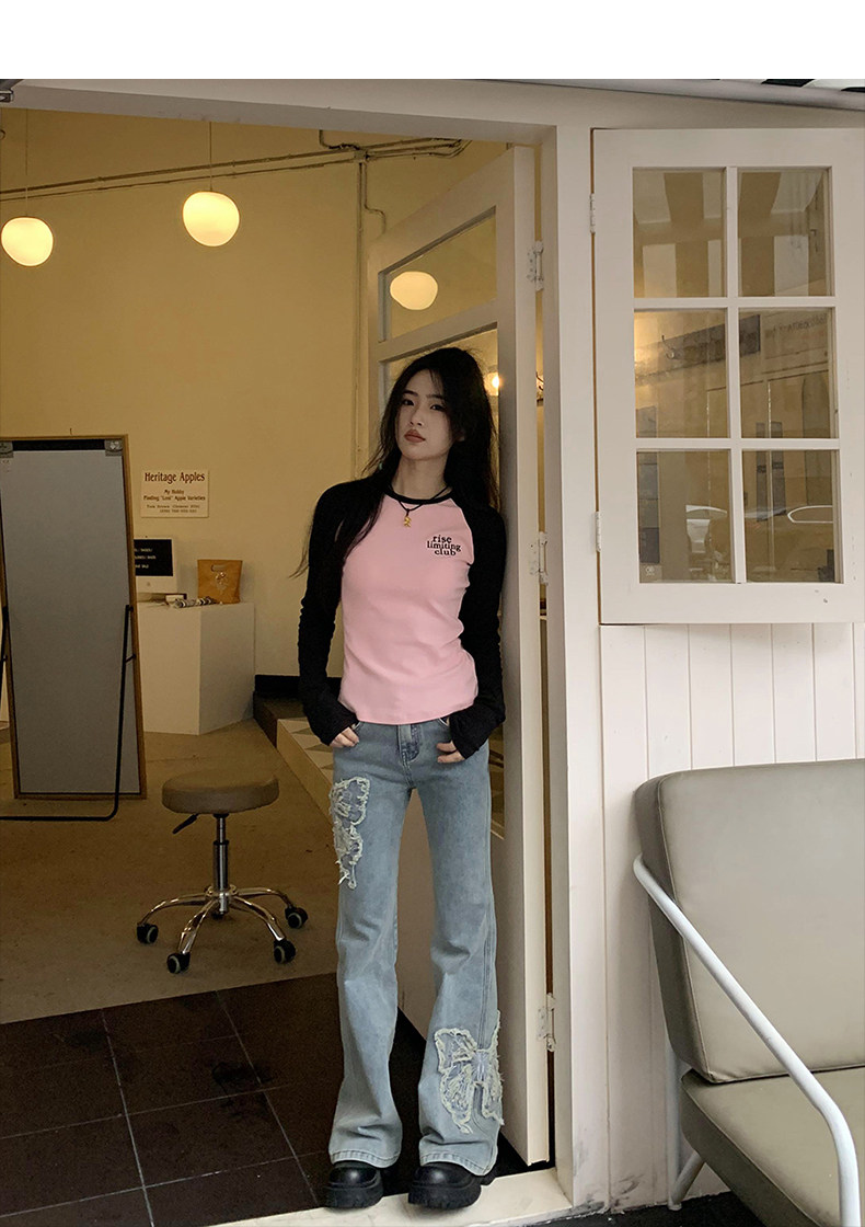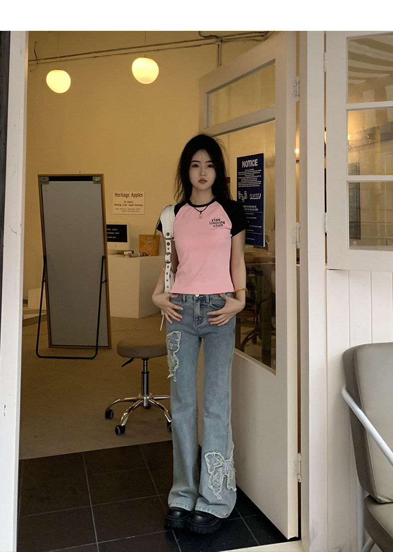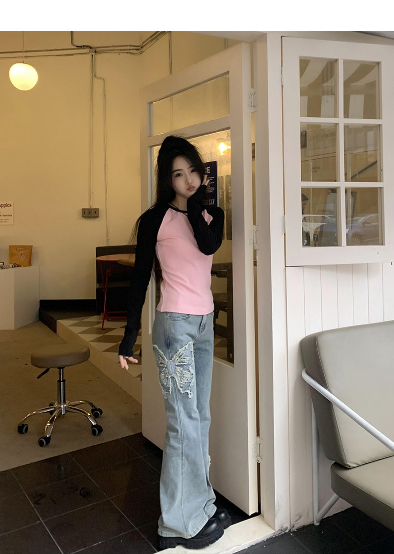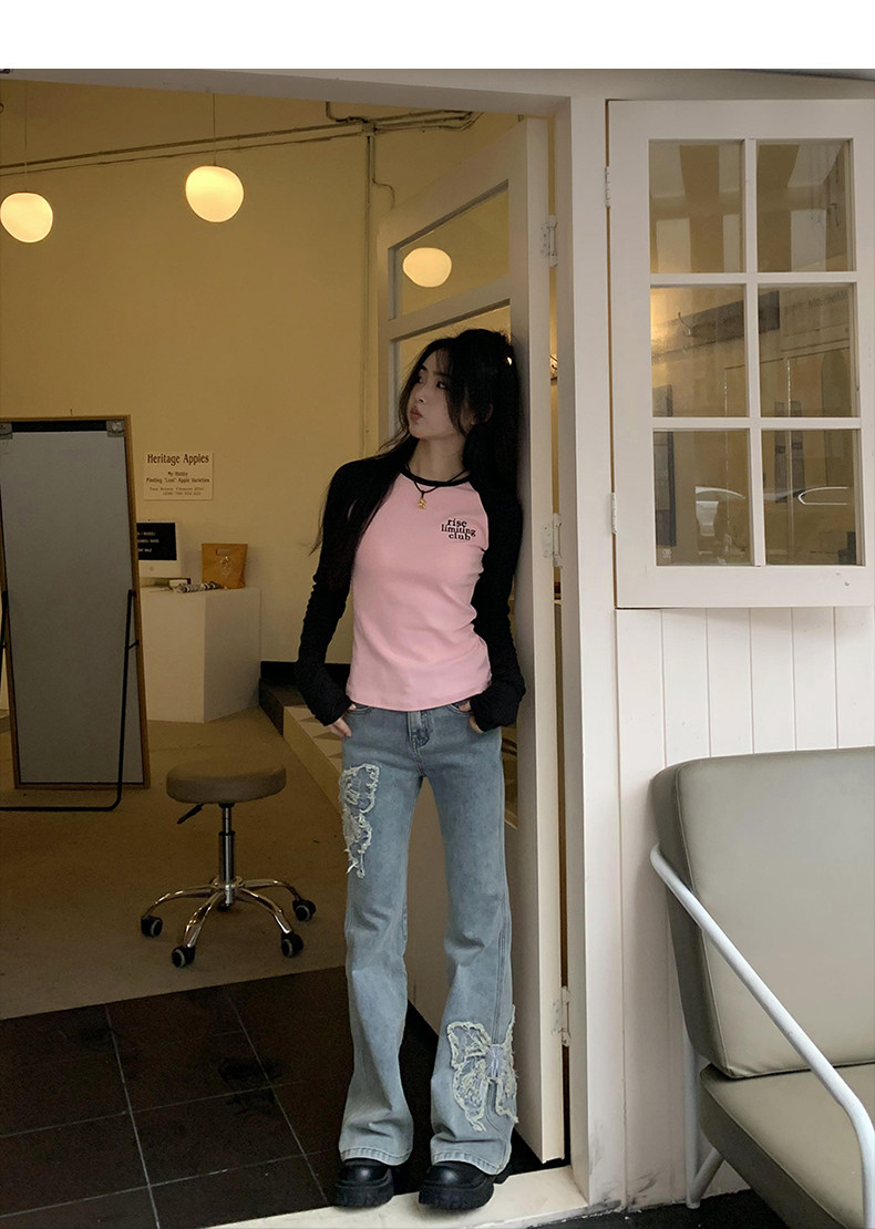 Приталенные джинсы с бабочкой, штаны, штаны-клёш, в американском стиле, с вышивкой, высокая талия