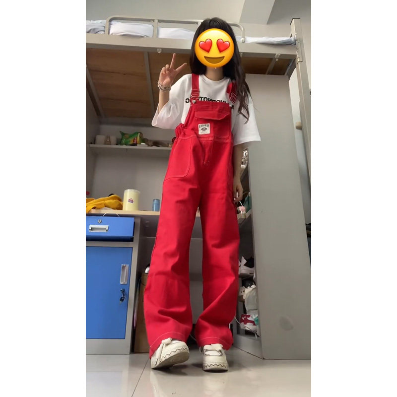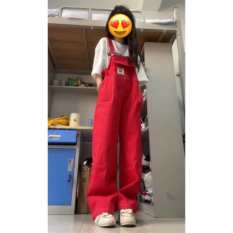 Ретро красный джинсовый комбинезон, летние дизайнерские штаны, в американском стиле, подходит для подростков, оверсайз, свободный прямой крой, стройный силуэт
