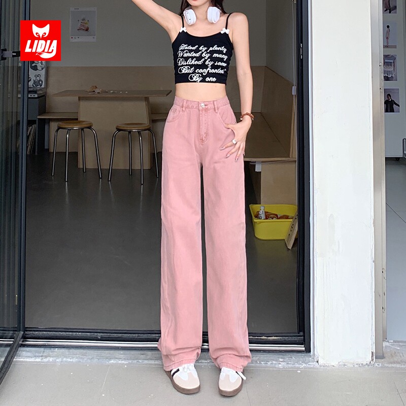 Розовые тонкие приталенные джинсы, штаны, высокая талия, свободный прямой крой