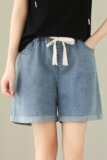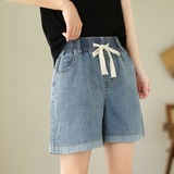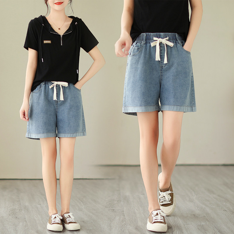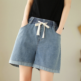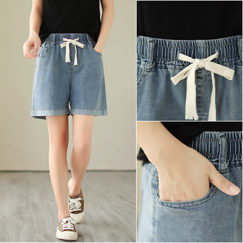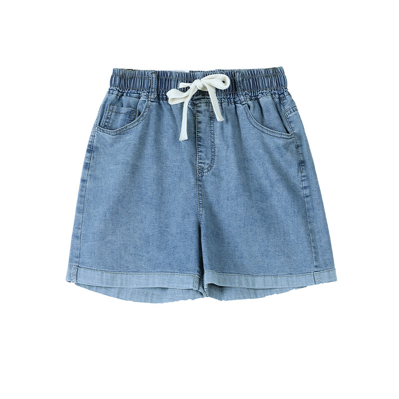Джинсовая юбка, шорты, летние тонкие эластичные штаны, высокая талия, на шнурках, оверсайз, эластичная талия, свободный крой, по фигуре, большой размер