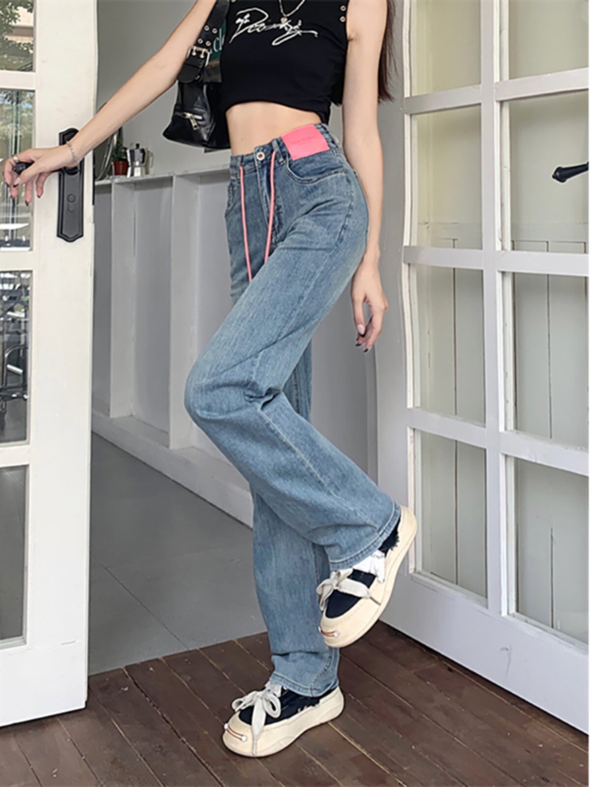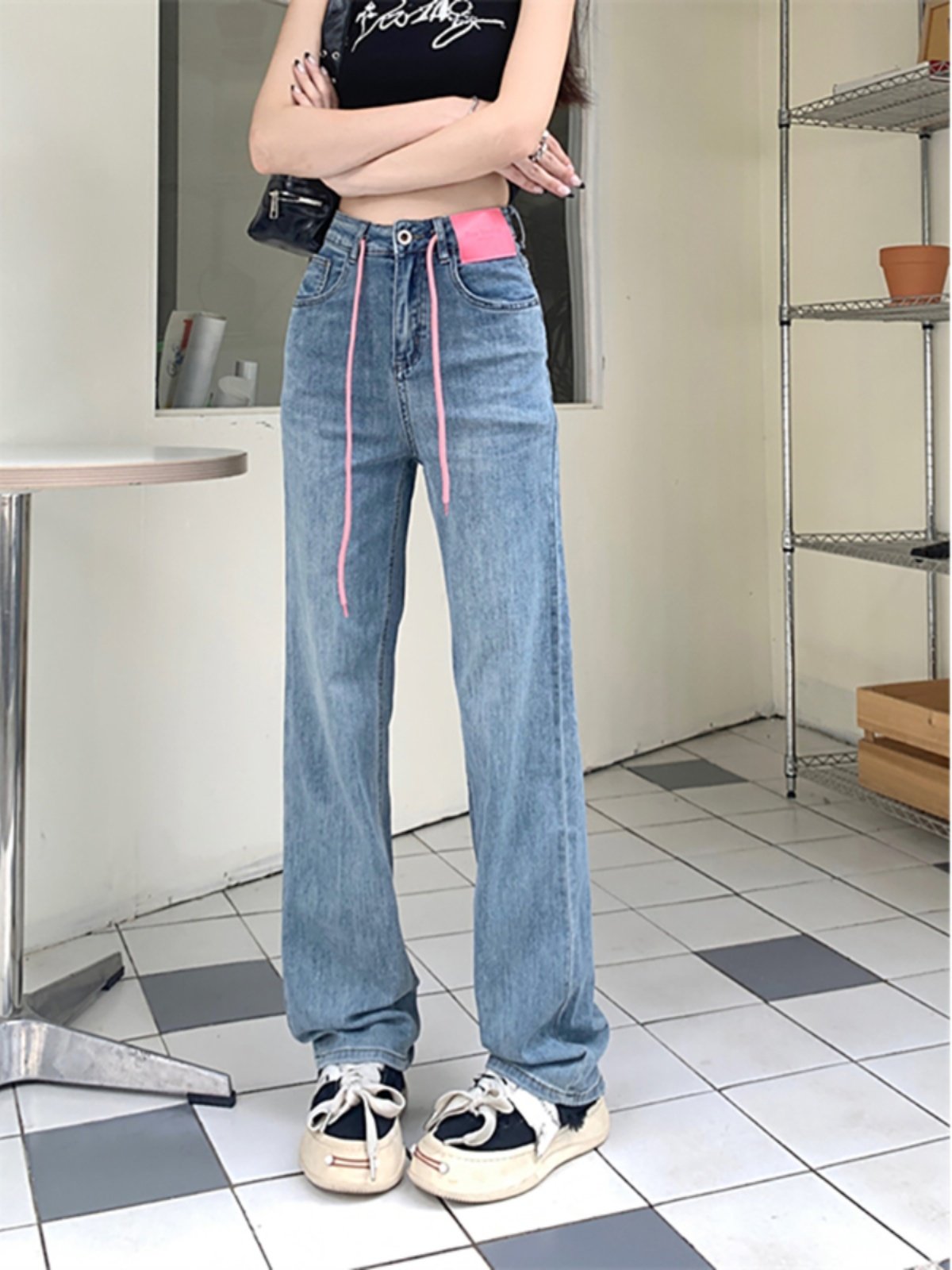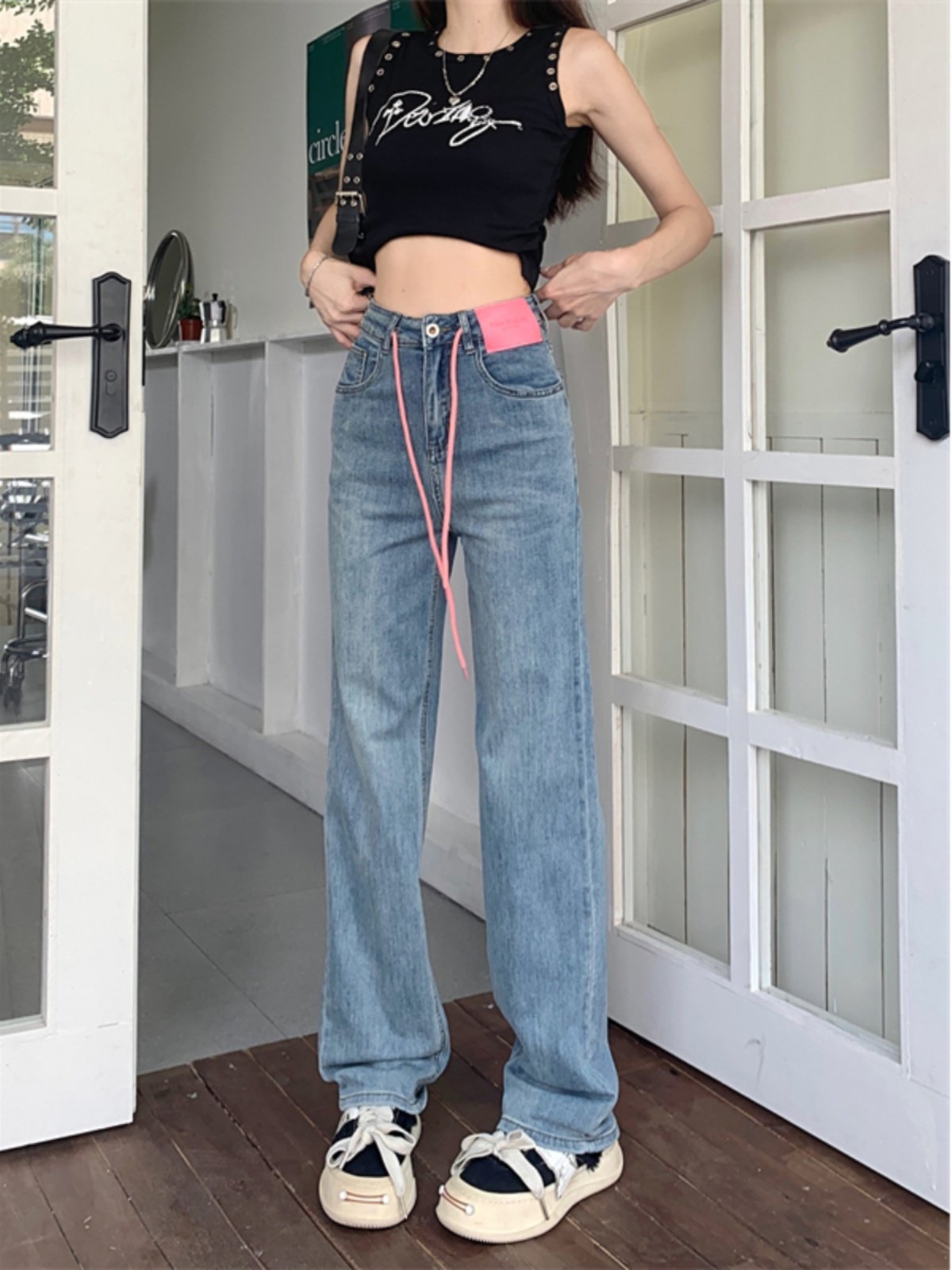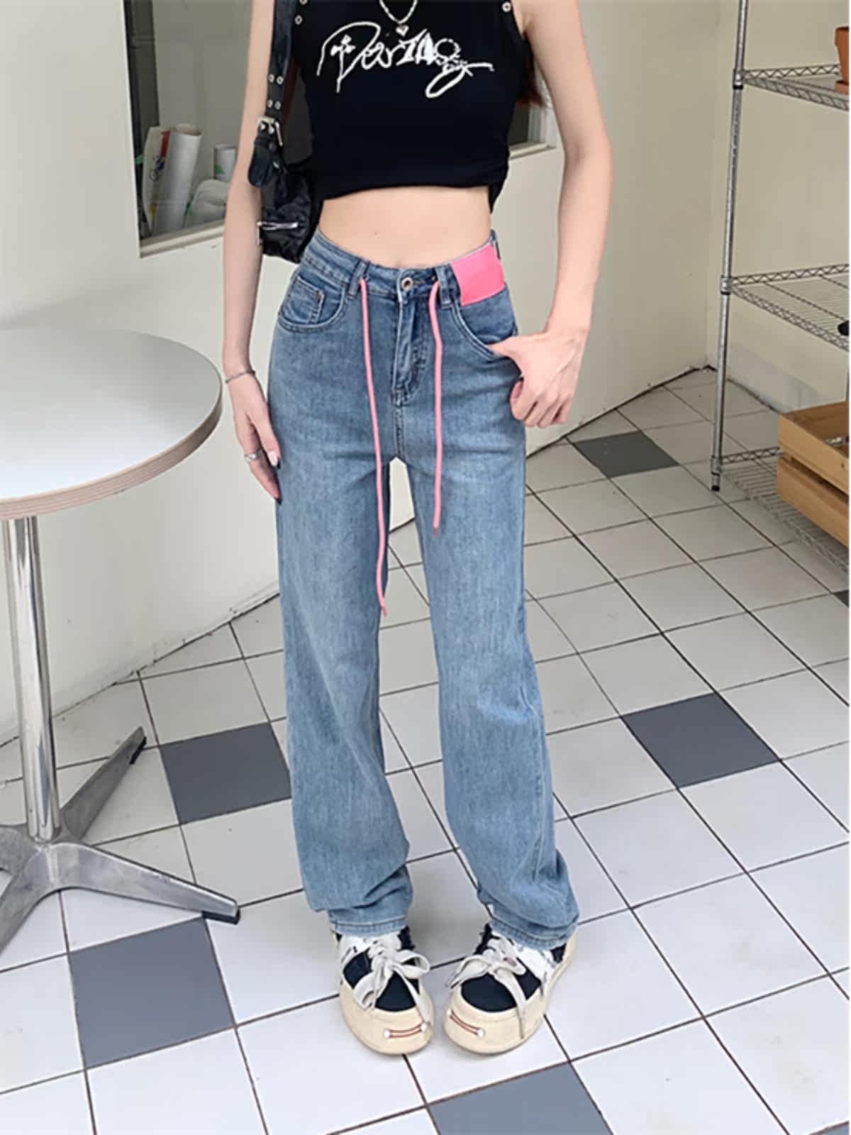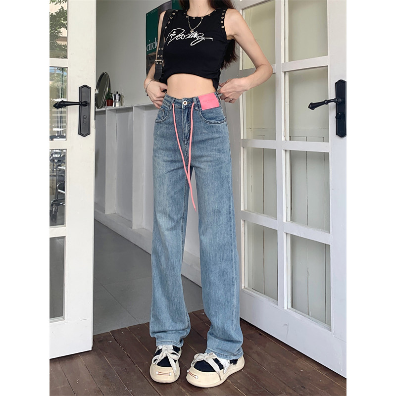 Летние прямые свободные джинсы, штаны, дизайнерские повседневные брюки, на шнурках, свободный прямой крой, в корейском стиле, высокая талия, тренд сезона