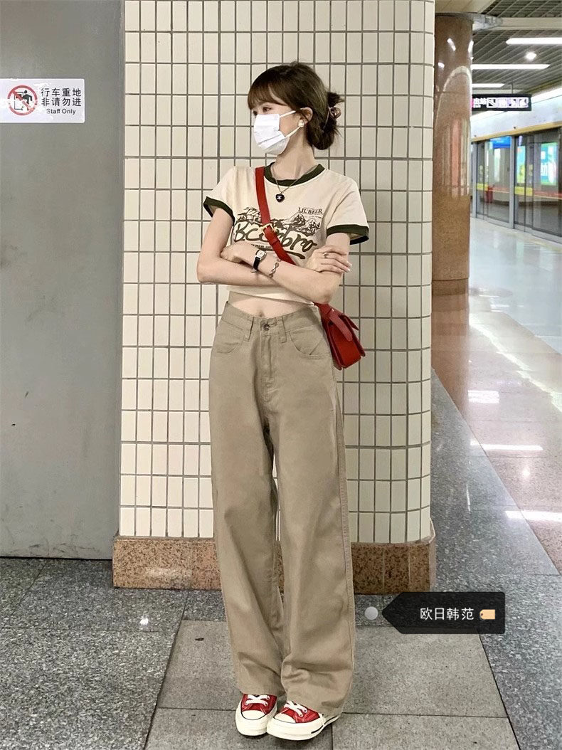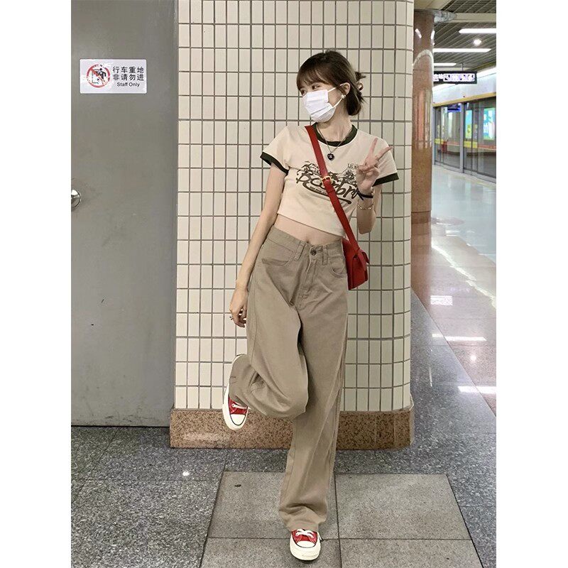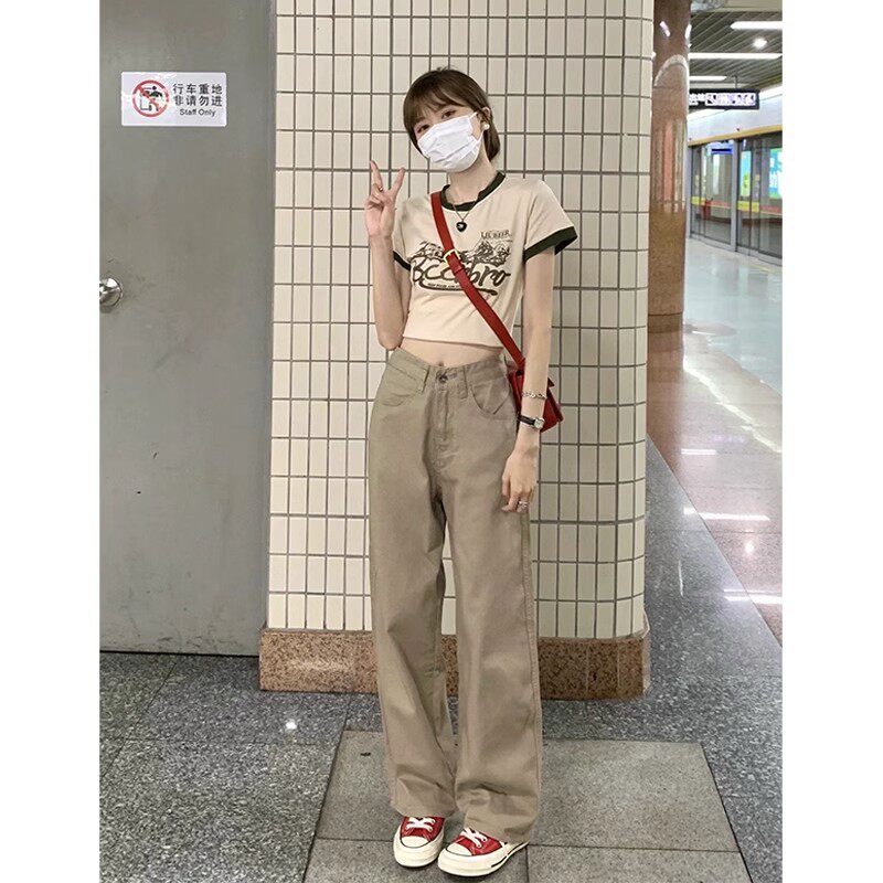 Хаки цветные осенние прямые свободные джинсы, штаны, леггинсы, большой размер, в американском стиле, высокая талия, оверсайз, свободный крой