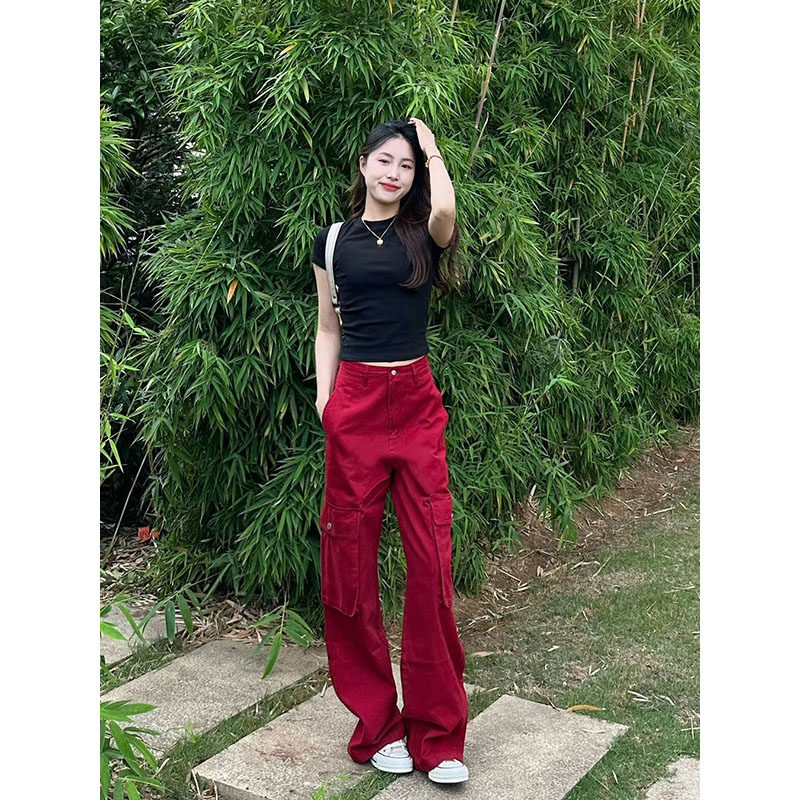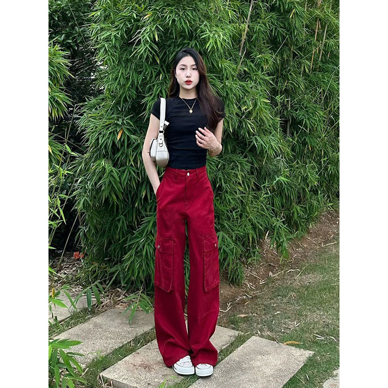 Ретро красные осенние джинсы, демисезонные длинные штаны, в американском стиле, свободный крой