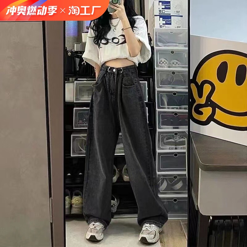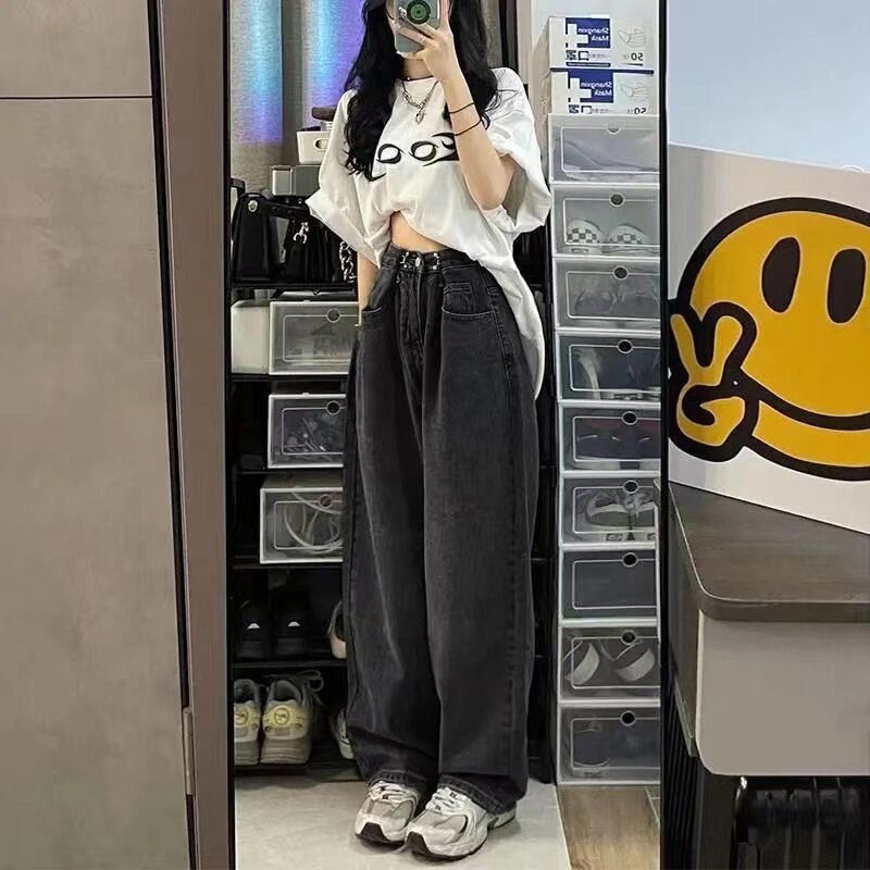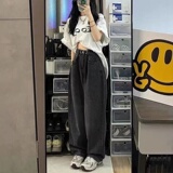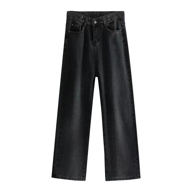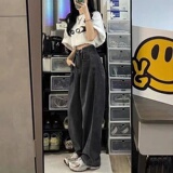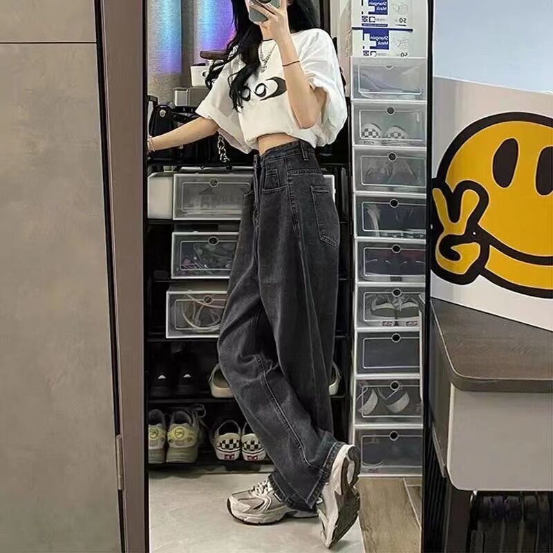 Джинсы, штаны, высокая талия, в корейском стиле, свободный прямой крой, по фигуре