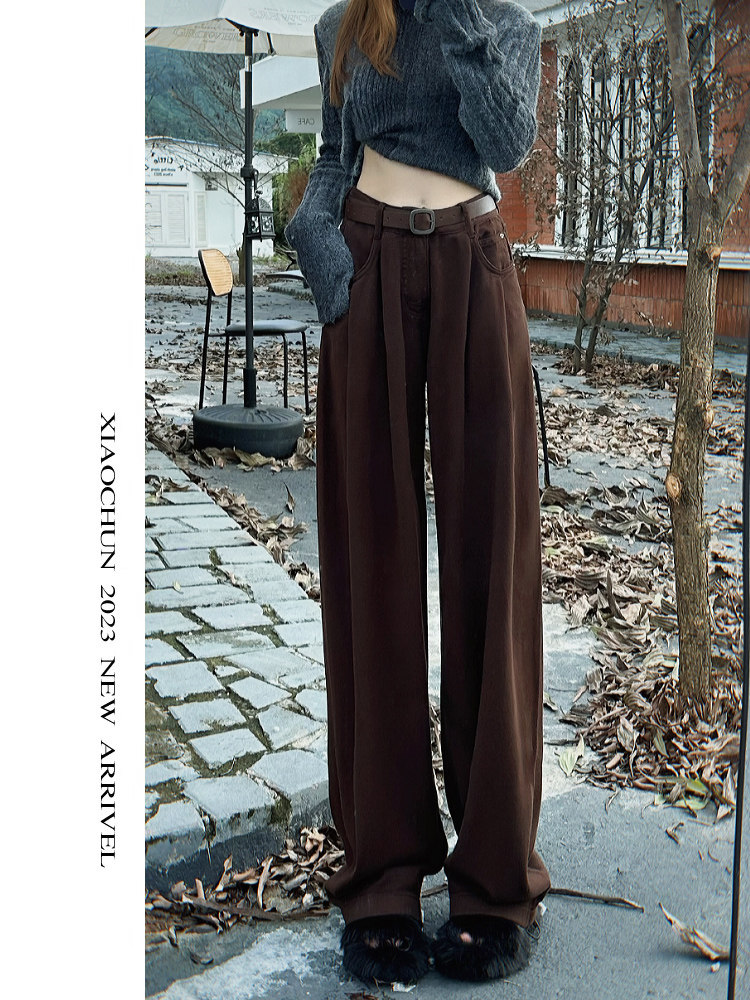 Кофейные утепленные джинсы, коричневые цветные приталенные штаны, свободный прямой крой