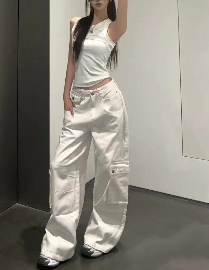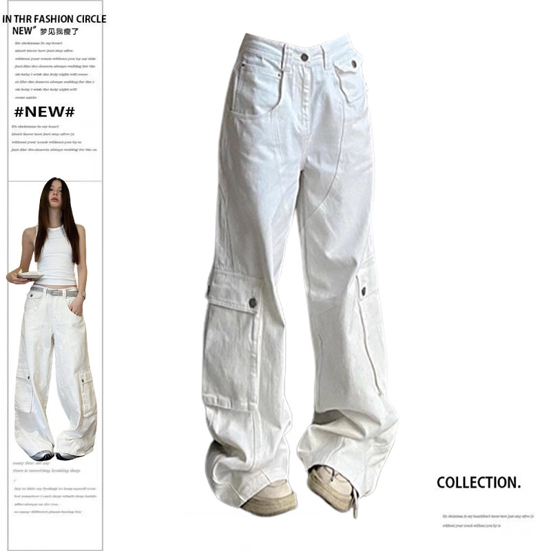 Дизайнерская белая униформа медсестры, осенние джинсы, штаны, леггинсы, большой размер, в американском стиле, высокая талия, свободный прямой крой, стройный силуэт