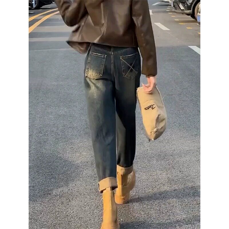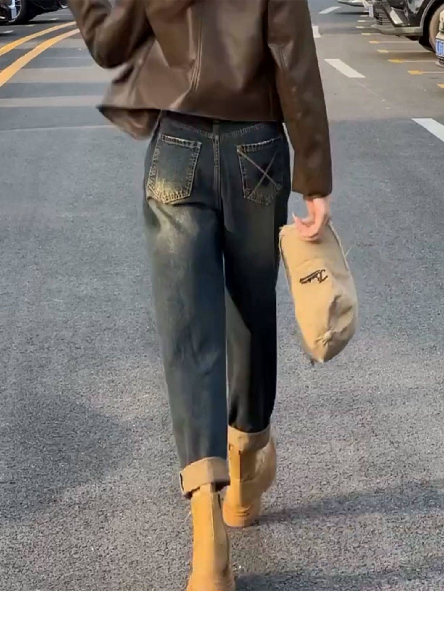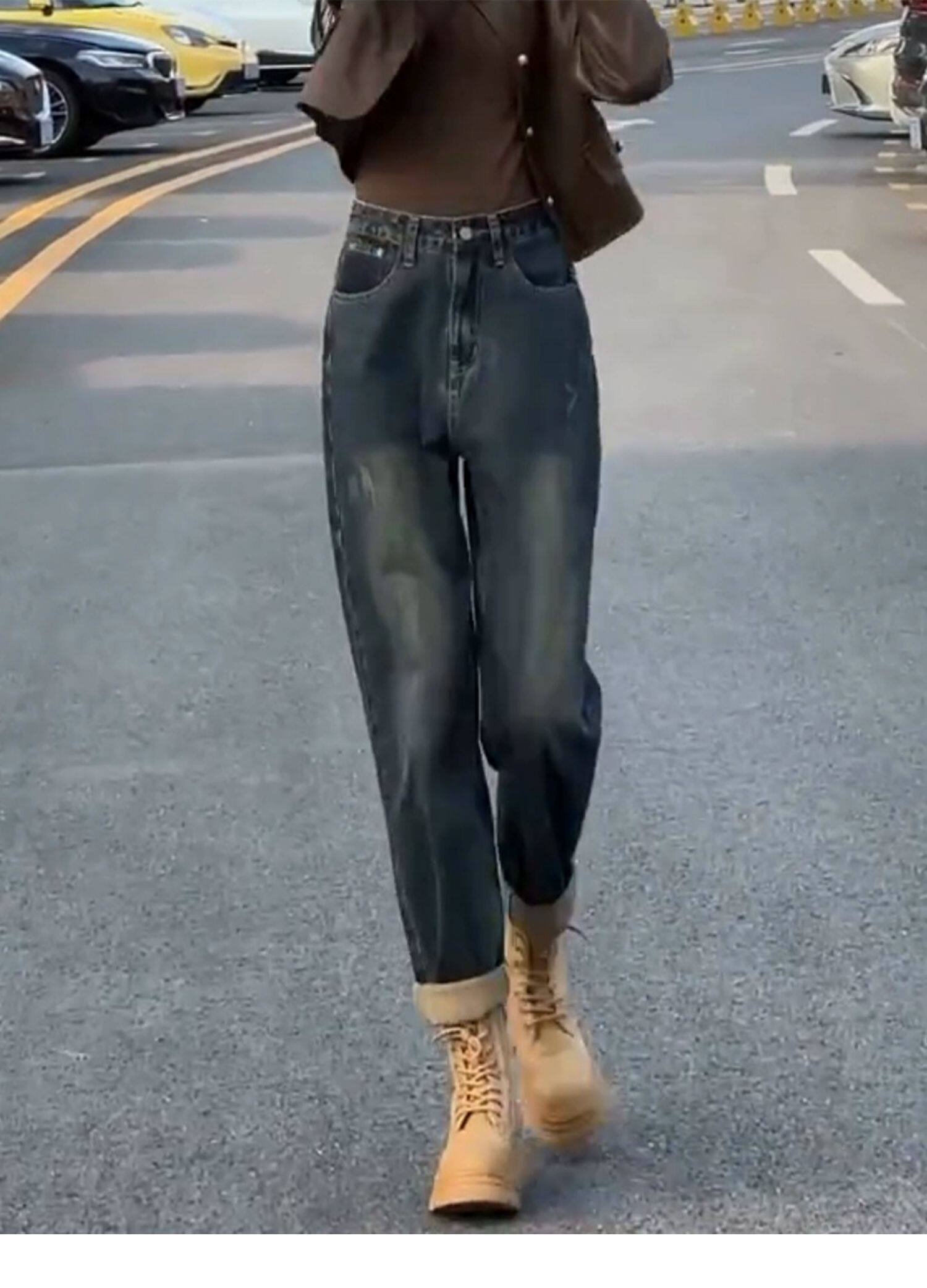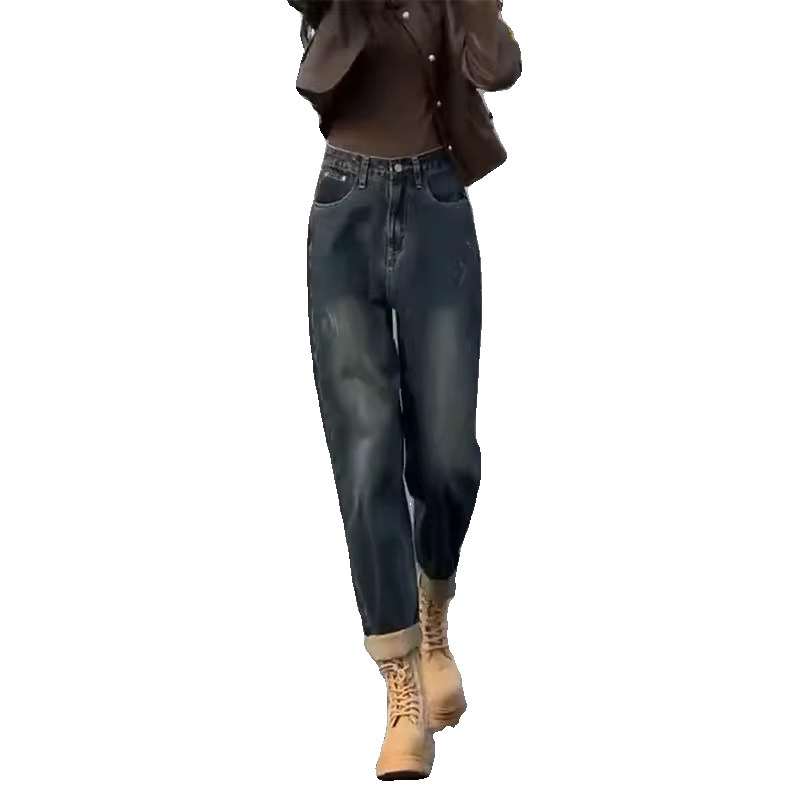 Штаны, осенние ретро джинсы, цвет, высокая талия, для формы тела «груша», свободный прямой крой, стройный силуэт