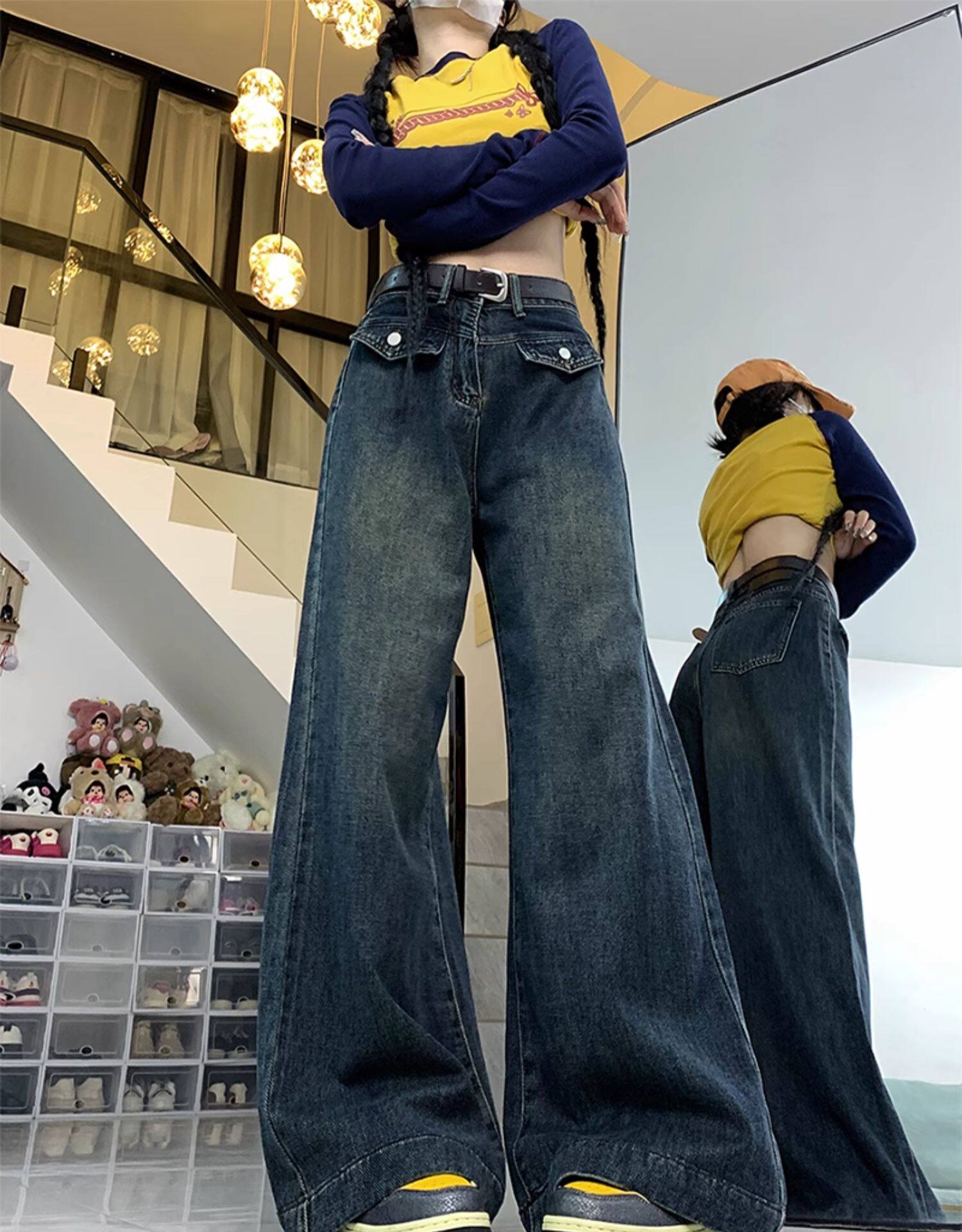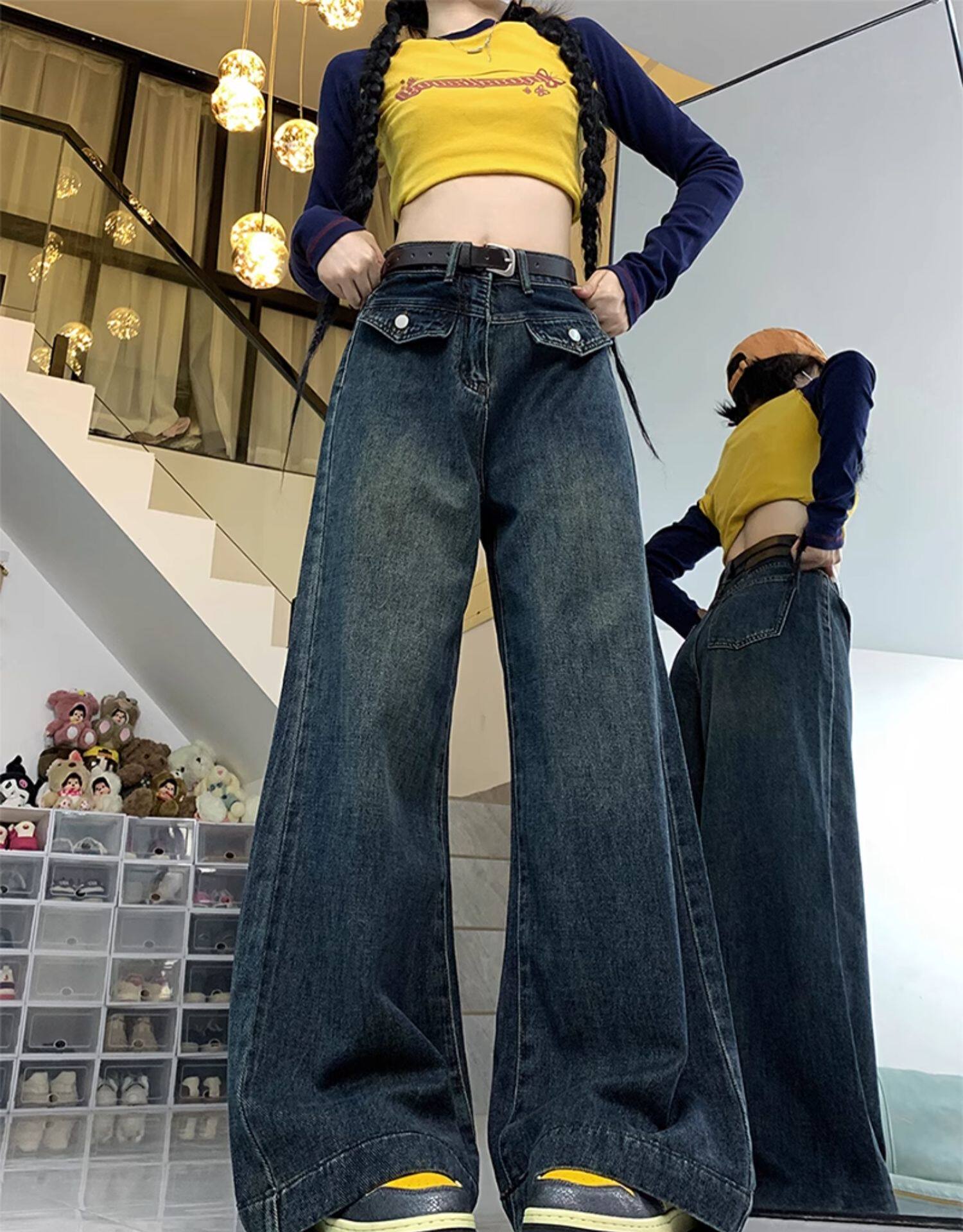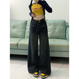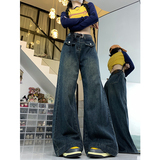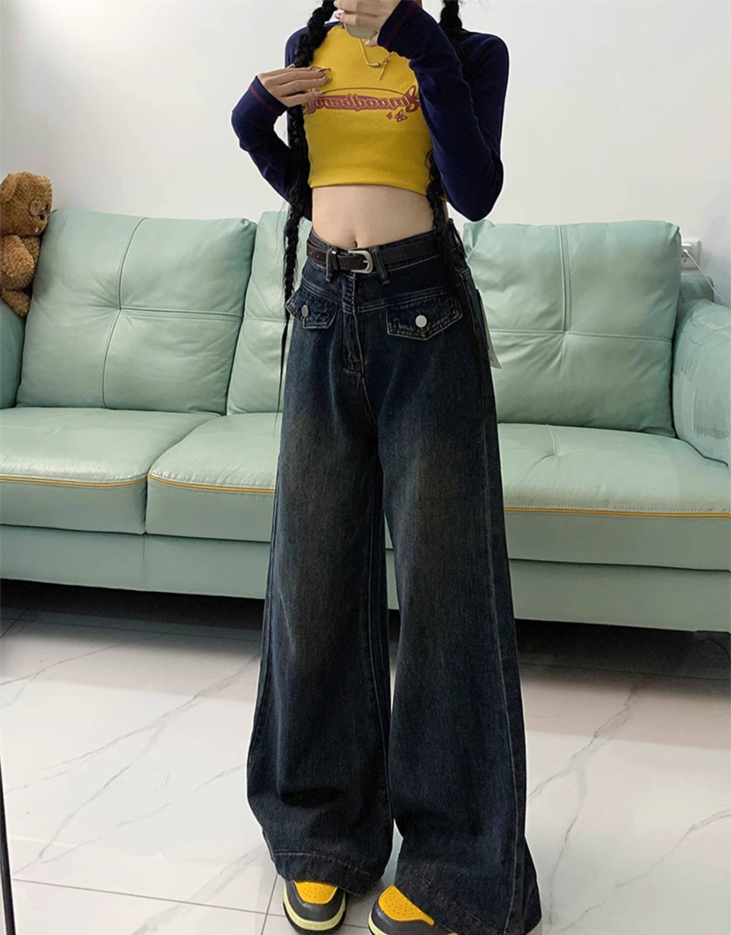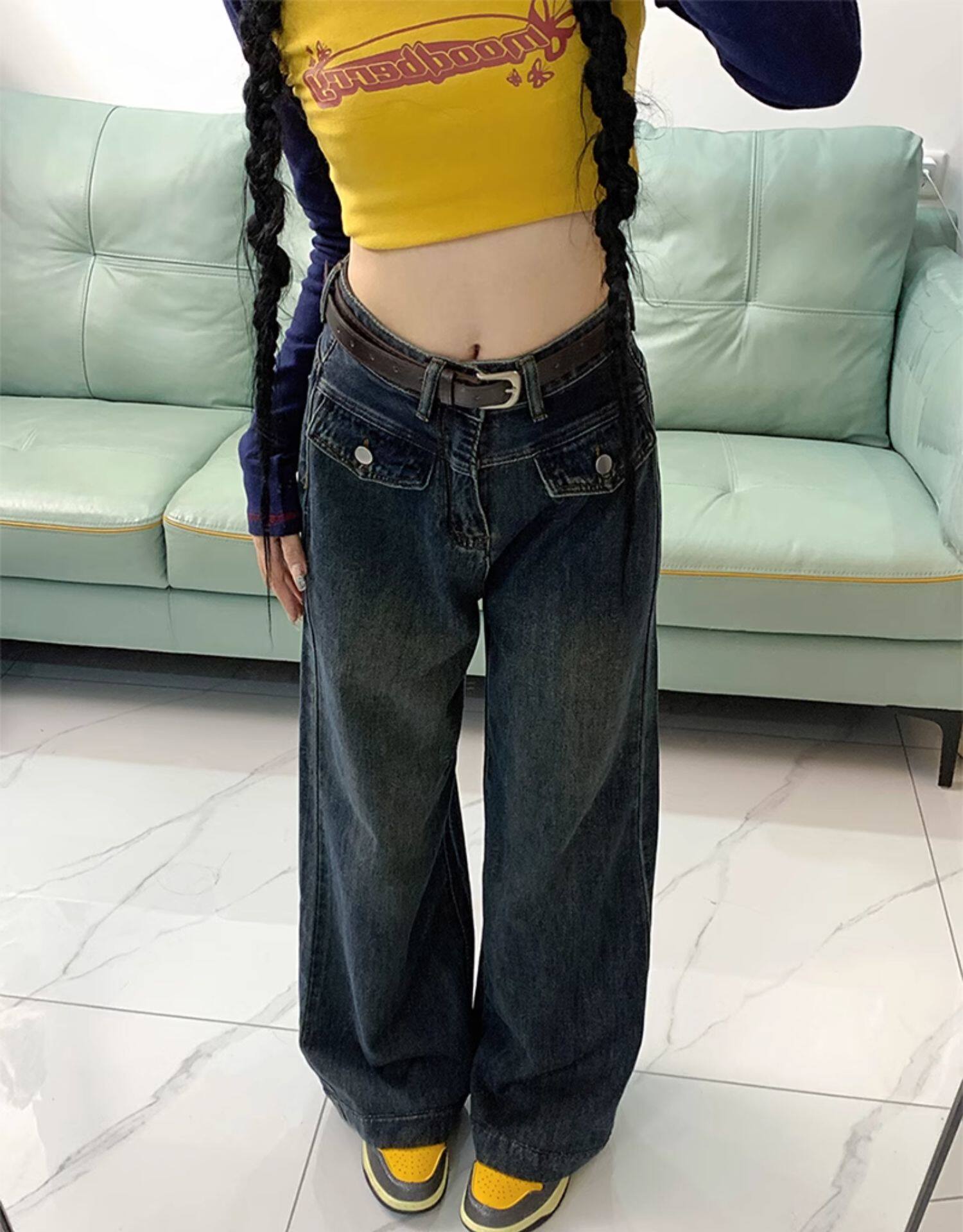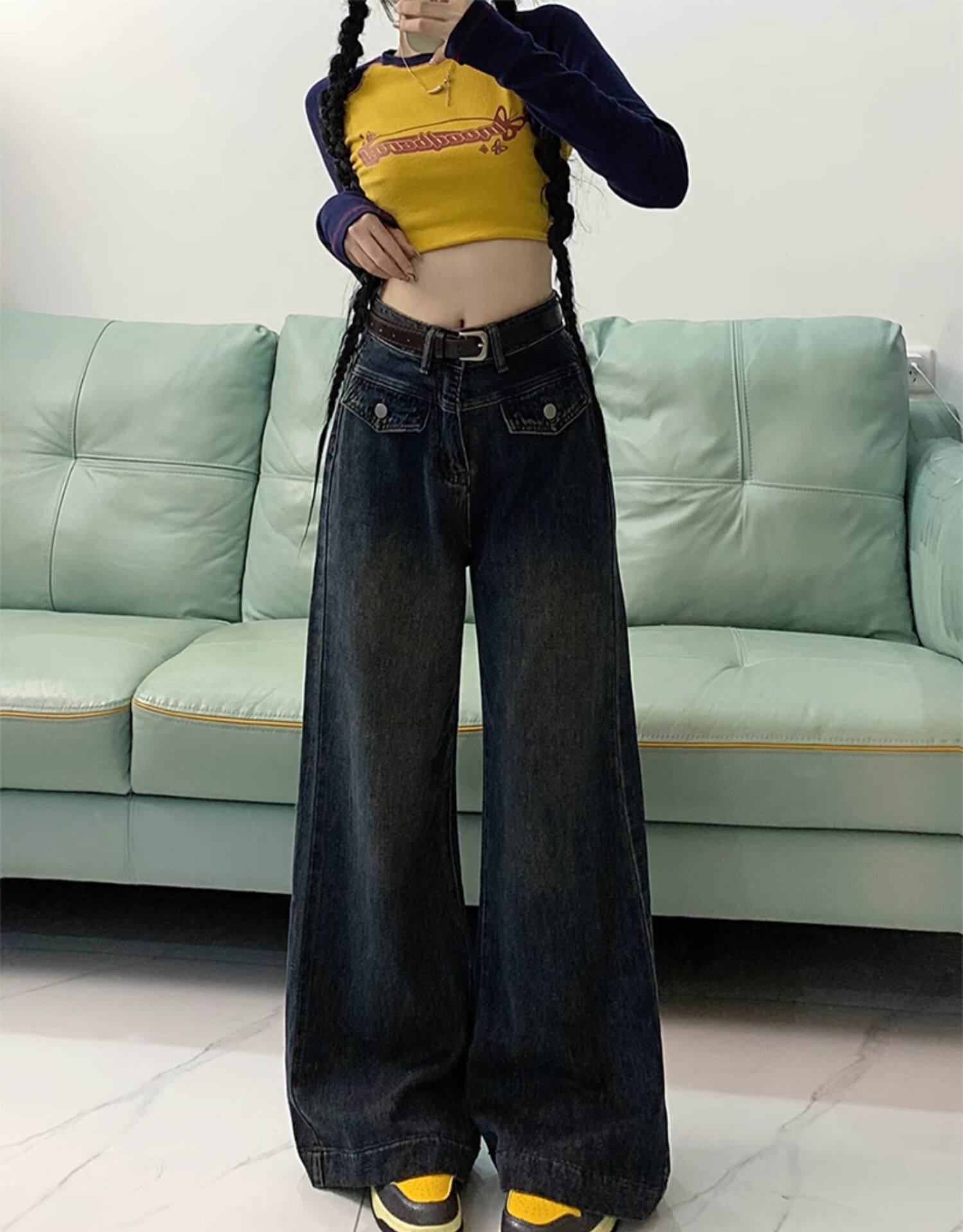 Джинсы, летние штаны, размер, в американском стиле, высокая талия, свободный прямой крой